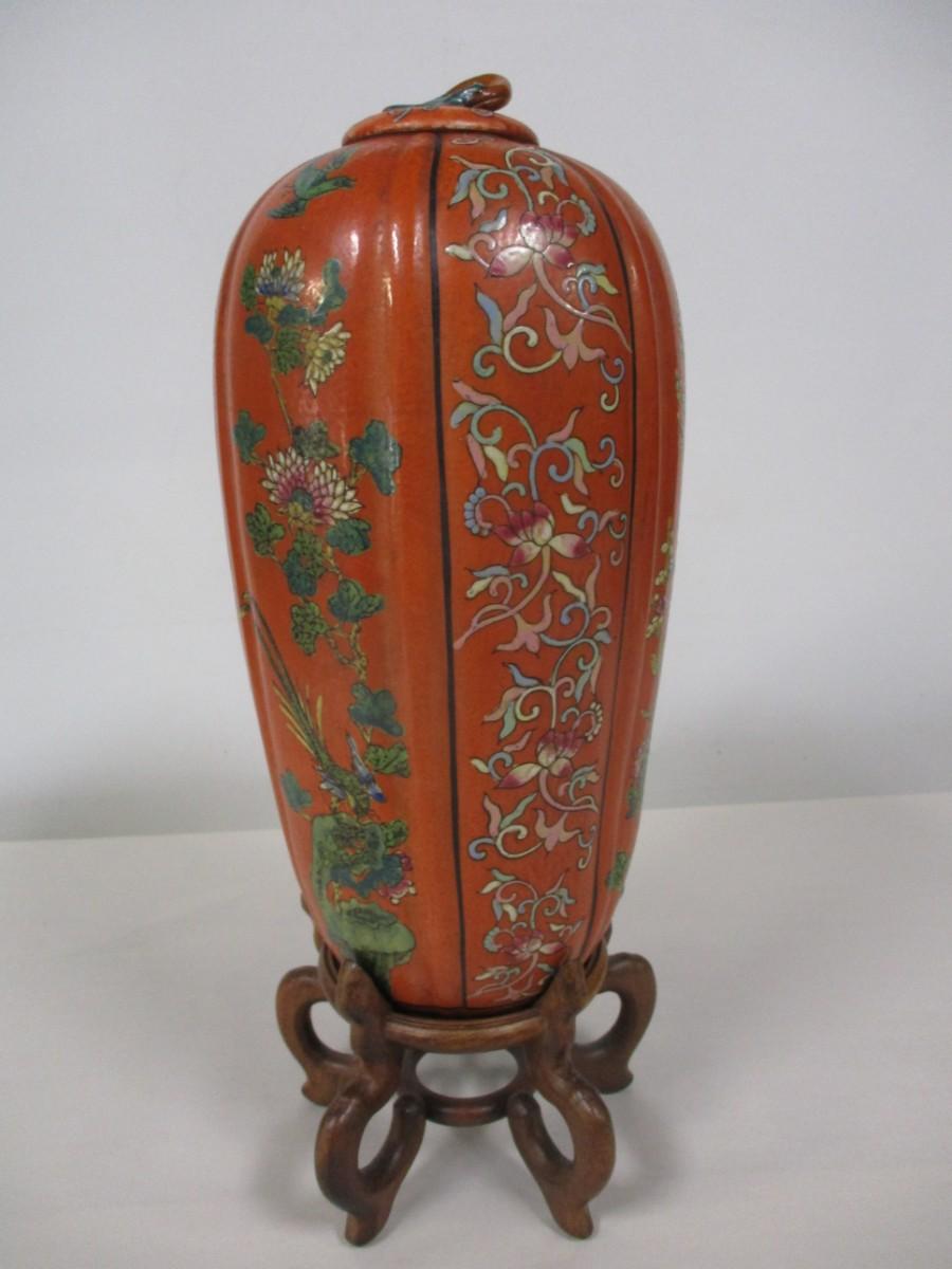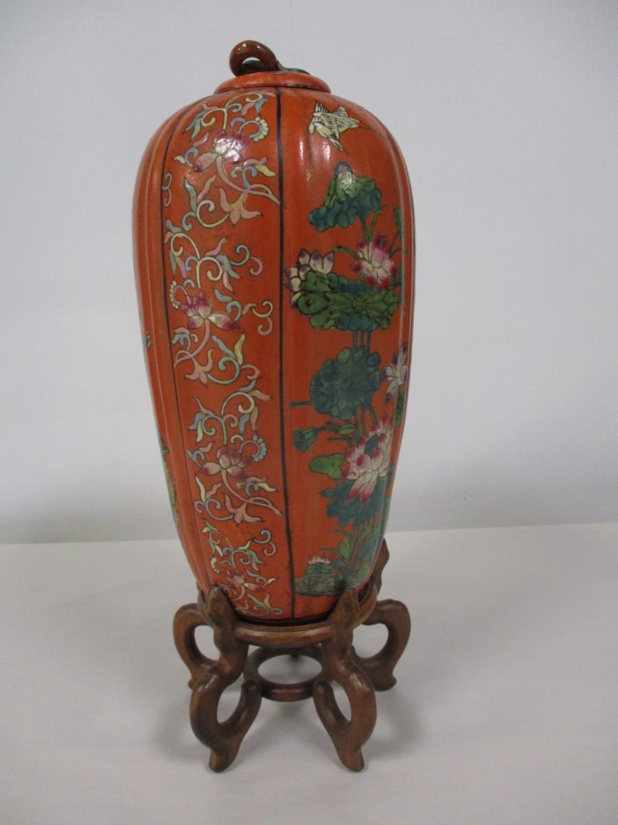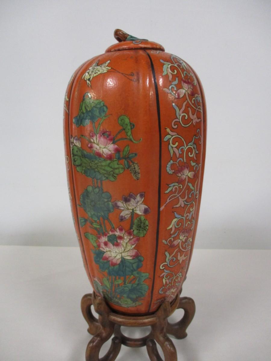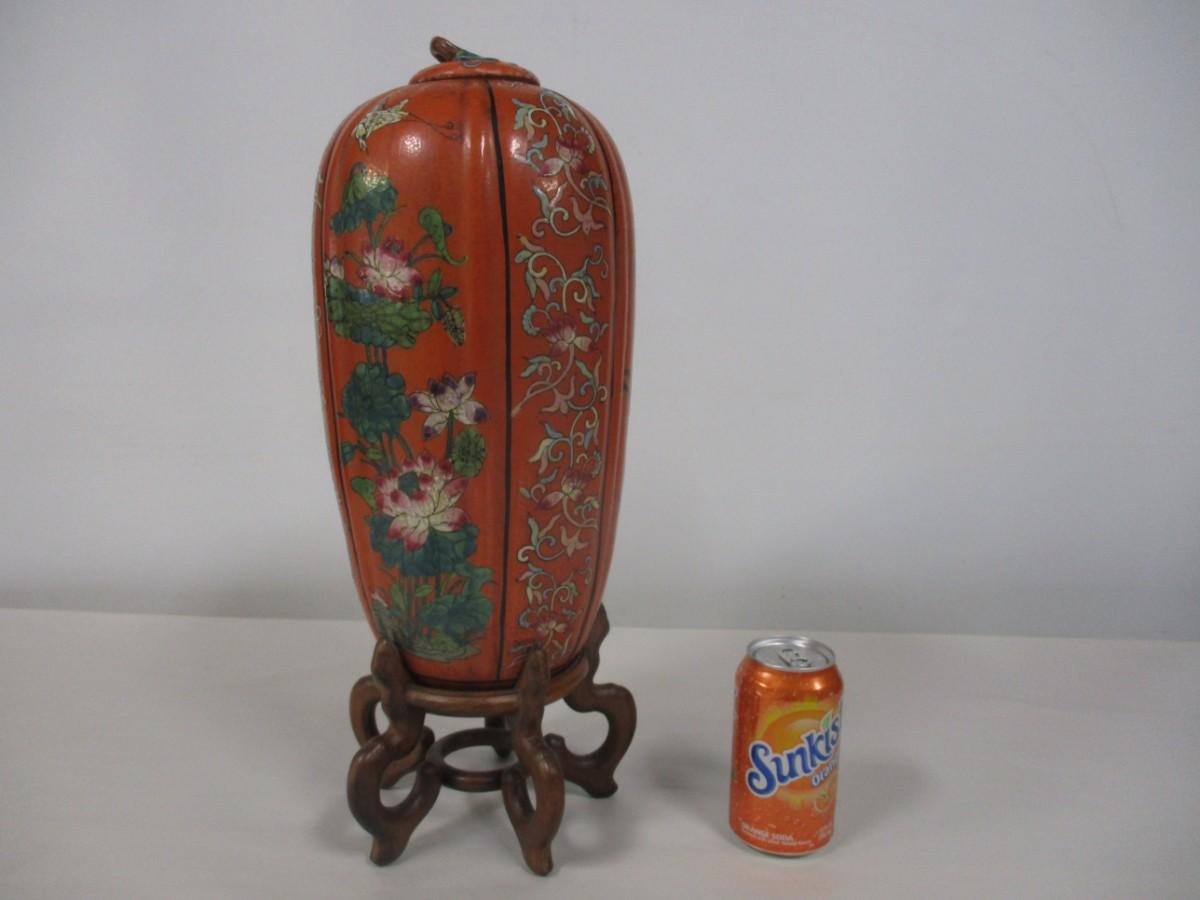 Oriental Melon Shaped Vase With Base & Lid
