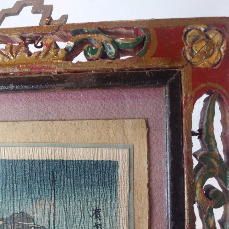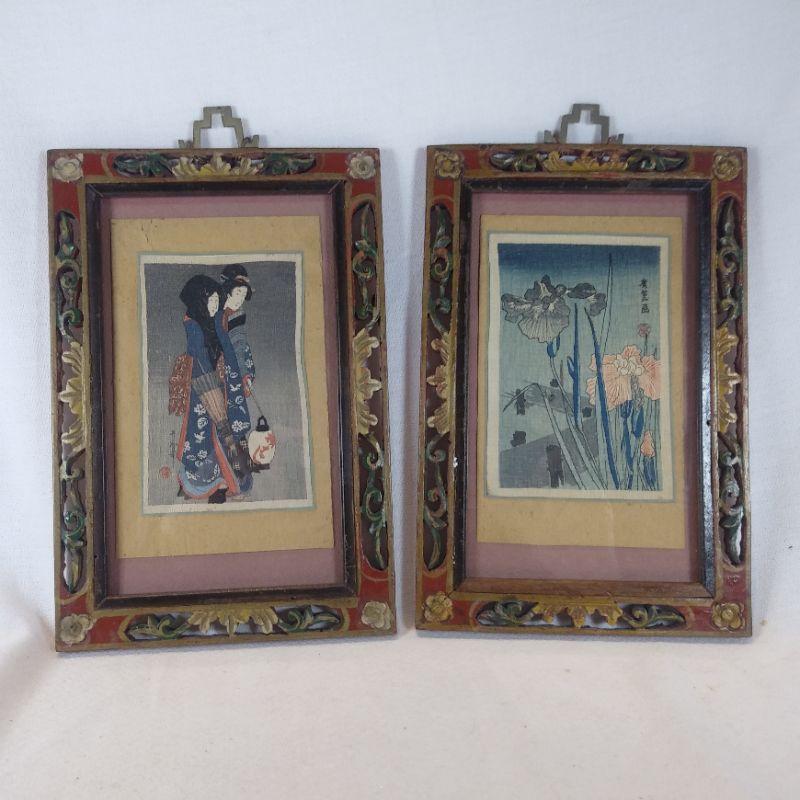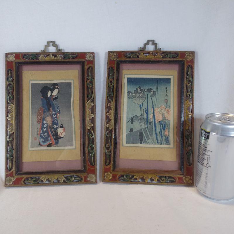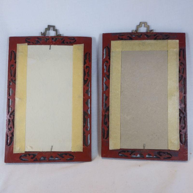 This offering is for a pair of the most amazing pieces of oriental art. The frames are solid wood, intricately hand-carved and hand-painted. The art looks to be original vintage paintings on silk. Just Beautiful They each measure 6-inches wide X 9-inches tall plus the hand cut brass hanger. Starting Bid/Reserve is $60.