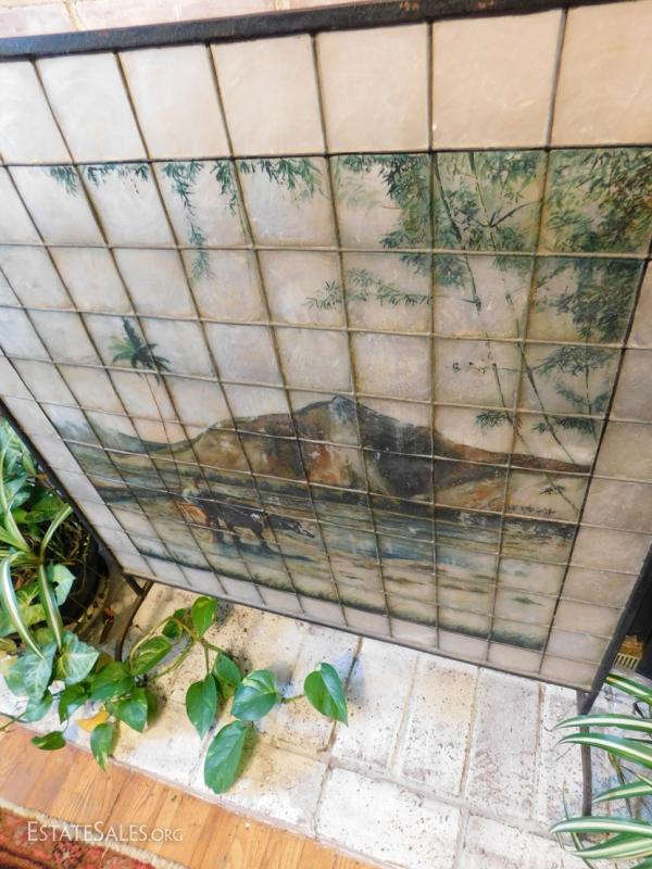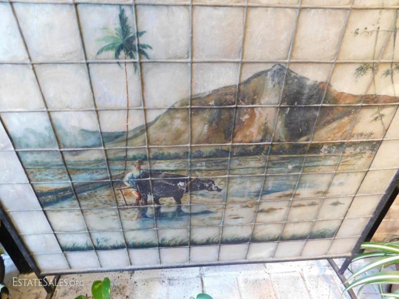 Metal framed oriental screen with painted shell inserts. Farmer and water buffalo. Very exotic and pristine piece. Came to the states from the Philippines circa 1928-1932. This is a very rare. piece. Reserve