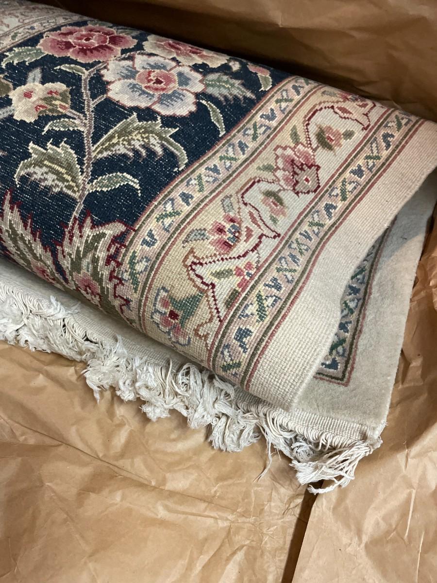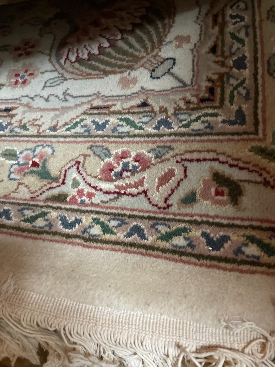 Oriental rug. 10'0" x 15'0" Approx. Modern, Chinese. Beige background, black border. 100% wool, hand woven, hand knotted.