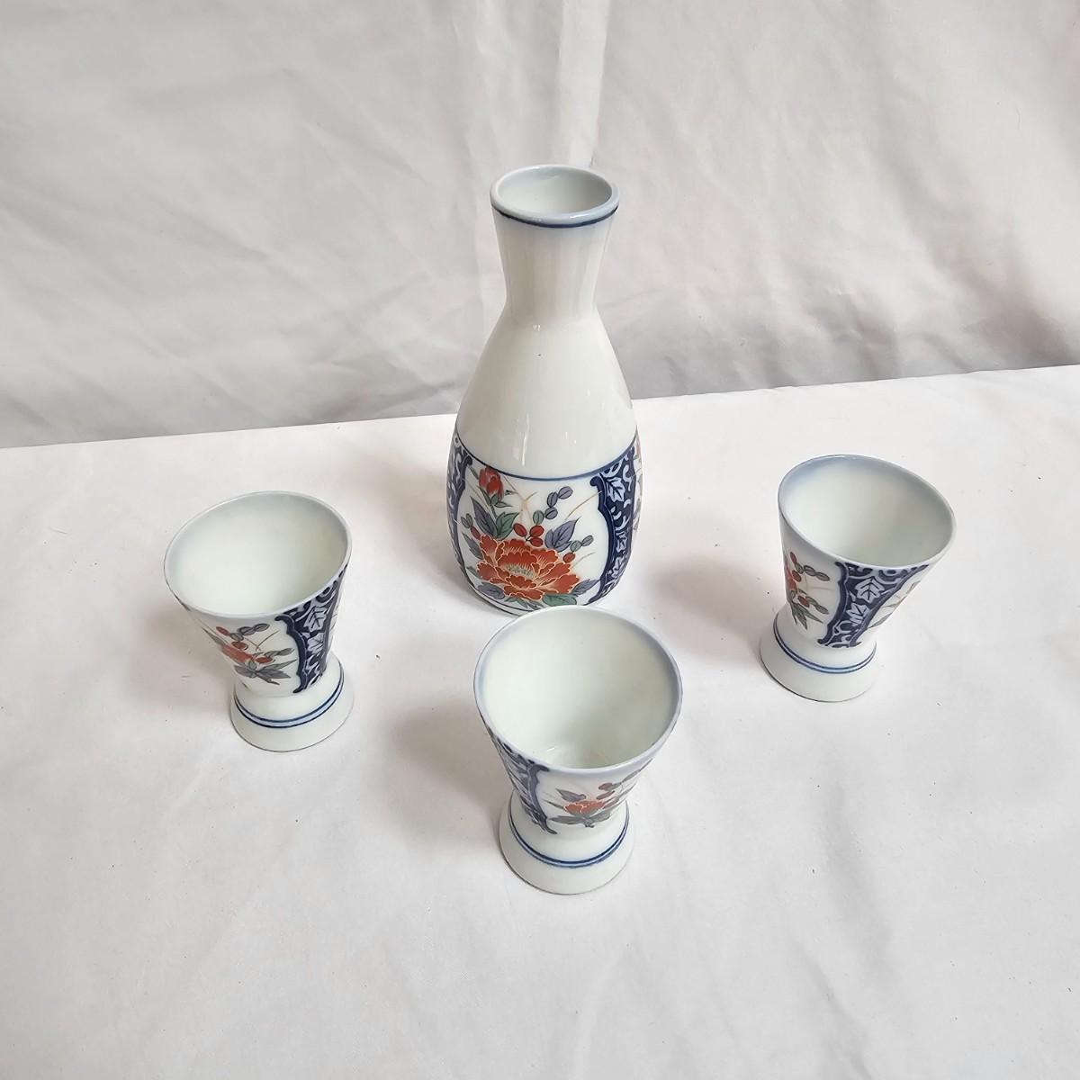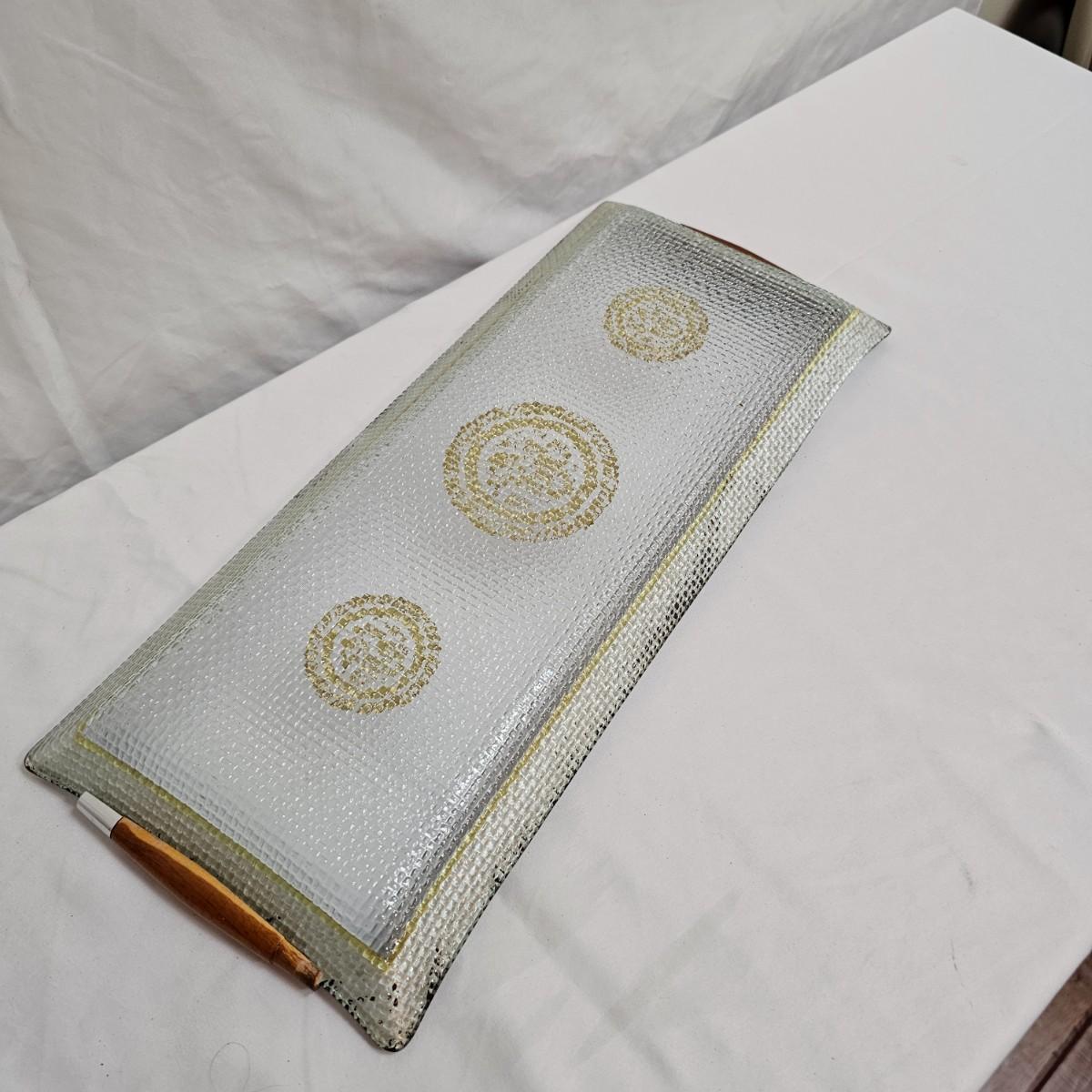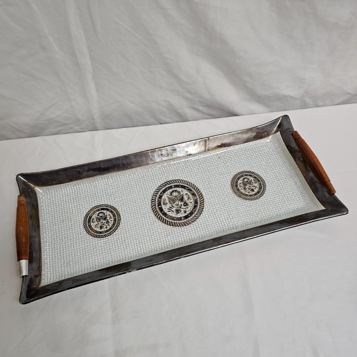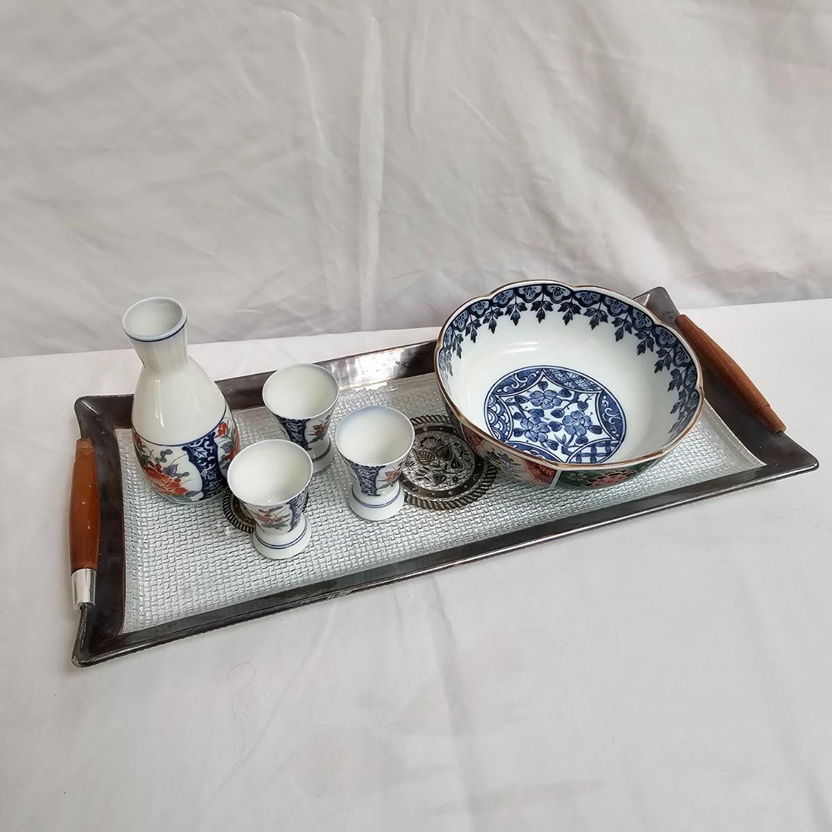 Lot features an MCM Georges Briard stamped glass tray with wood handles. Fine porcelain sake bottle and three cups, all decorated with flowers and trellises. Sake bottle is 2.25"D x 5"H. Also includes a fluted top round bowl, 6.5"D x 2.75"H. Georges Briard tray measures 17" x 7". See photos for details. Shipping available.