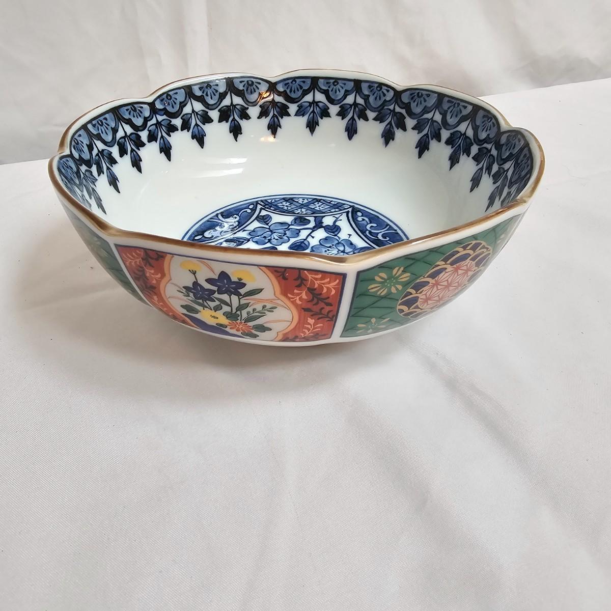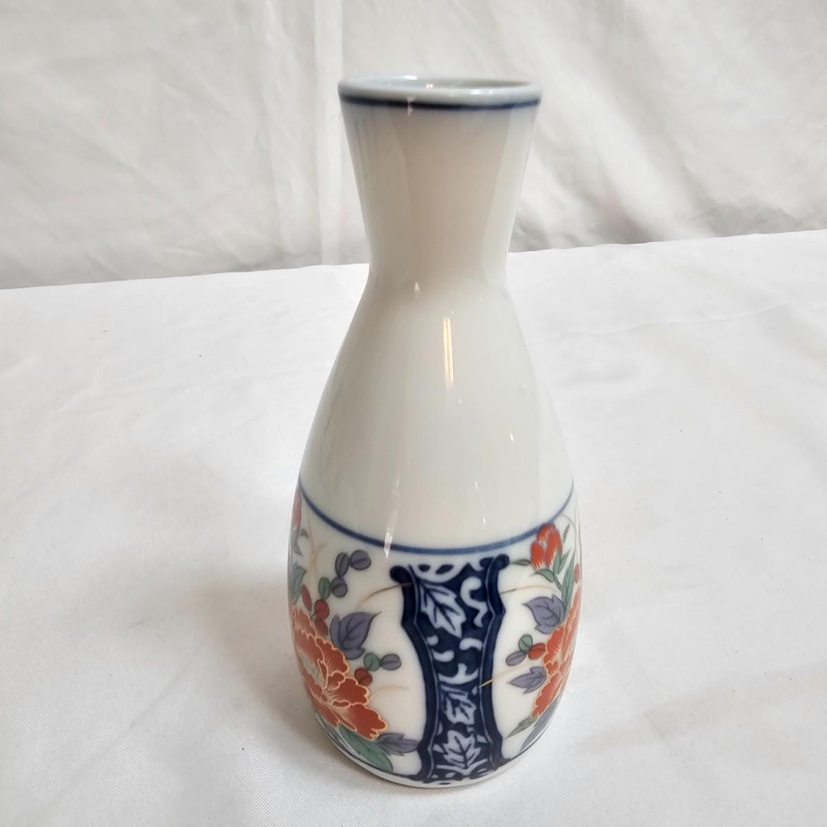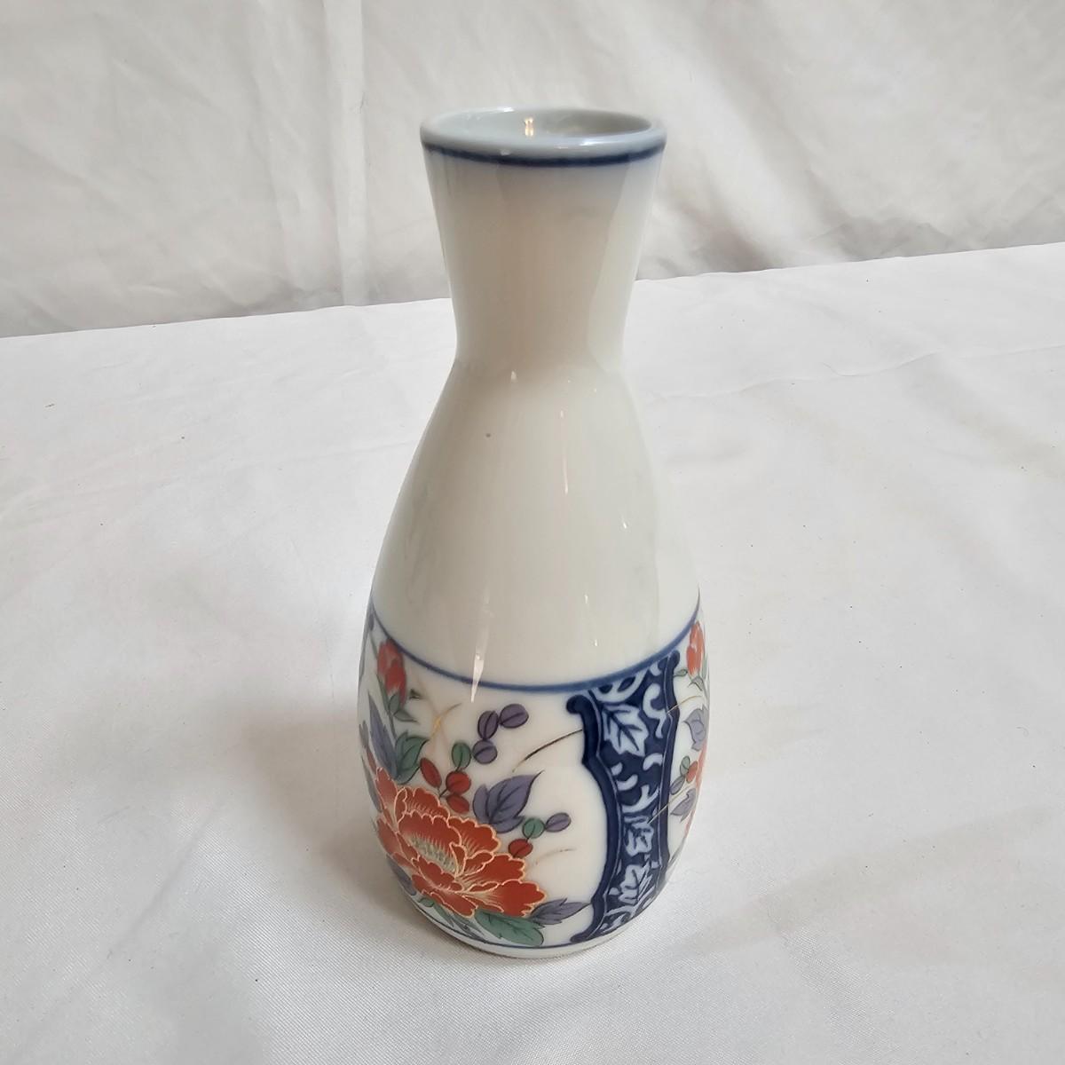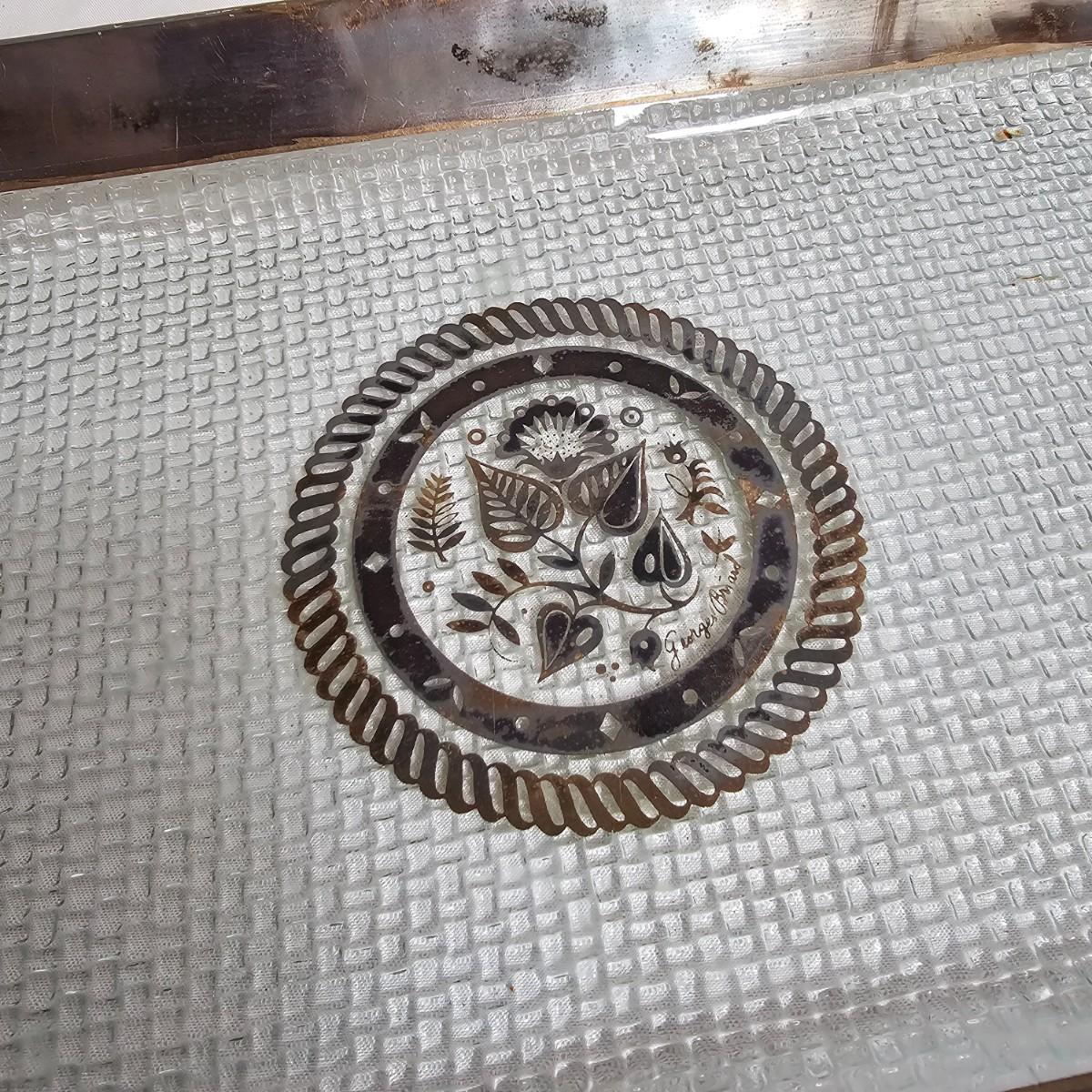 Lot features an MCM Georges Briard stamped glass tray with wood handles. Fine porcelain sake bottle and three cups, all decorated with flowers and trellises. Sake bottle is 2.25"D x 5"H. Also includes a fluted top round bowl, 6.5"D x 2.75"H. Georges Briard tray measures 17" x 7". See photos for details. Shipping available.