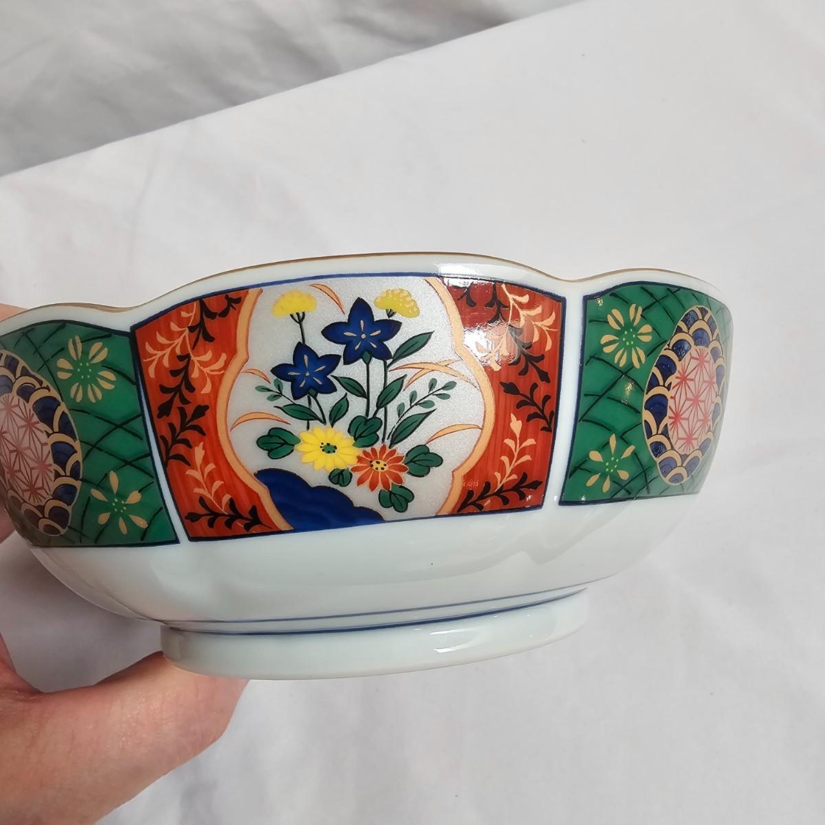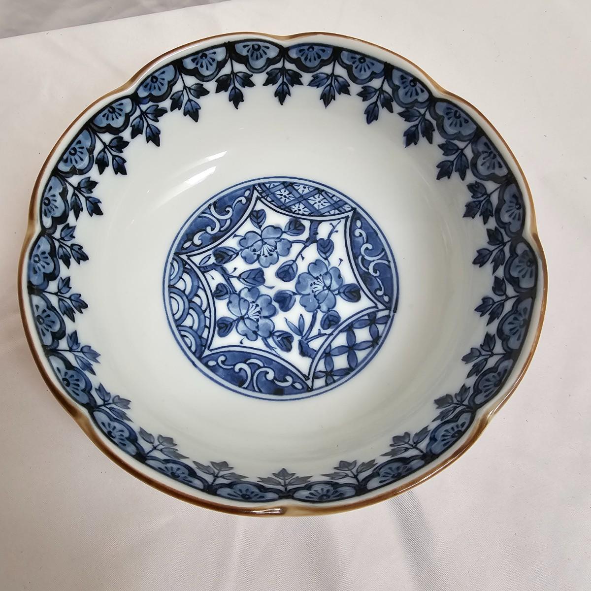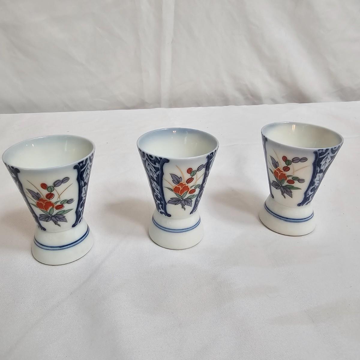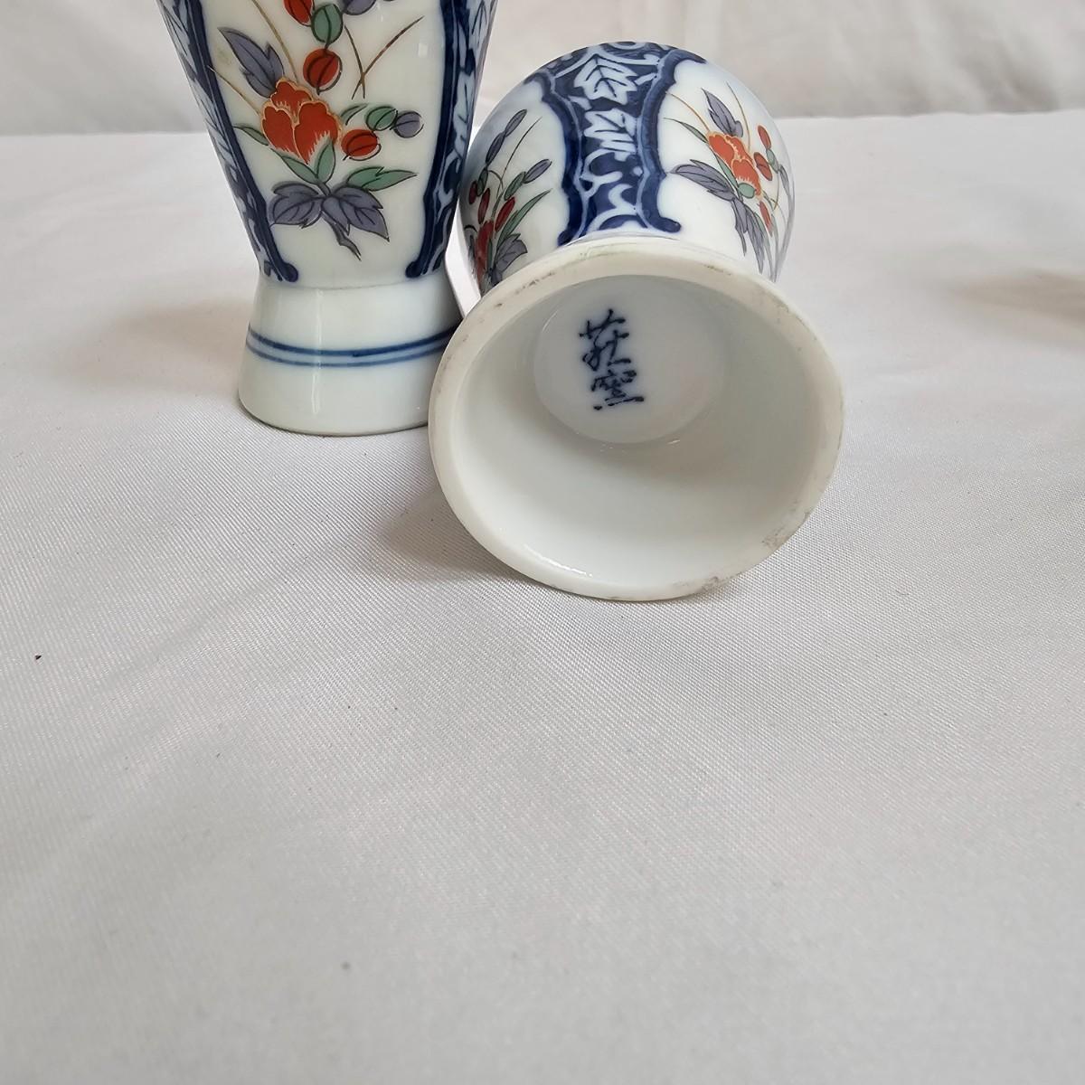 Lot features an MCM Georges Briard stamped glass tray with wood handles. Fine porcelain sake bottle and three cups, all decorated with flowers and trellises. Sake bottle is 2.25"D x 5"H. Also includes a fluted top round bowl, 6.5"D x 2.75"H. Georges Briard tray measures 17" x 7". See photos for details. Shipping available.