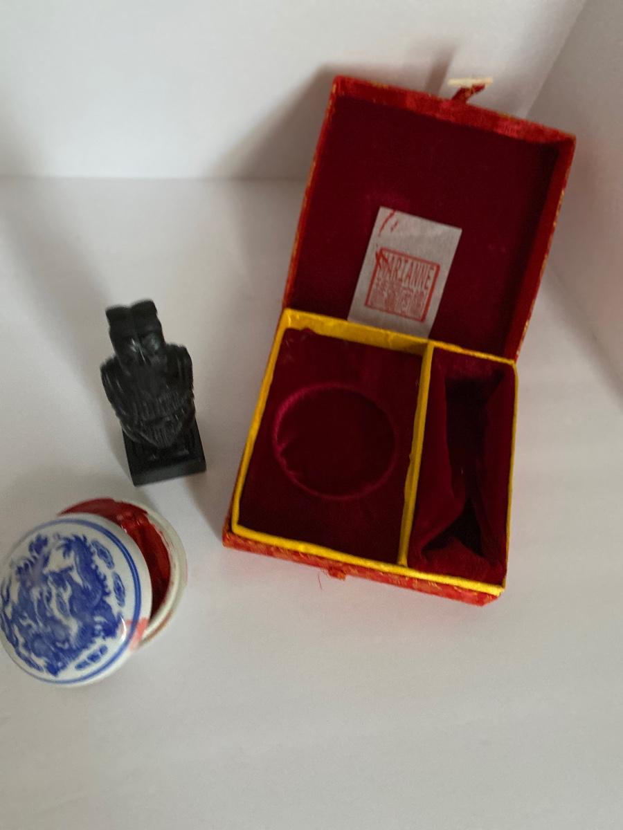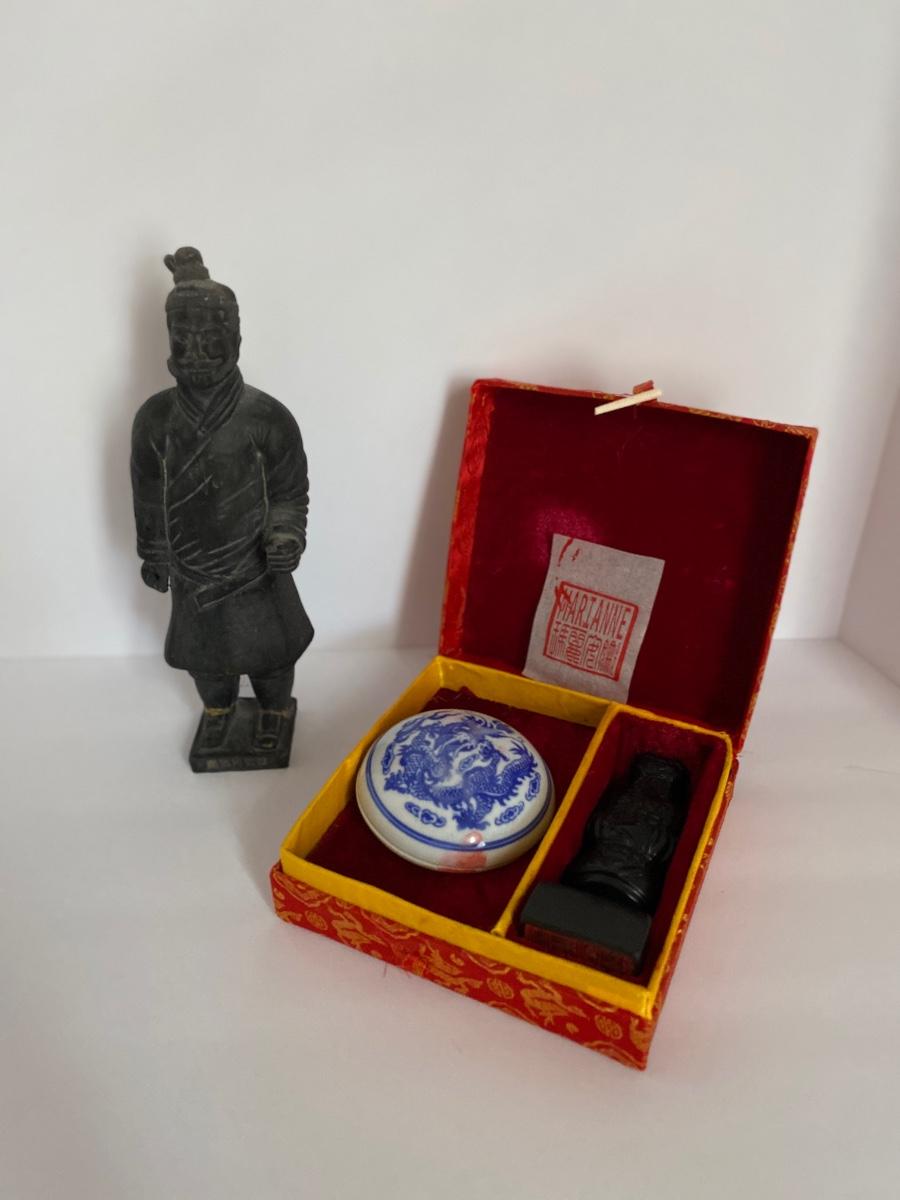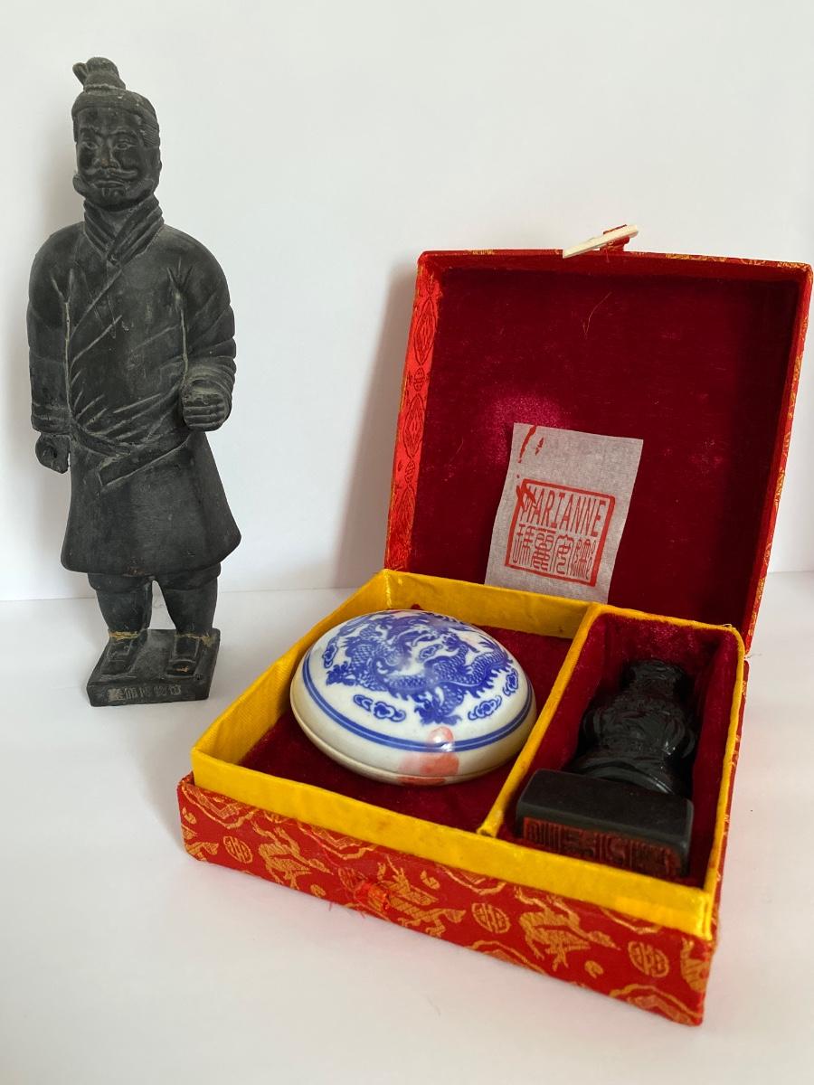 Chinese Stamp Kit & Asian Warrior Statue lot