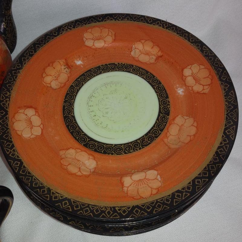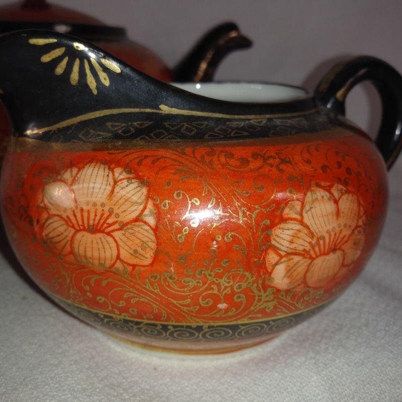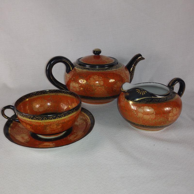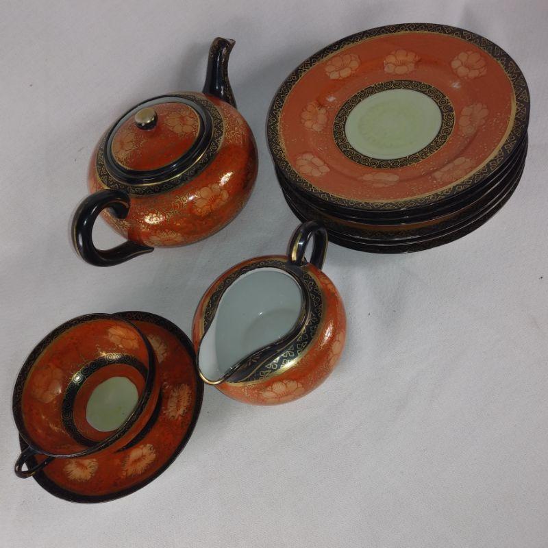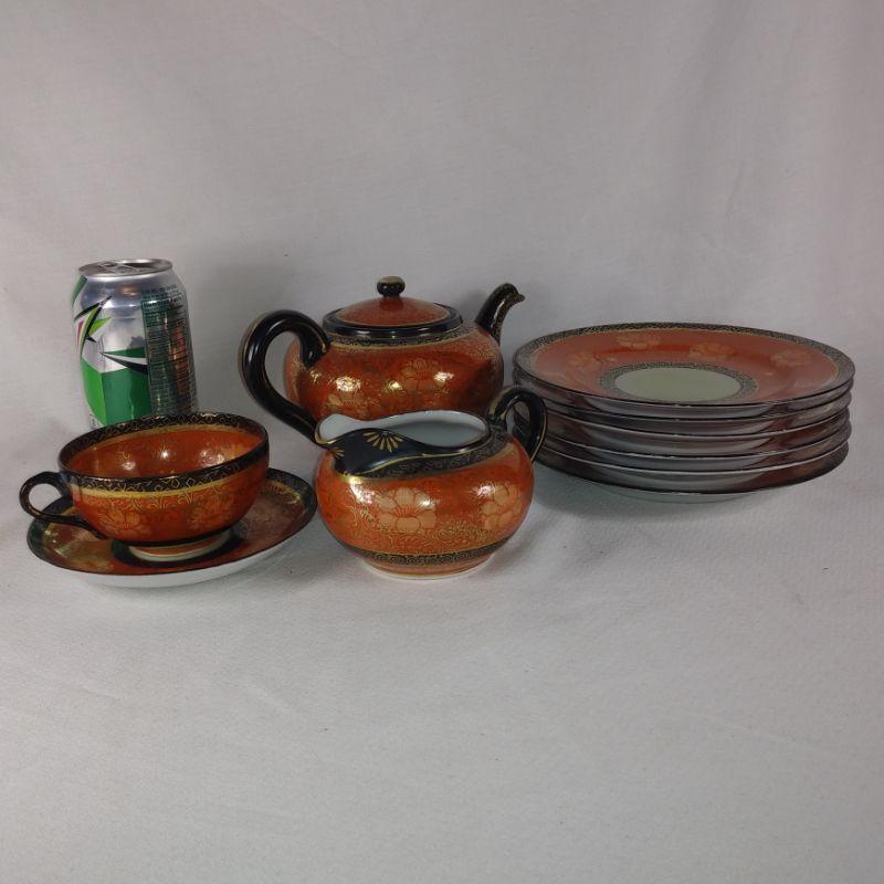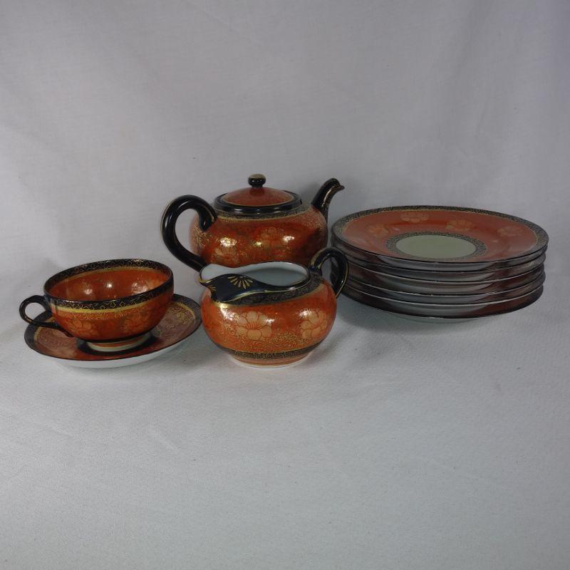 This is a very ornate oriental tea and lunch set. It is an incomplete set of 10, but enough to enjoy. It has 6 lunch plates - 7-1/4-inches in diameter, Tea Pot with Lid, Cup with Saucer and a Creamer. The lunch plates show some wear in the orange banding. All other pieces are in very good condition. No chips or crack on any of them.