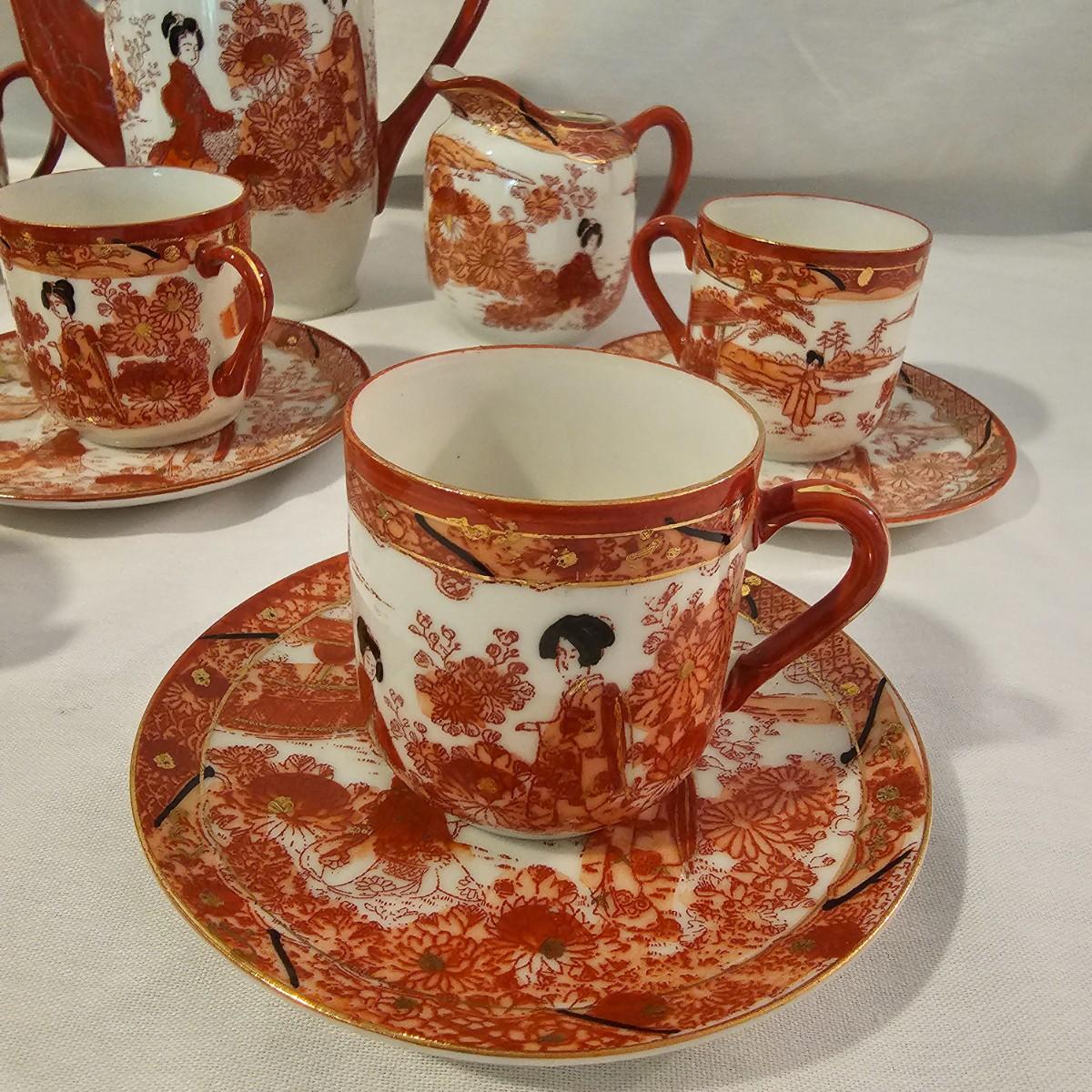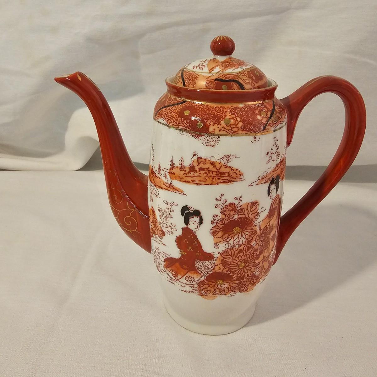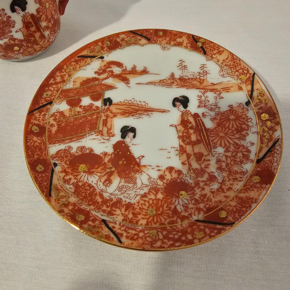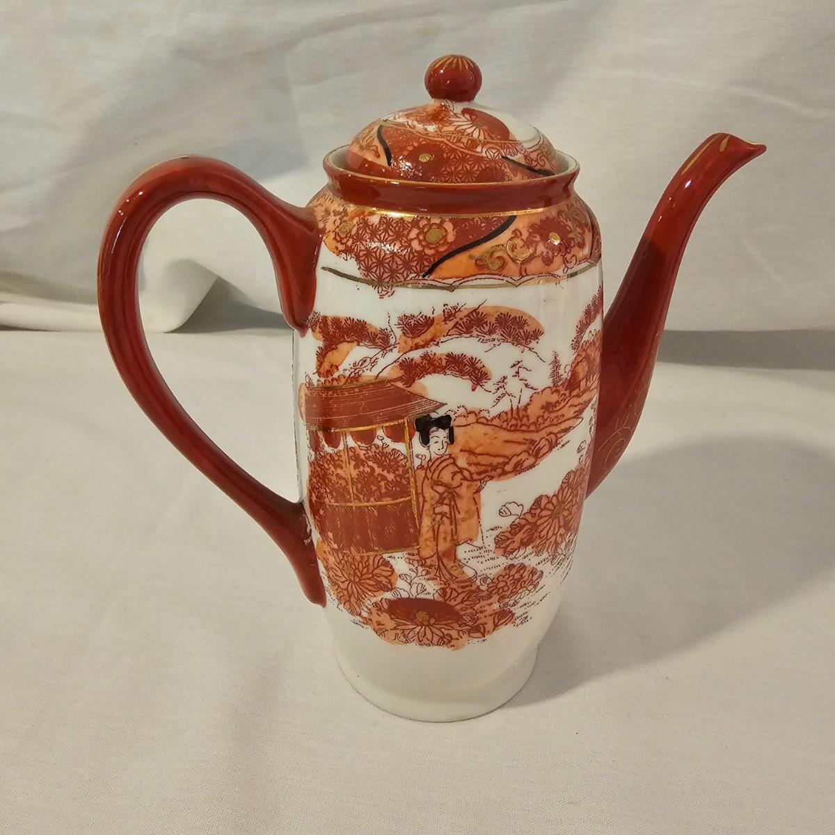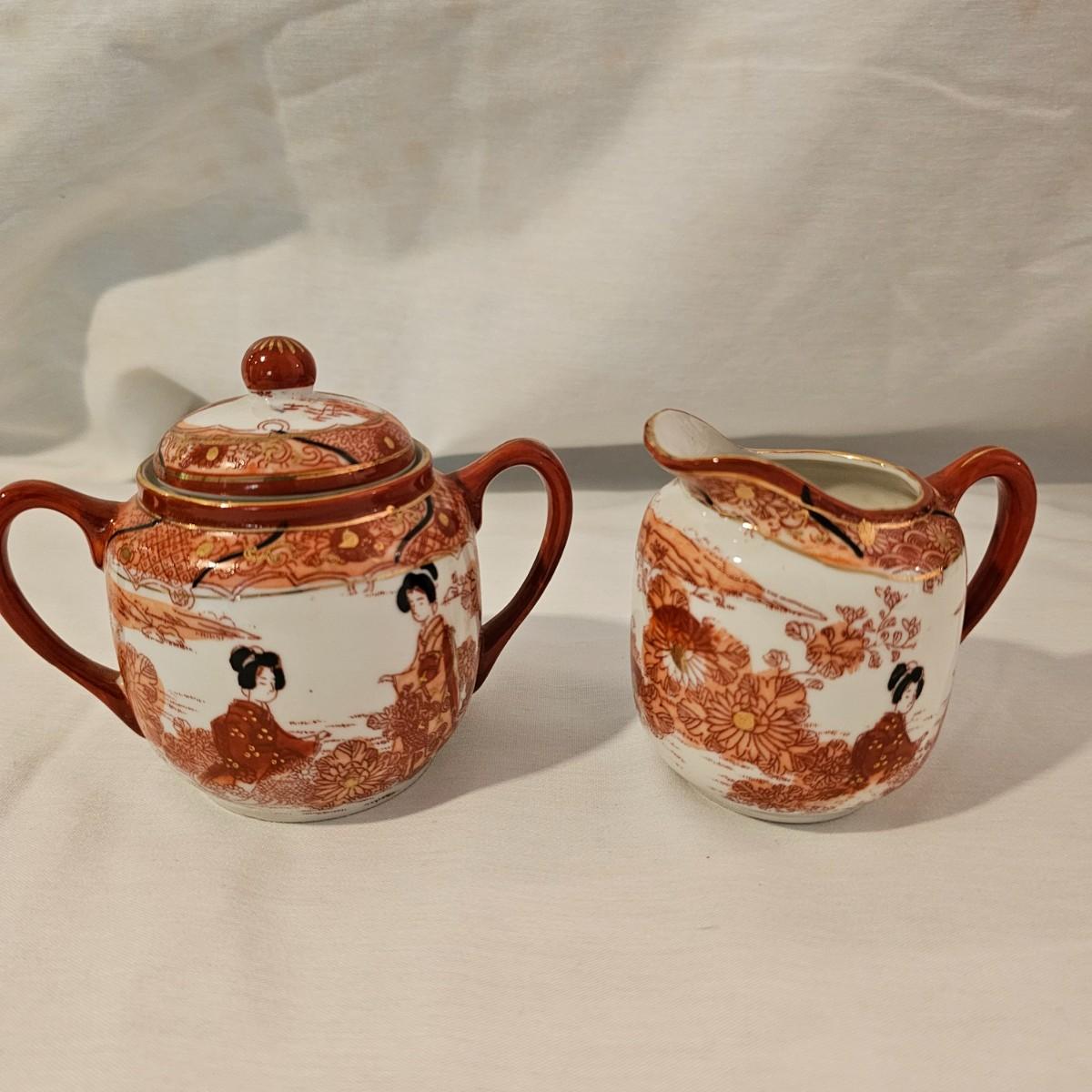 Oriental maids in brown and gold highlight the theme of this tea set. Tea pot with lid is 7"D x 7"H. Six cups & saucers, each 4.5"D x 2.25"H. Also a cream and sugar pair. All pieces have gold colored rims and decorations. Note one cup has small chips, see photos for details. Shipping available.
