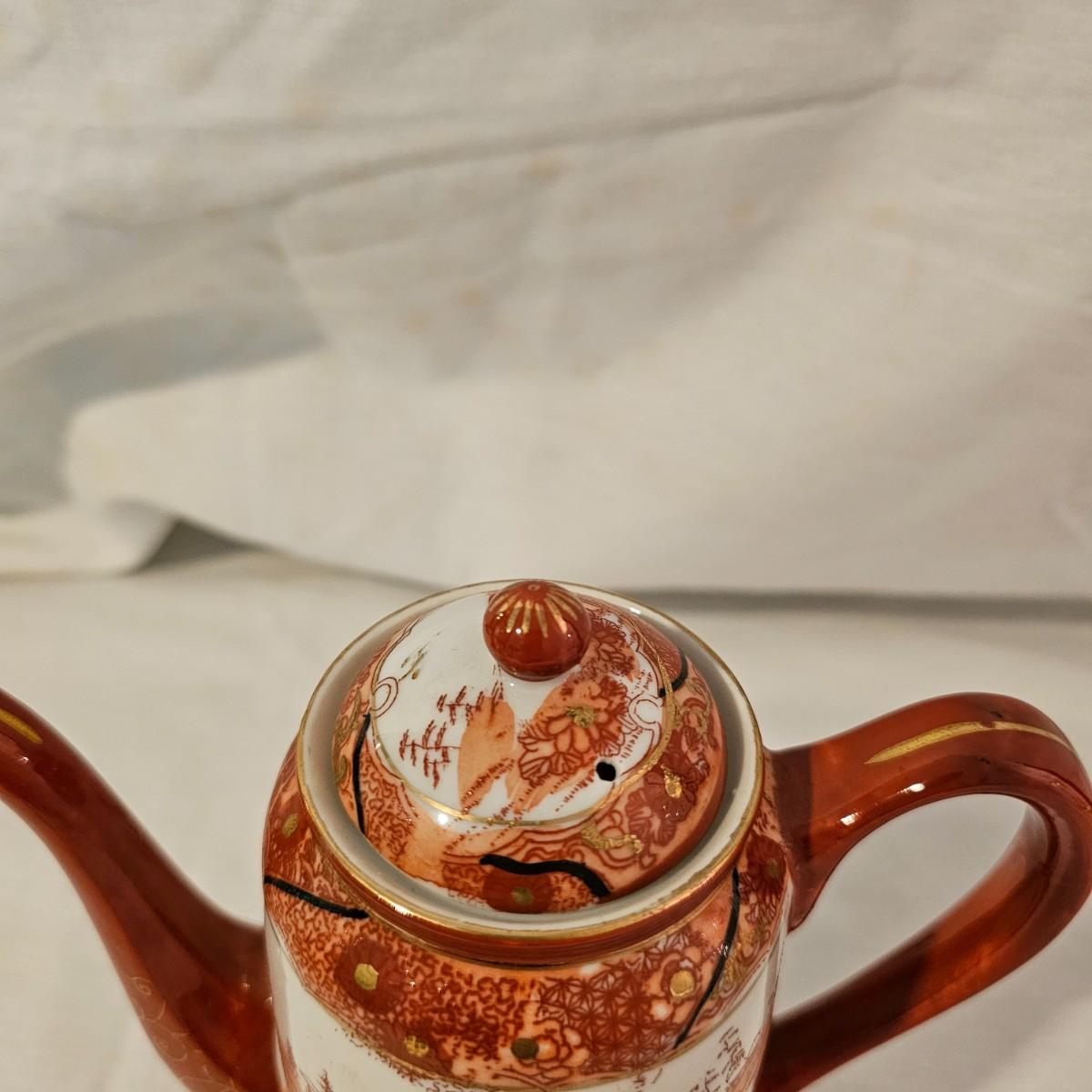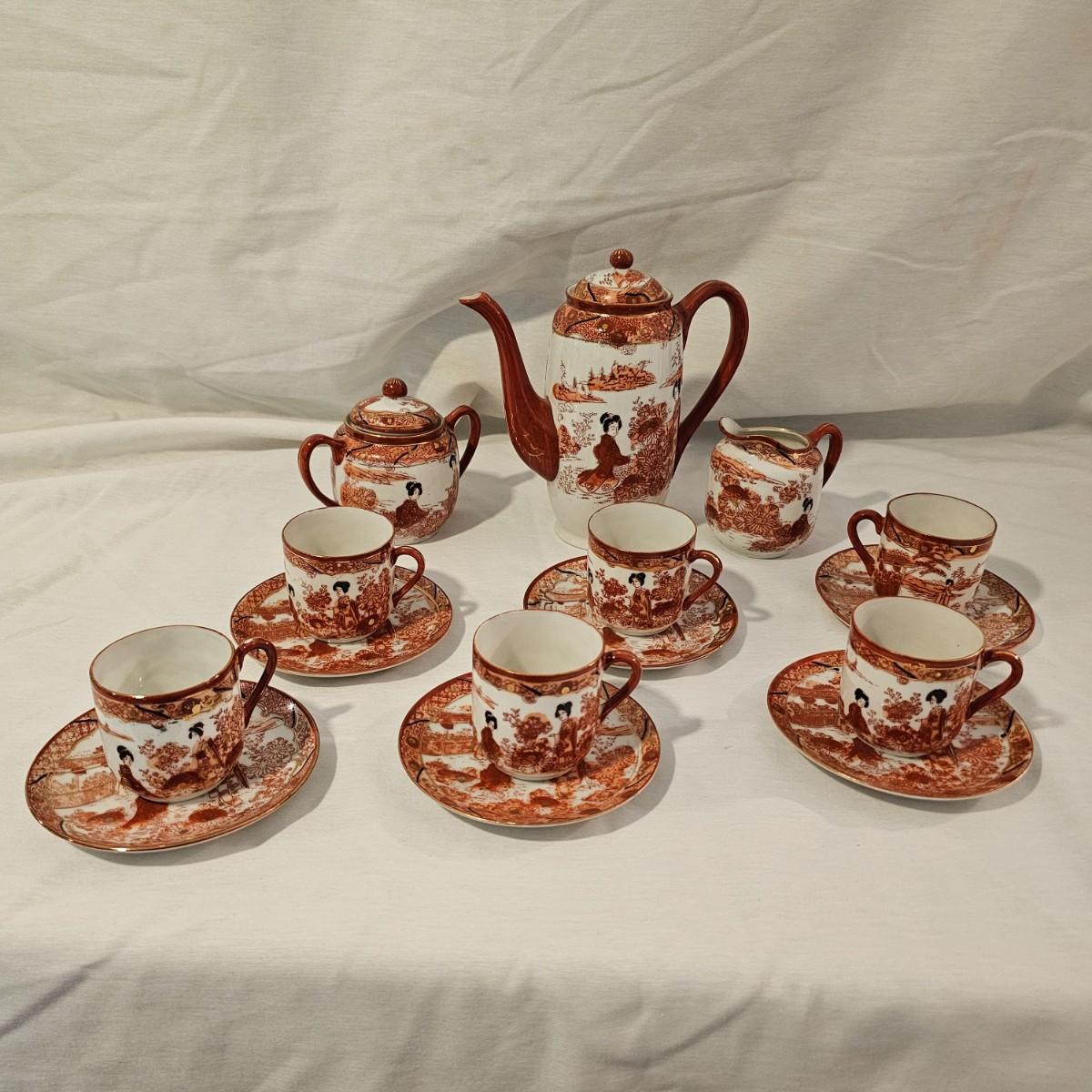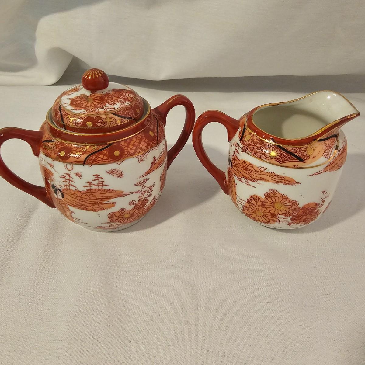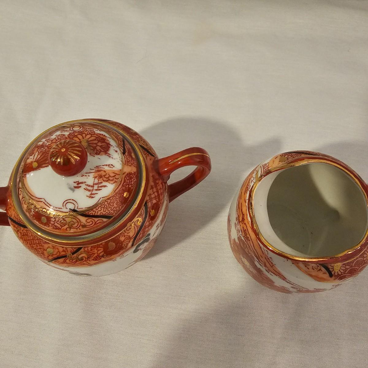 Oriental maids in brown and gold highlight the theme of this tea set. Tea pot with lid is 7"D x 7"H. Six cups & saucers, each 4.5"D x 2.25"H. Also a cream and sugar pair. All pieces have gold colored rims and decorations. Note one cup has small chips, see photos for details. Shipping available.