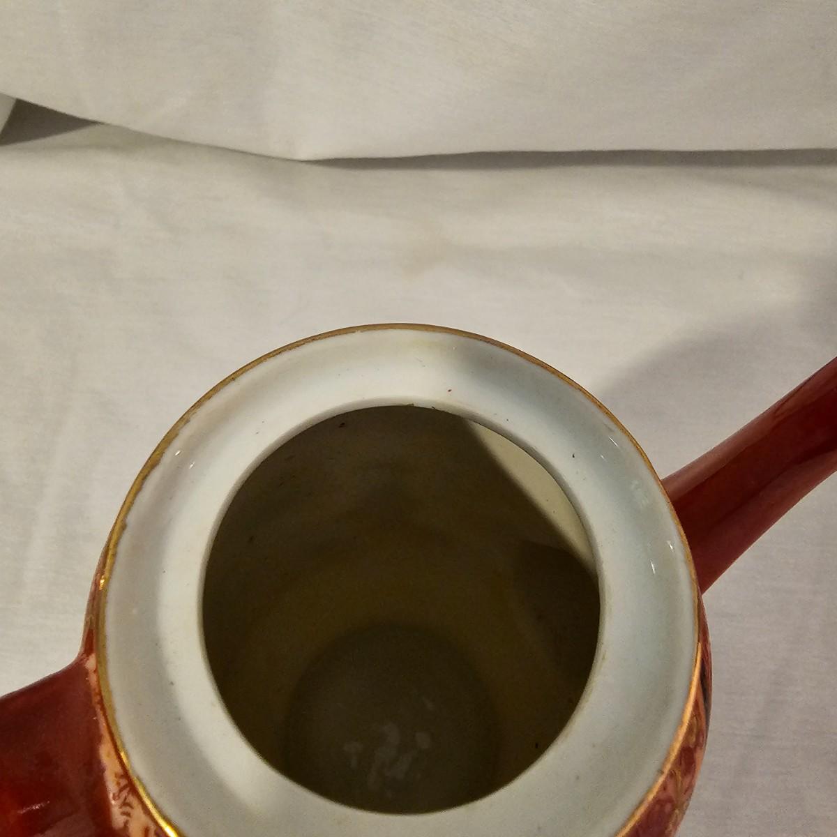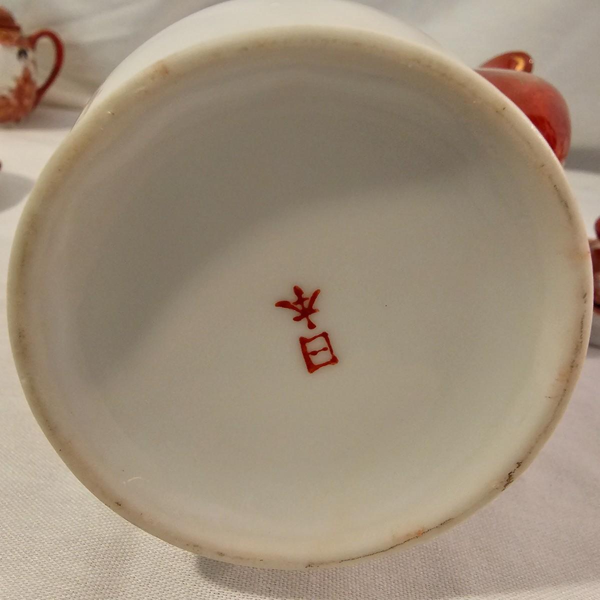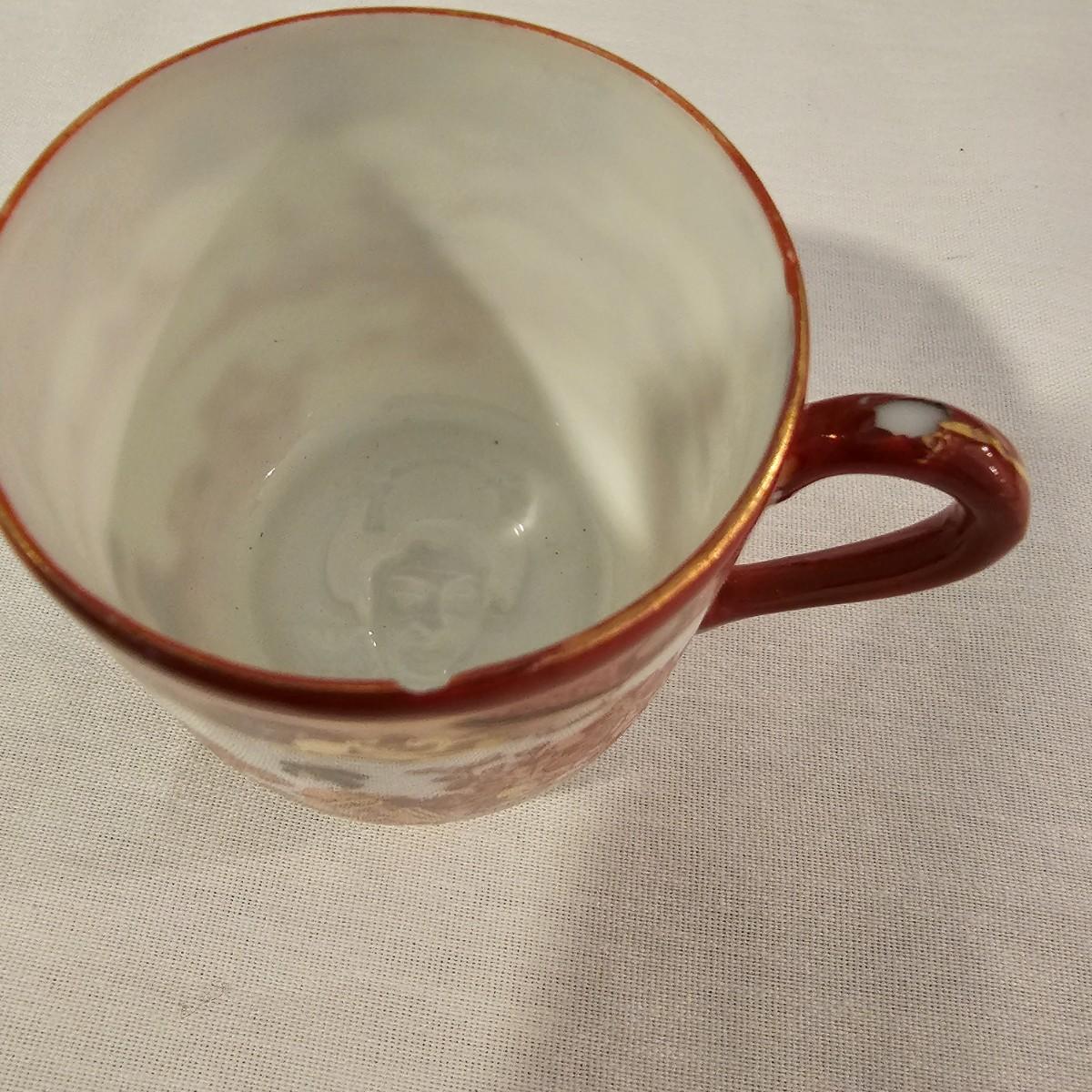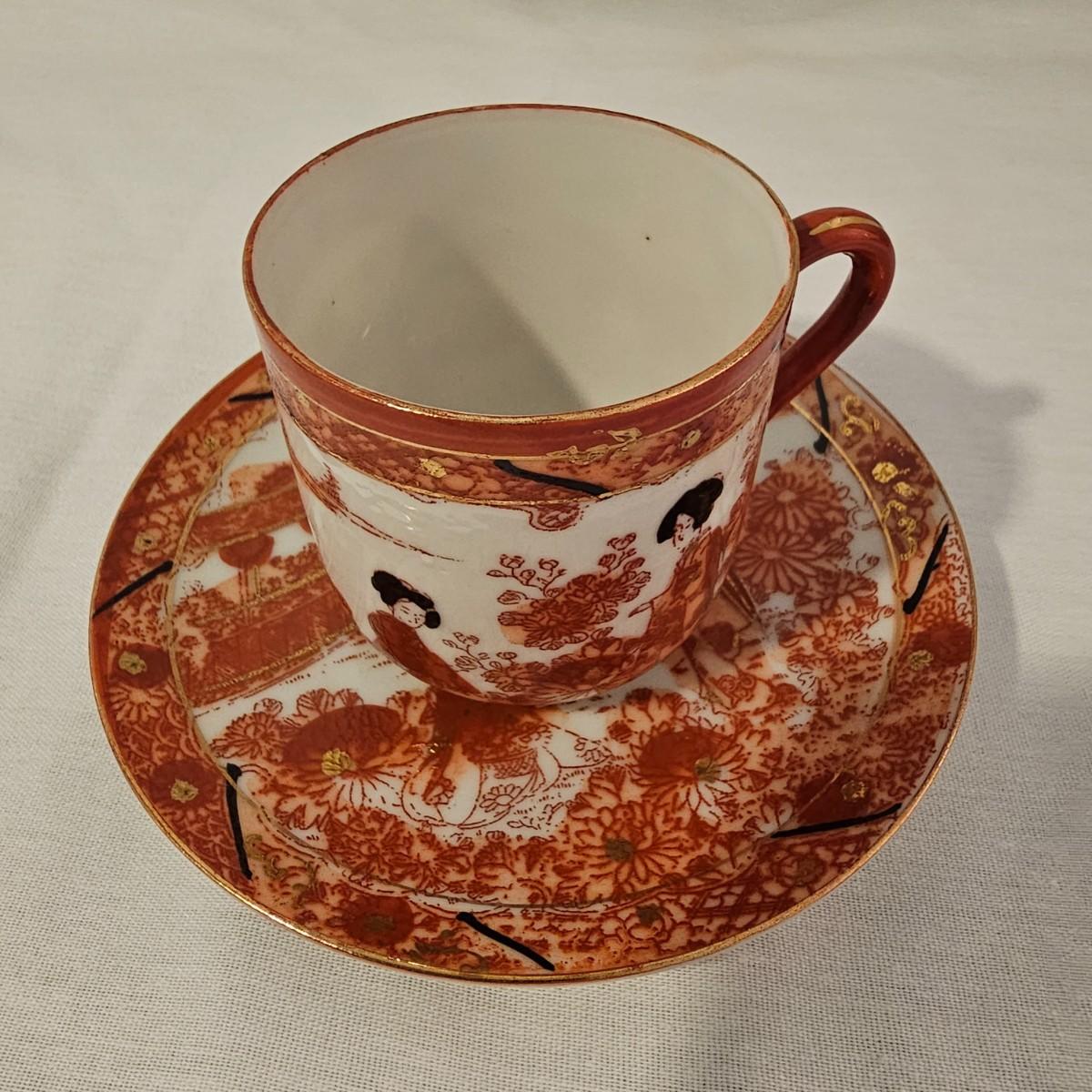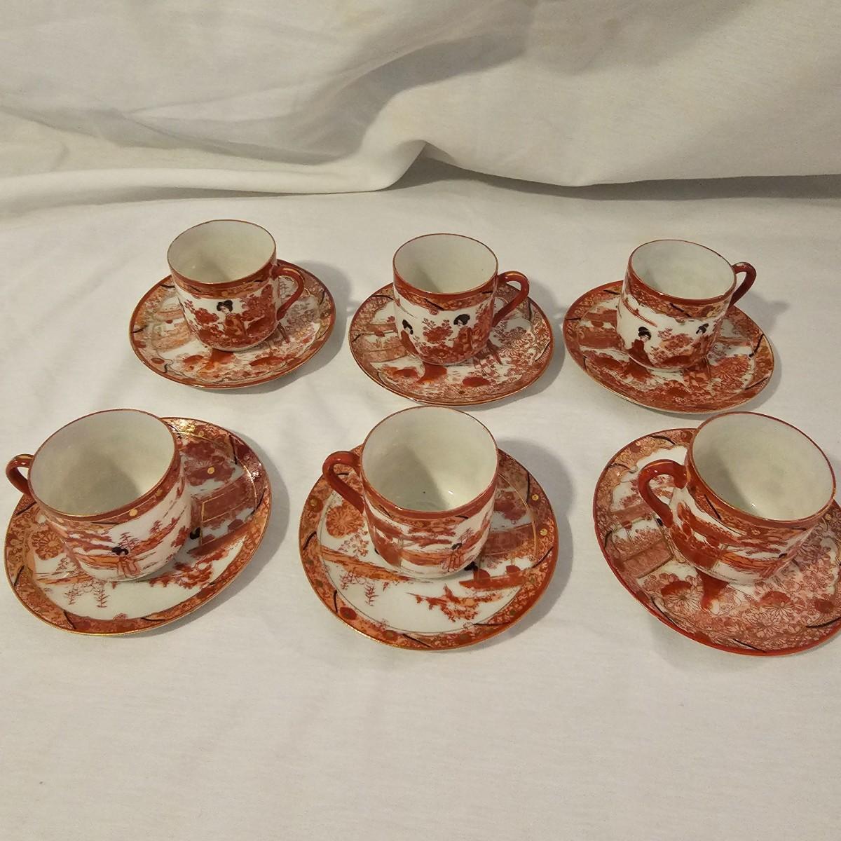 Oriental maids in brown and gold highlight the theme of this tea set. Tea pot with lid is 7"D x 7"H. Six cups & saucers, each 4.5"D x 2.25"H. Also a cream and sugar pair. All pieces have gold colored rims and decorations. Note one cup has small chips, see photos for details. Shipping available.