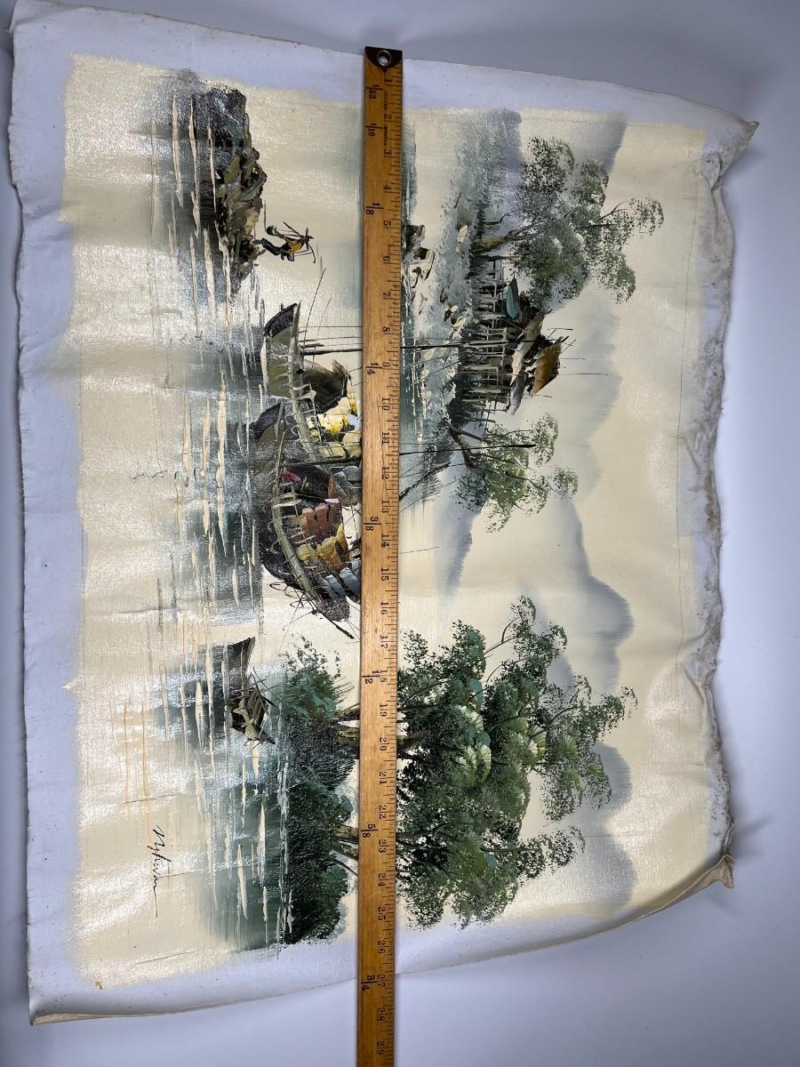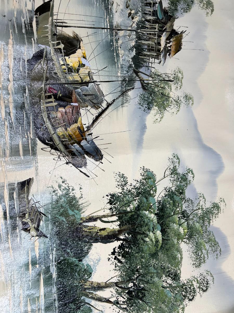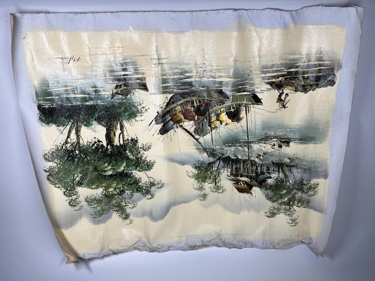 Oriental Tropical Fishing Village Souvenir Green Oil Painting on Rolled Cloth Canvas