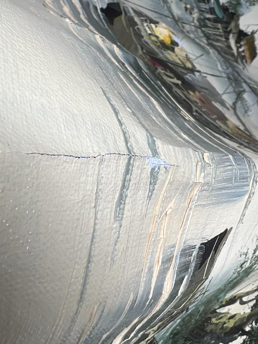 There is some cracking to the paint because of the material it was painted on and because of the way that it was rolled. Check pictures for more details and for sizing.