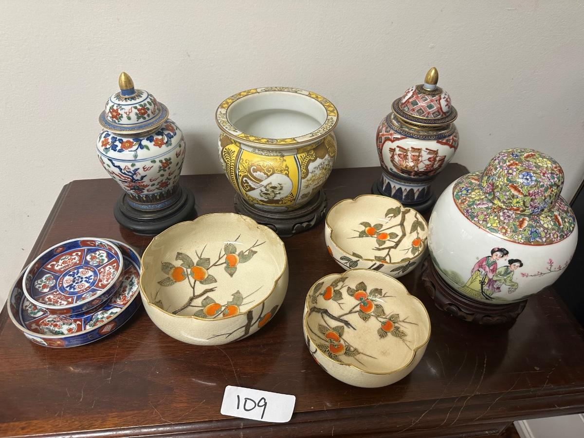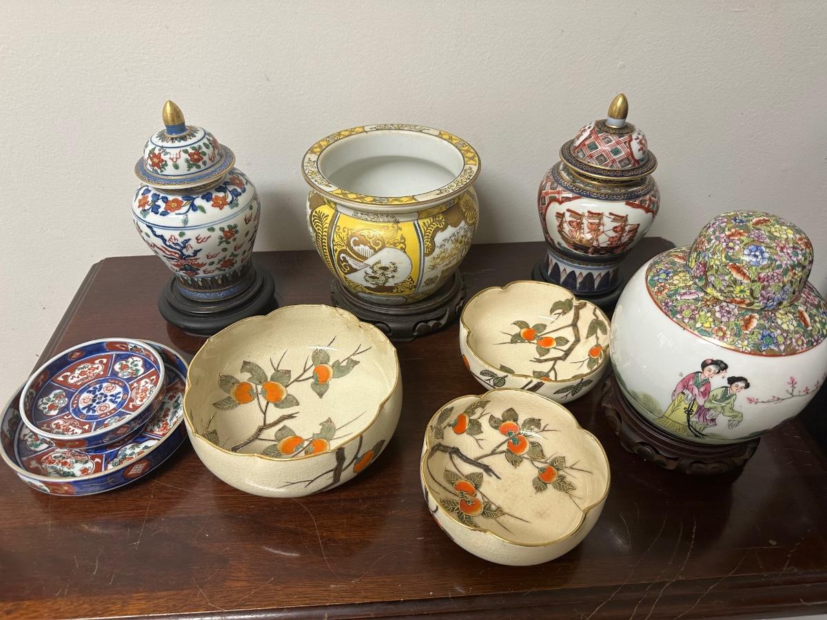 MISC ORIENTAL VASES INCLUDING IMARI, HONG KONG, SATSUMA JAPAN BOWLS,AS PICTURED