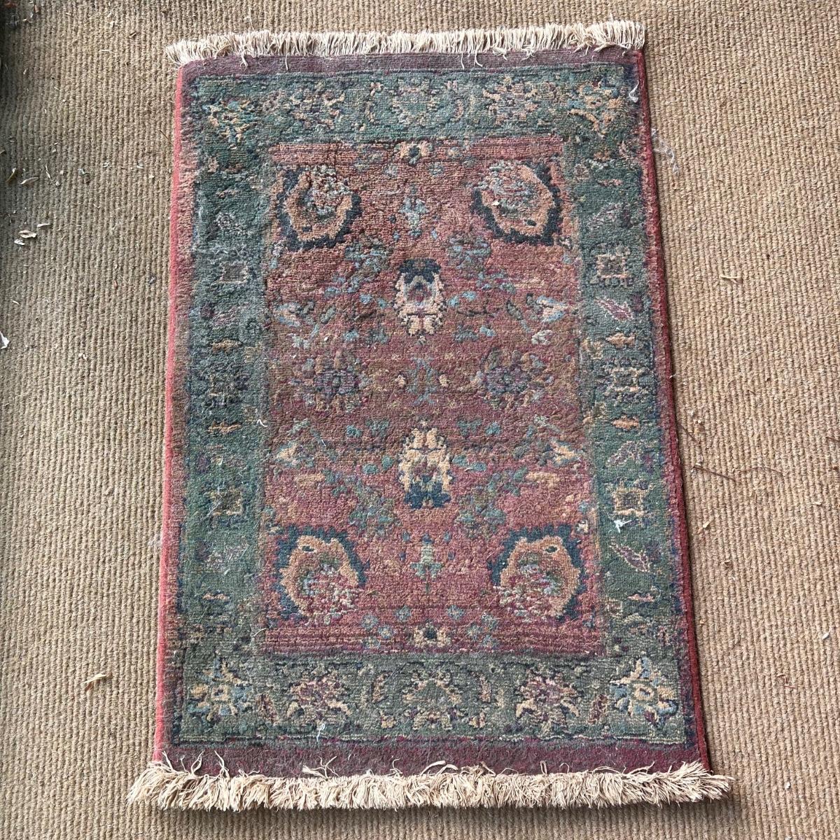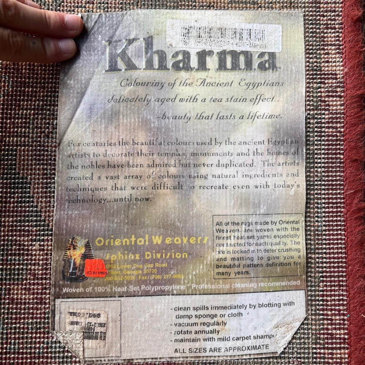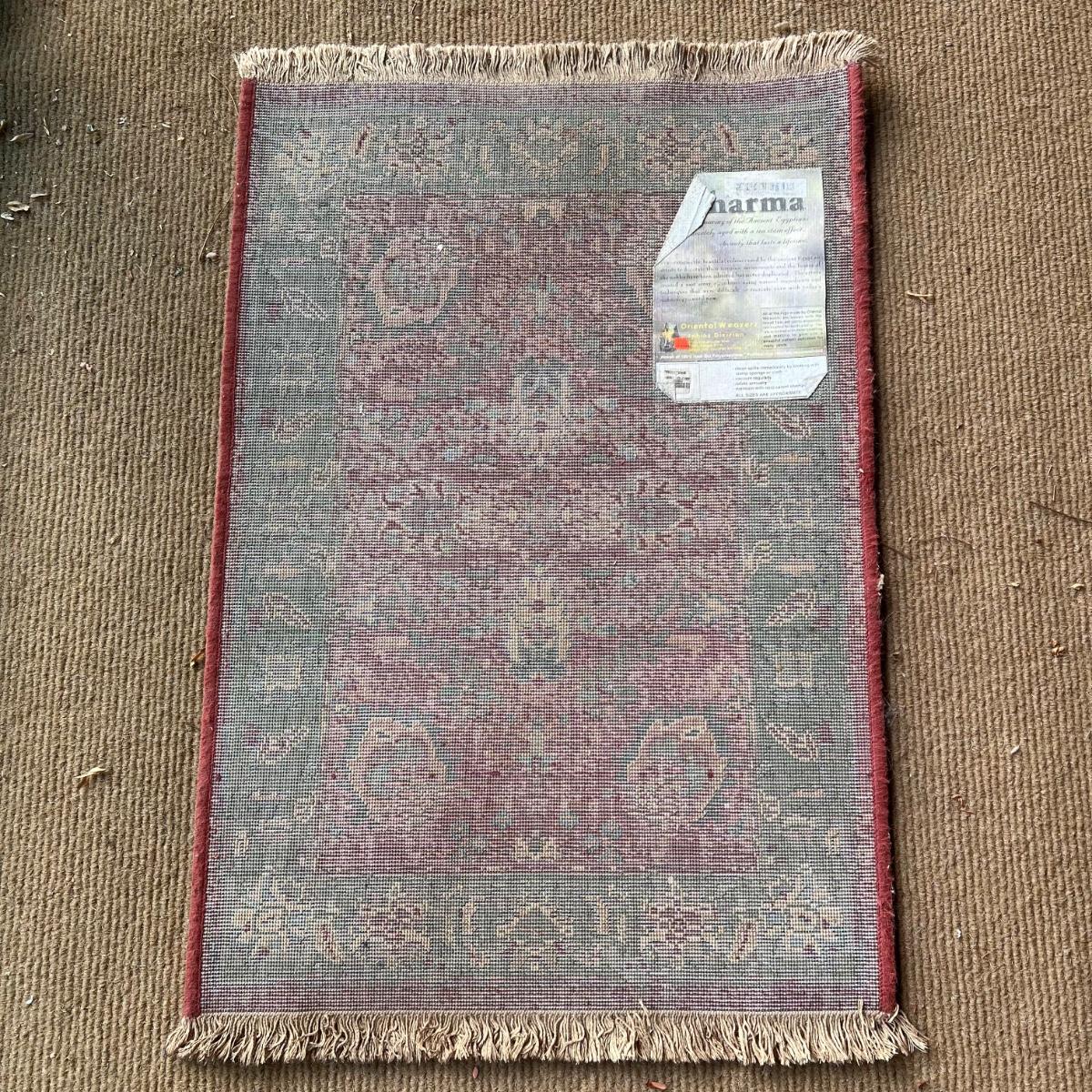 This lot includes one Kharma style rug displaying the colors of the Ancient Egyptians. Made by Oriental Weavers in Georgia. The rug measures 38” x 24”H. The rug needs a good cleaning as it shows signs of wear - see pictures included. Shipping available.