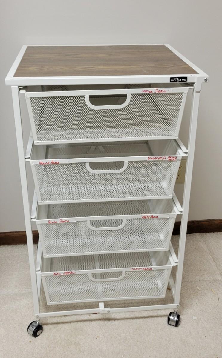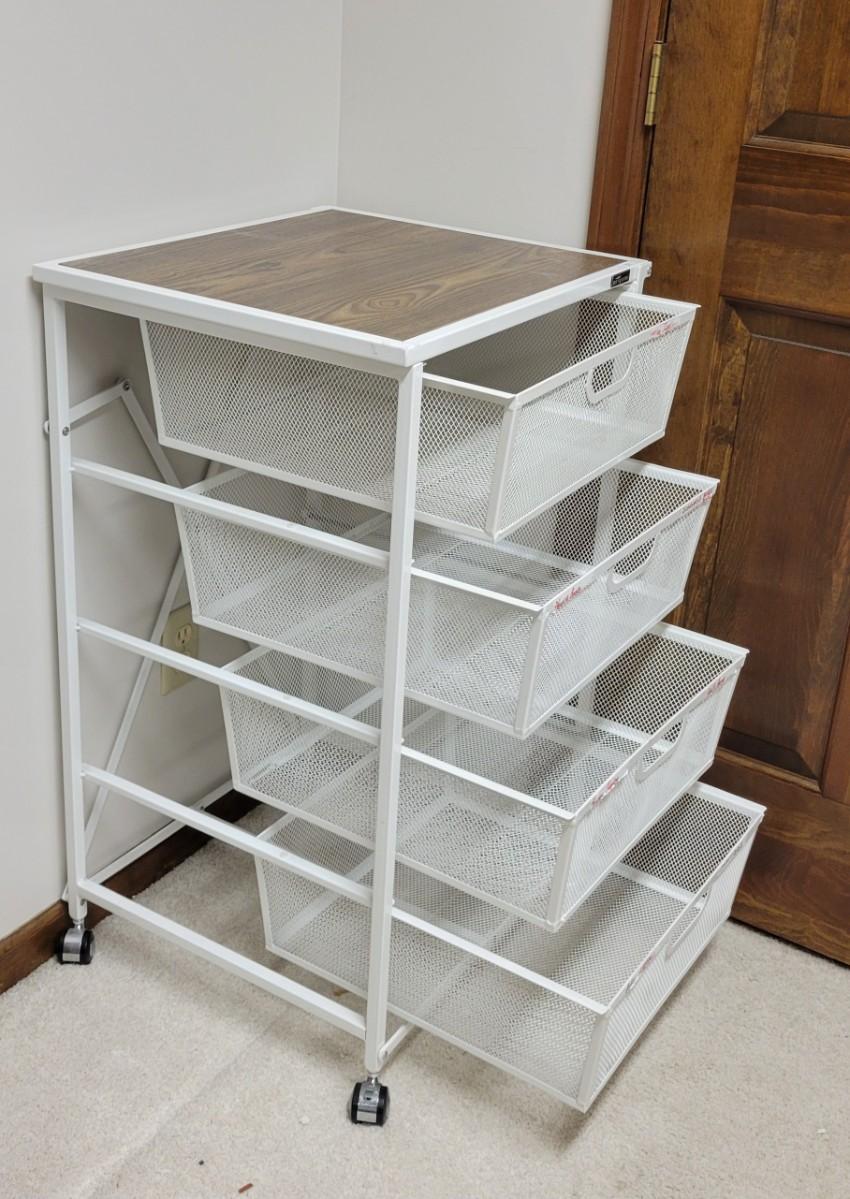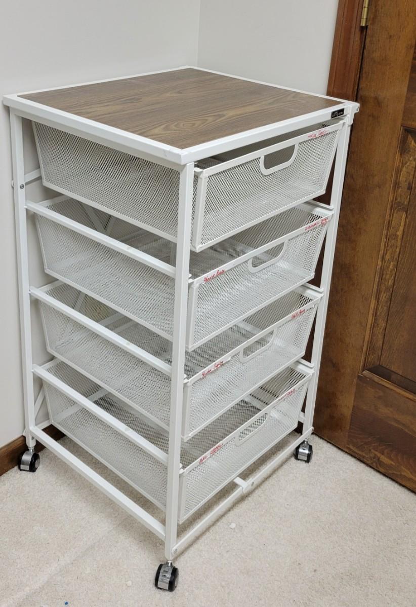 White metal frame with laminated wood top. On casters for ready maneuverabilty.