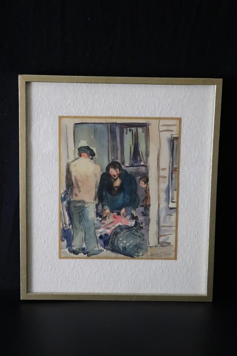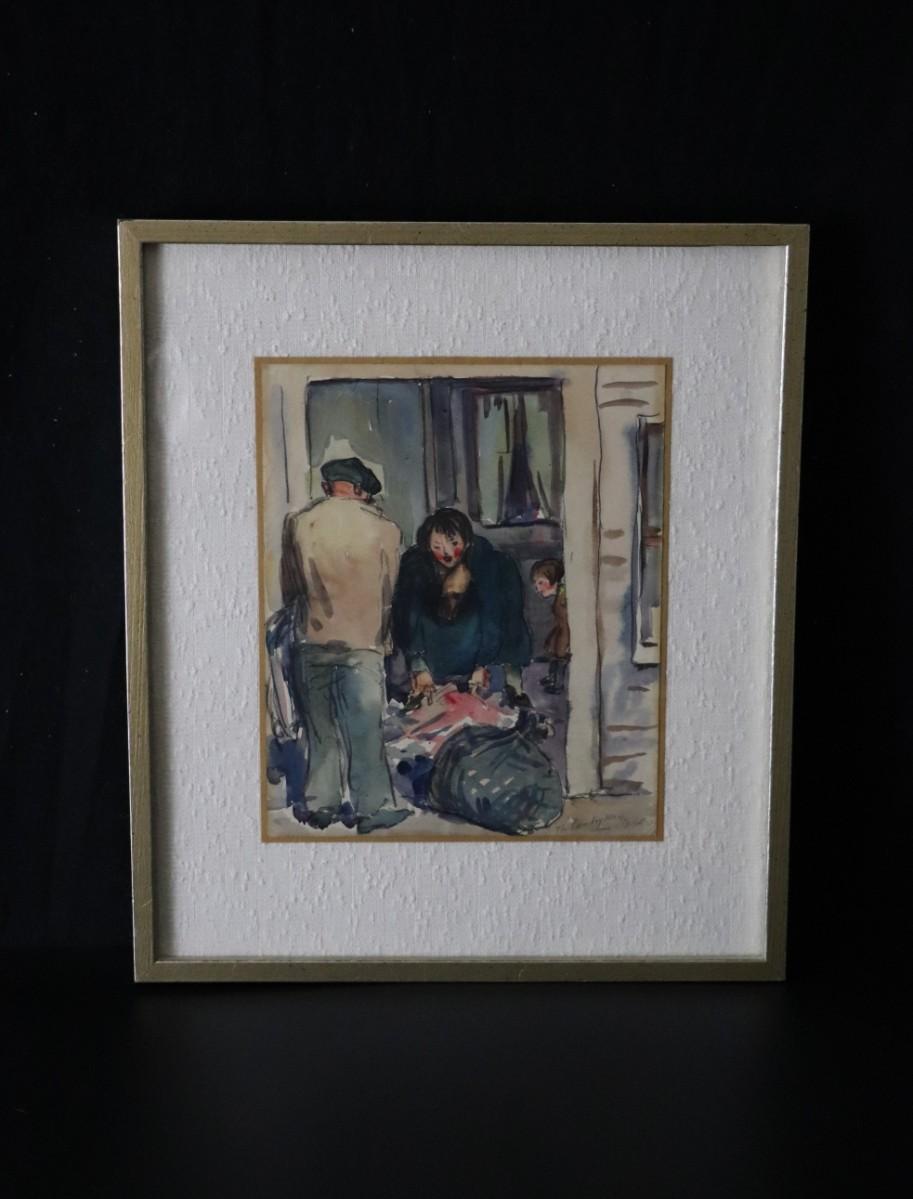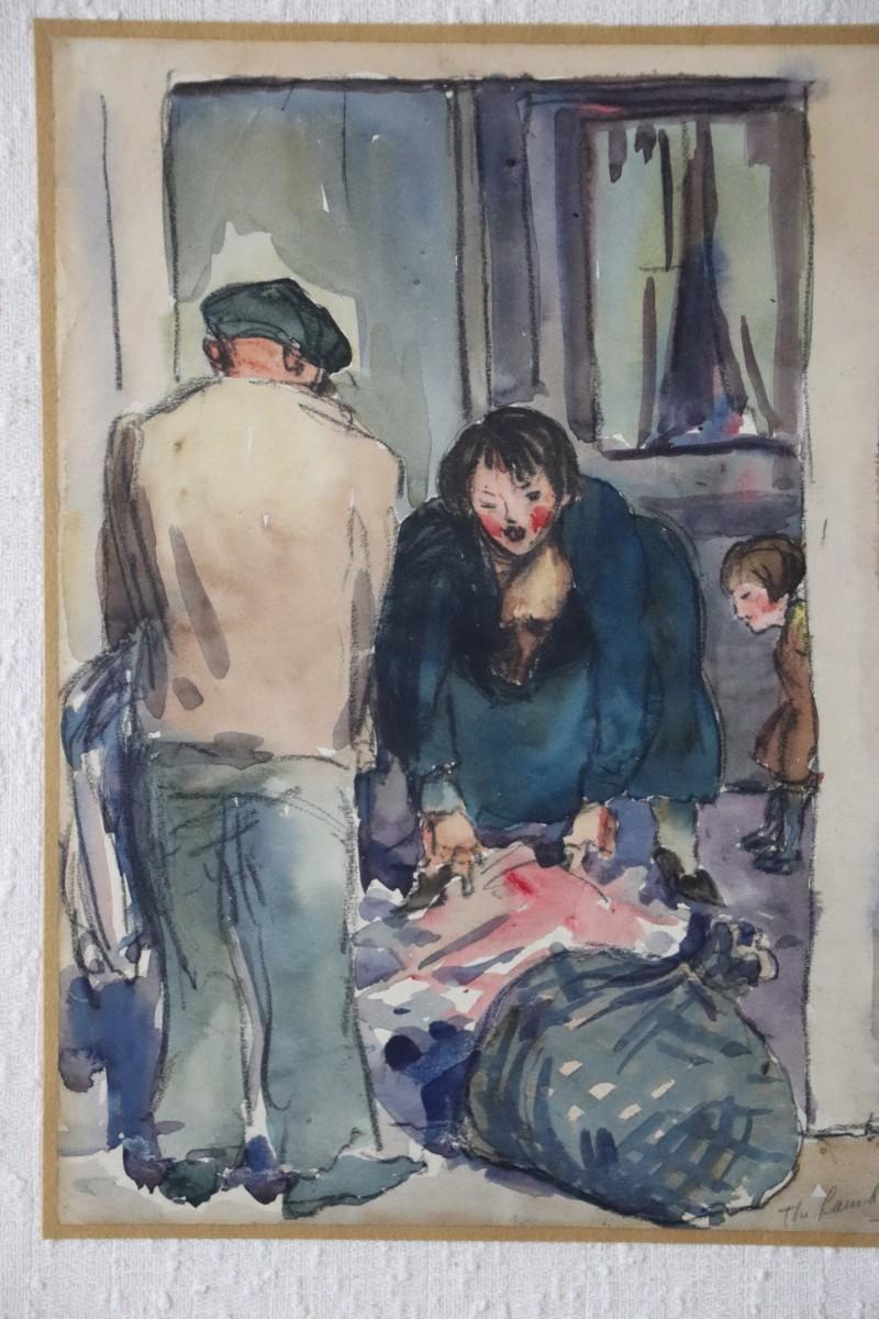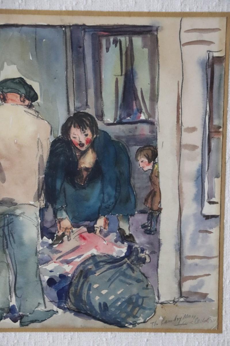 Original 1927 Kenneth Callahan (American, 1905 - 1986) Watercolor Painting Titled "The Laundry Man". Shows a woman preparing a bundle of laundry to give to the laundry man, with a child in the background. In good condition, as shown. Painting is approximately 9 x 11 inches.