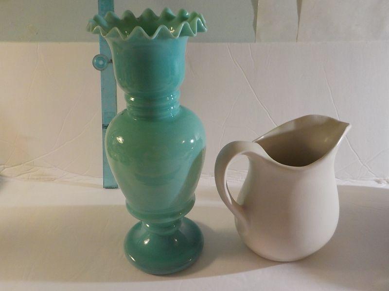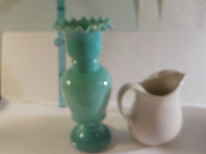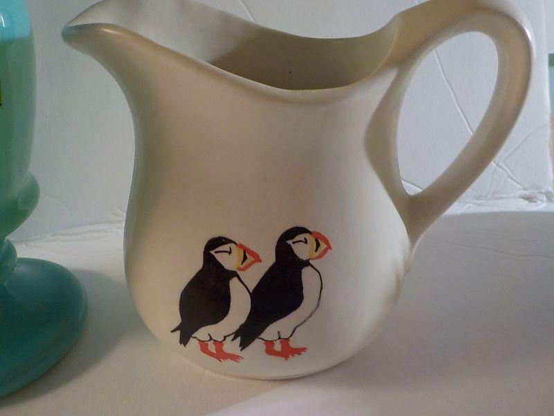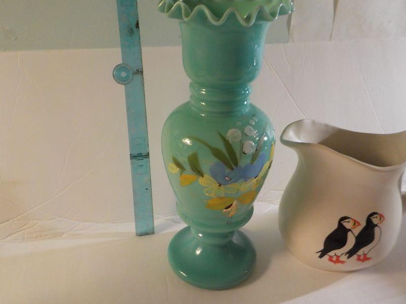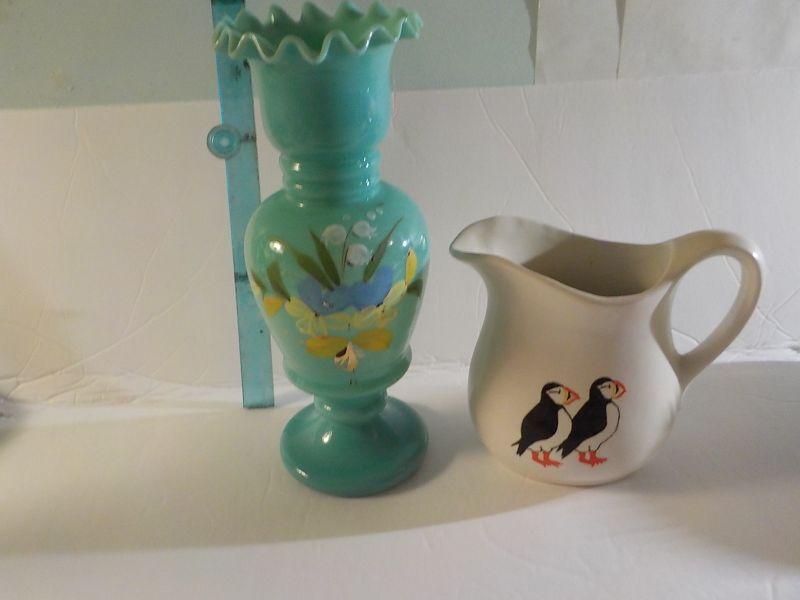 2 stunning vase & pitcher  / hand painted blue translucent vase & penguin pitcher.