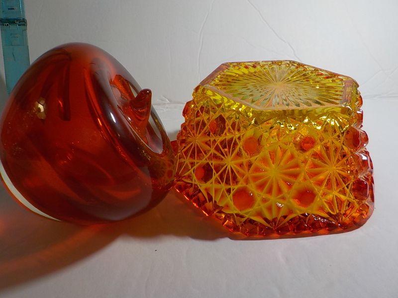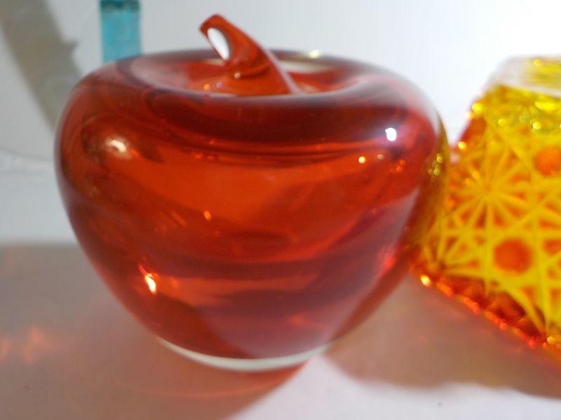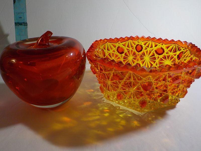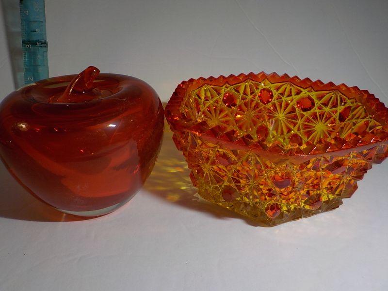 Glass Apple paper weight and Carnival Glass Red Candy dish (rare).
