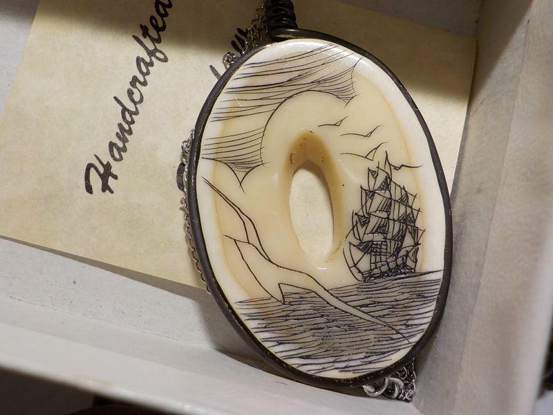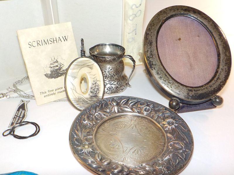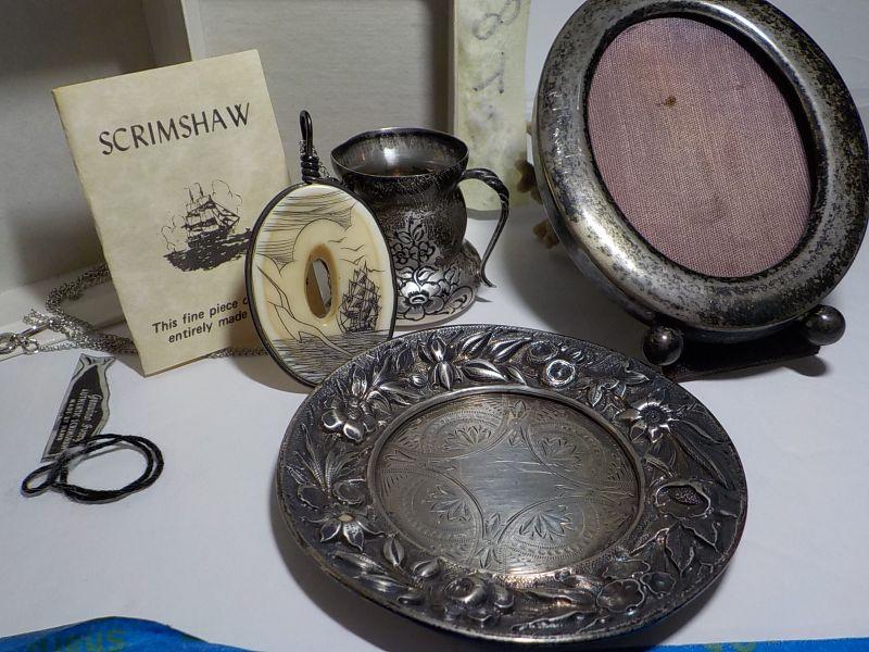 Scrimshaw Sea going Necklace, 1800's sterling cup/Saucer and frame.