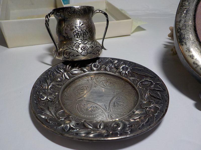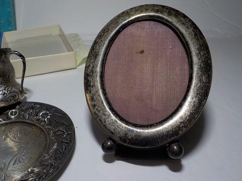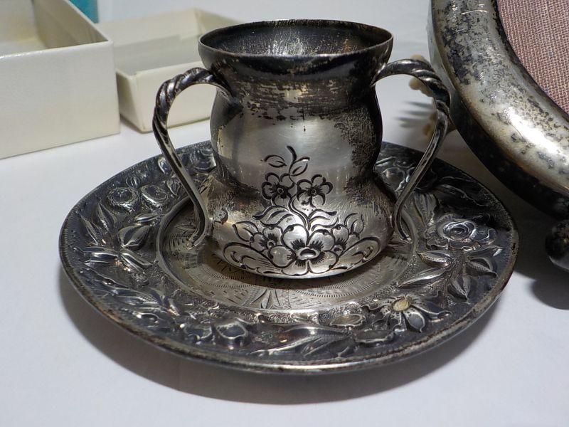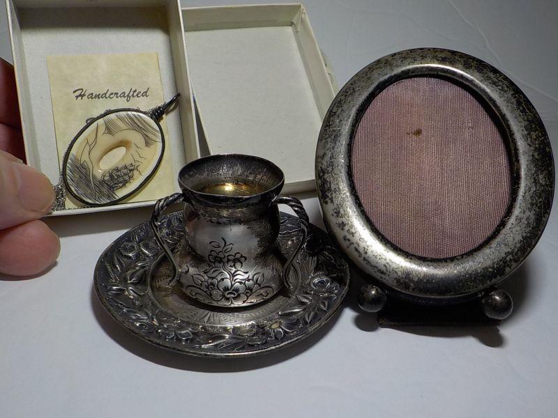 Necklace is new with box , cup is hand graved and mark sterling with plate and picture frame. Frame is sterling but stand up in back need repair.