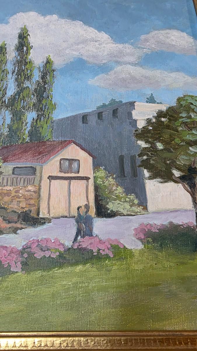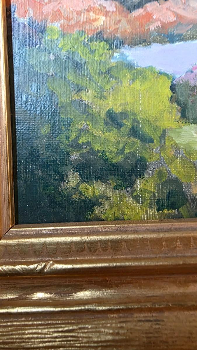 Condition appears very good for a vintage oil painting of this age, with stable paint surface and only minor age-appropriate wear to the frame finish. This piece presents as a ready-to-display original artwork with authentic period character and documented exhibition history, ideal for collectors of vintage regional landscape painting or for adding warmth and story to an interior space.
