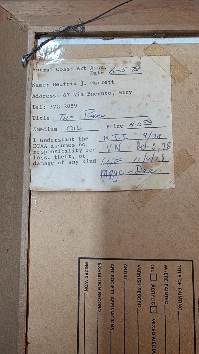 The painting remains housed in its original exhibition frame, which features deep molded profile lines and aged gold finish with visible patina consistent with vintage framing. The back retains an original Central Coast Art Association exhibition record from 1978 indicating the title, medium as oil, and exhibition history, adding provenance and confirming the painting’s participation in a regional art show. The artist is not visibly signed on the front, which is common for exhibition works of this type. Measurements are shown clearly in the accompanying photos and should be referenced directly for sizing, as no written dimensions are assumed or stated outside of what is visibly documented.