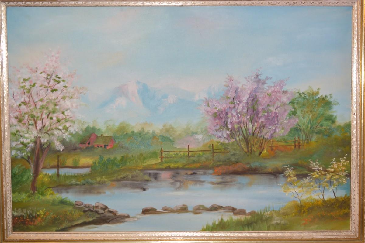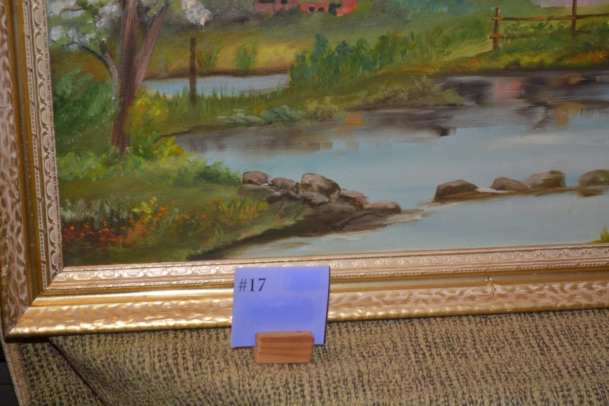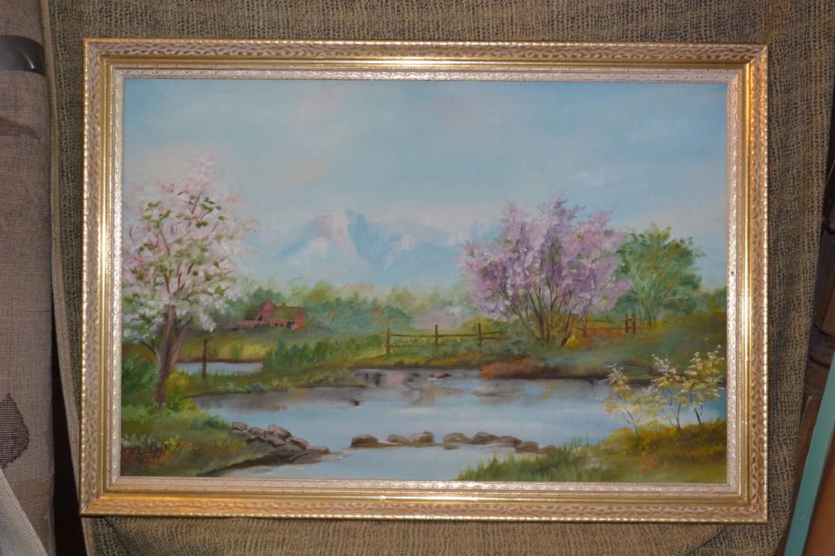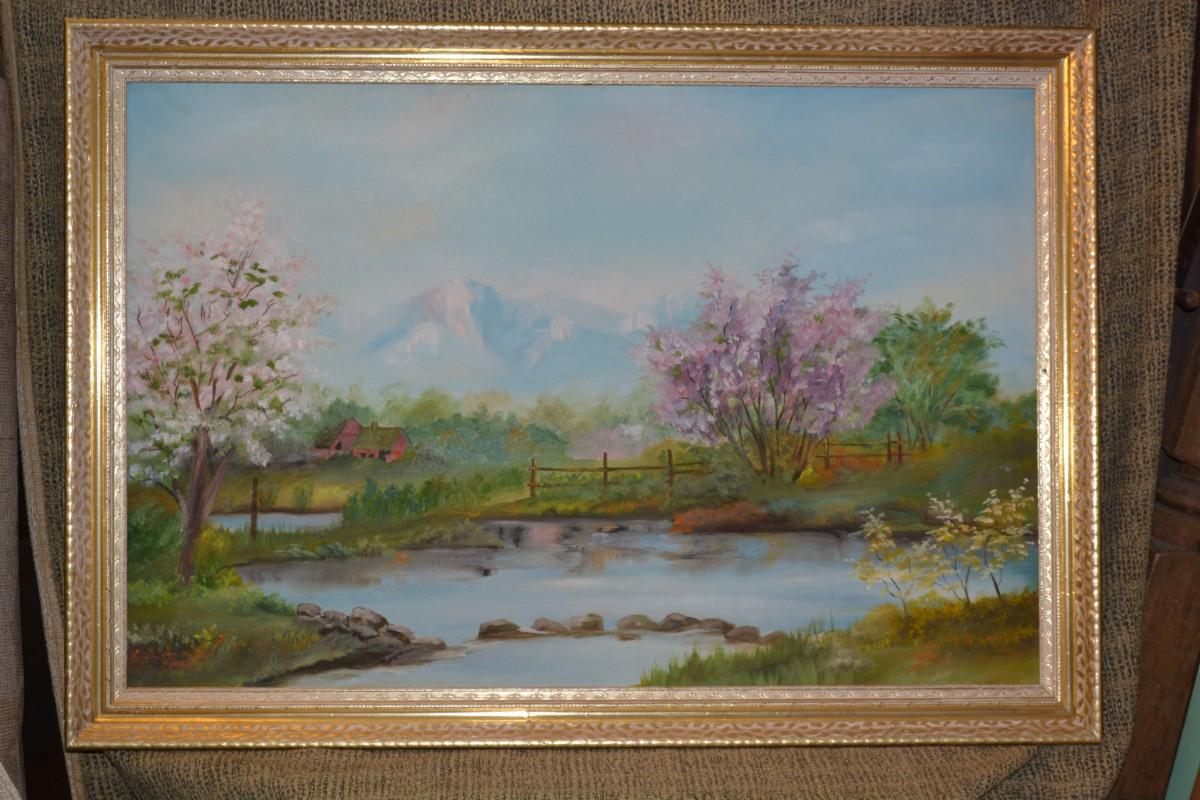 Original Acrylic Landscape on Canvas in Gold Painted Wood Frame