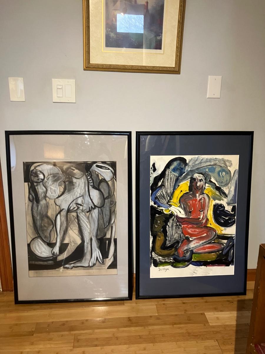 - Right: Vibrant color seated female figure with bold, energetic background (signed lower left "Ortega")