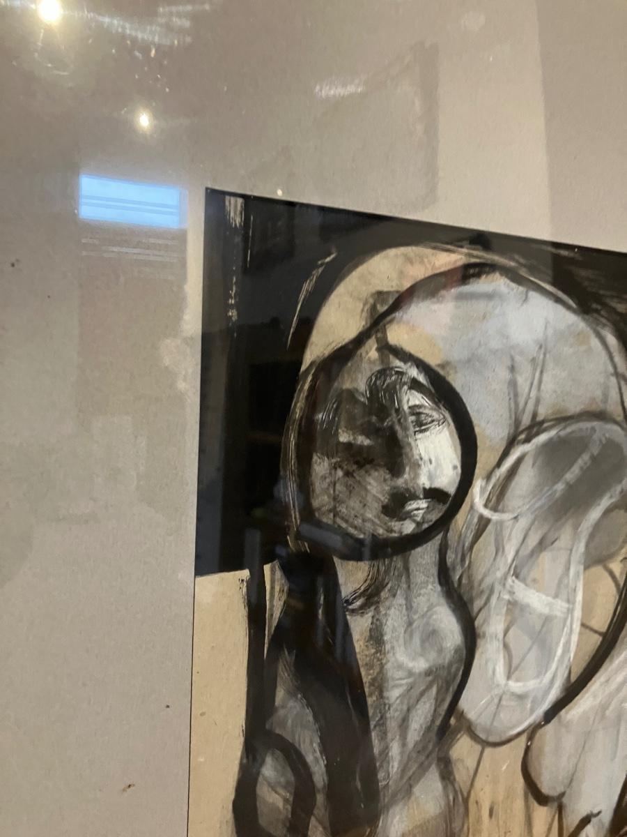 - Left: Expressive black-and-white abstracted female nude (classic Ortega grisaille style)