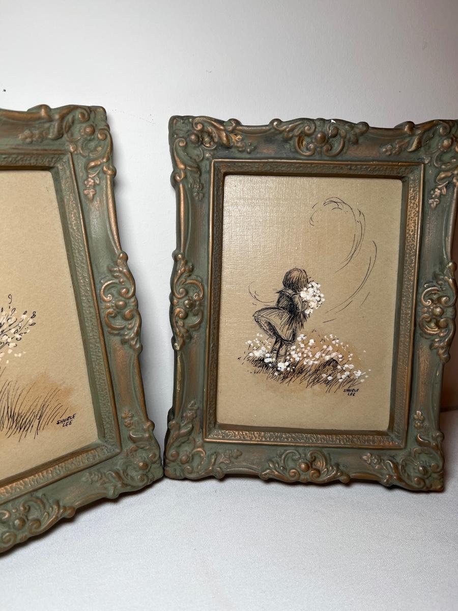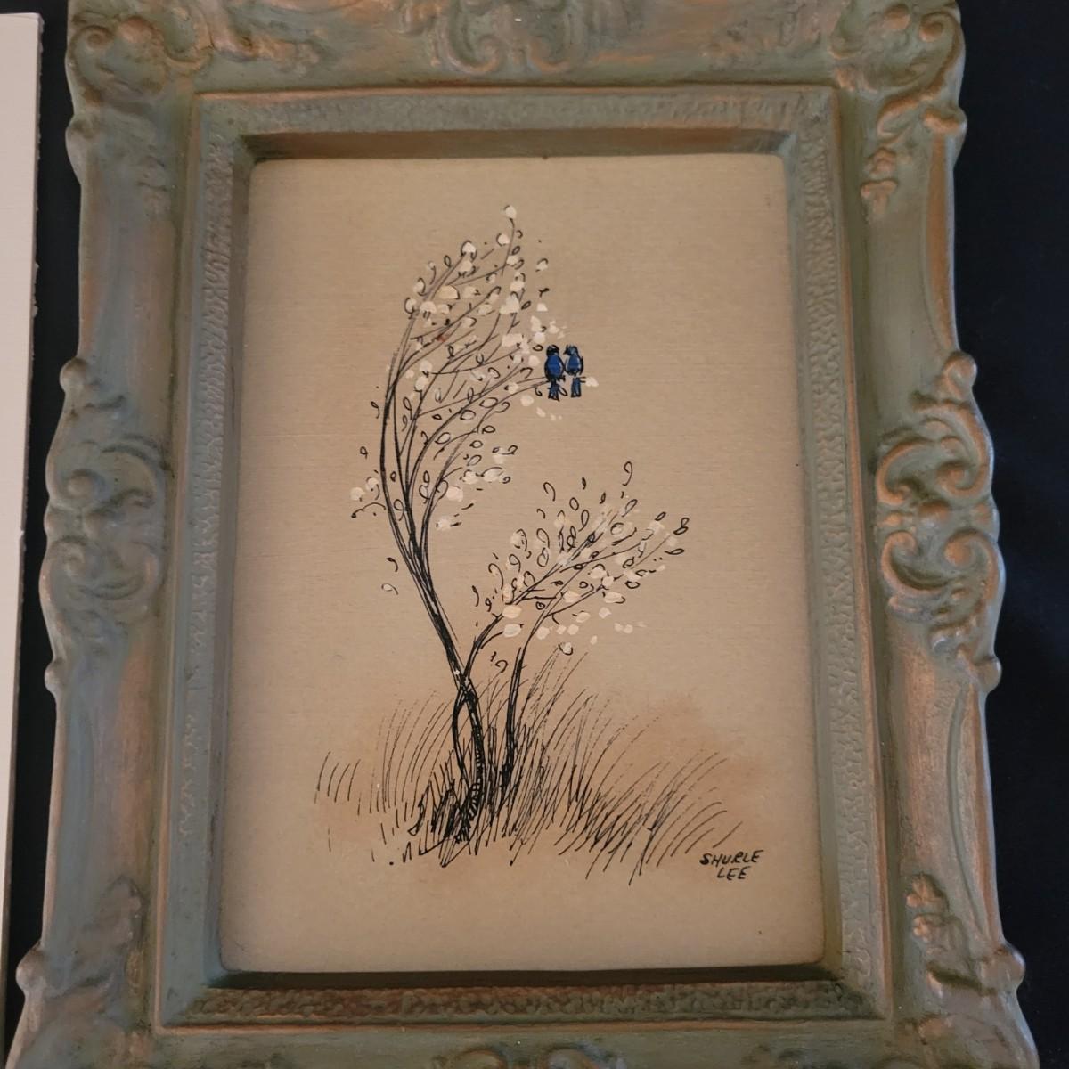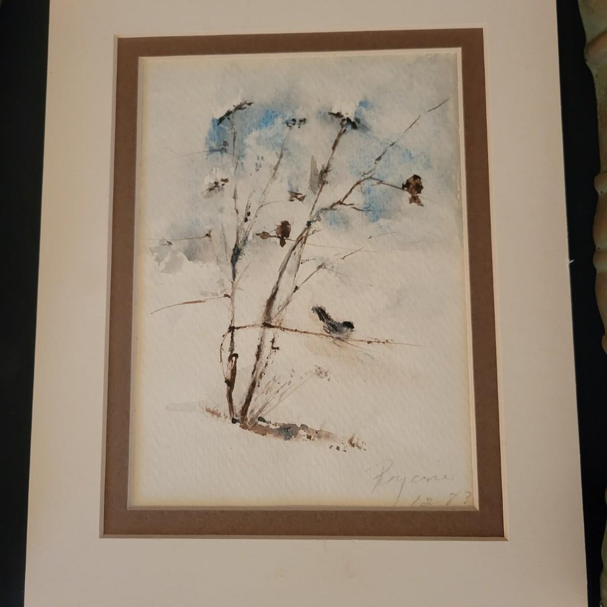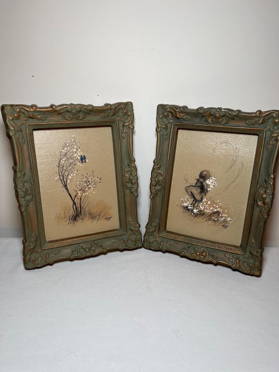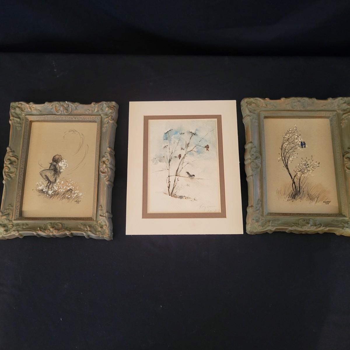 Three original pieces of art that have no damage. The framed pieces are original pen and watercolors that are framed in a plaster molded frame with a gold finish with antiquing that measure approximately 7" x 1" x 9"H. One frame does have some minor damage. The other piece is an original watercolor that is double matted. The artists name is indecipherable and shows it was painted in December of 83. Shipping available