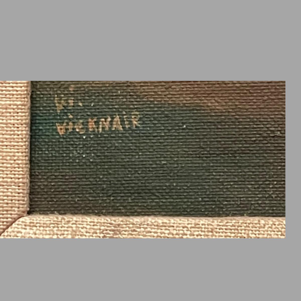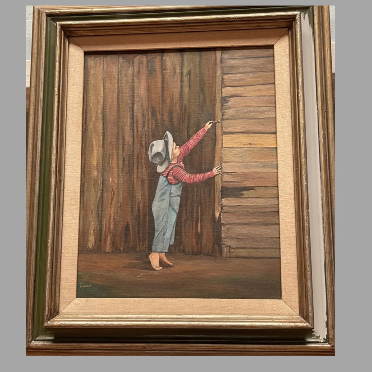 This is a cute original piece of art. The frame has a bit of odd colored paint on it. It measures 26 x 22. It is signed by the artist.