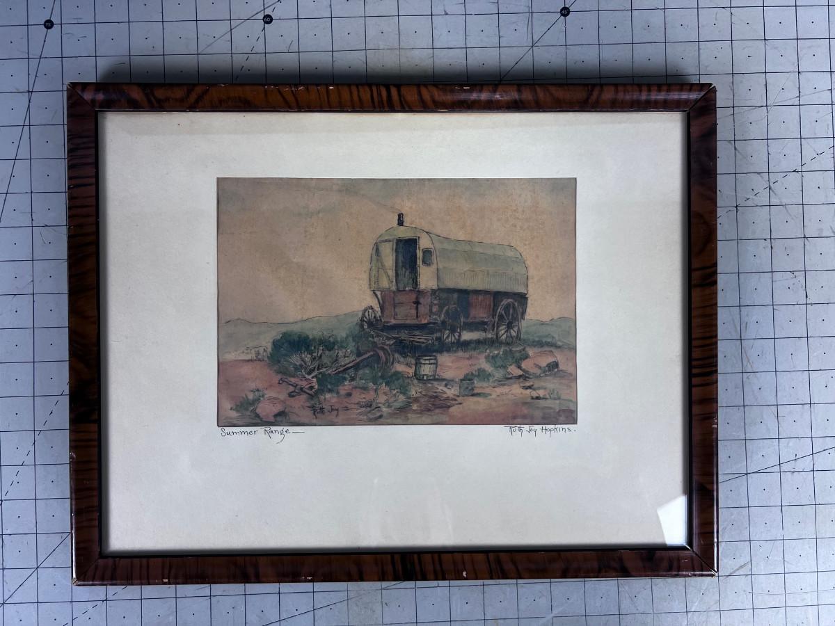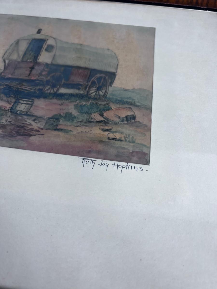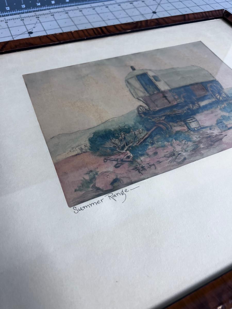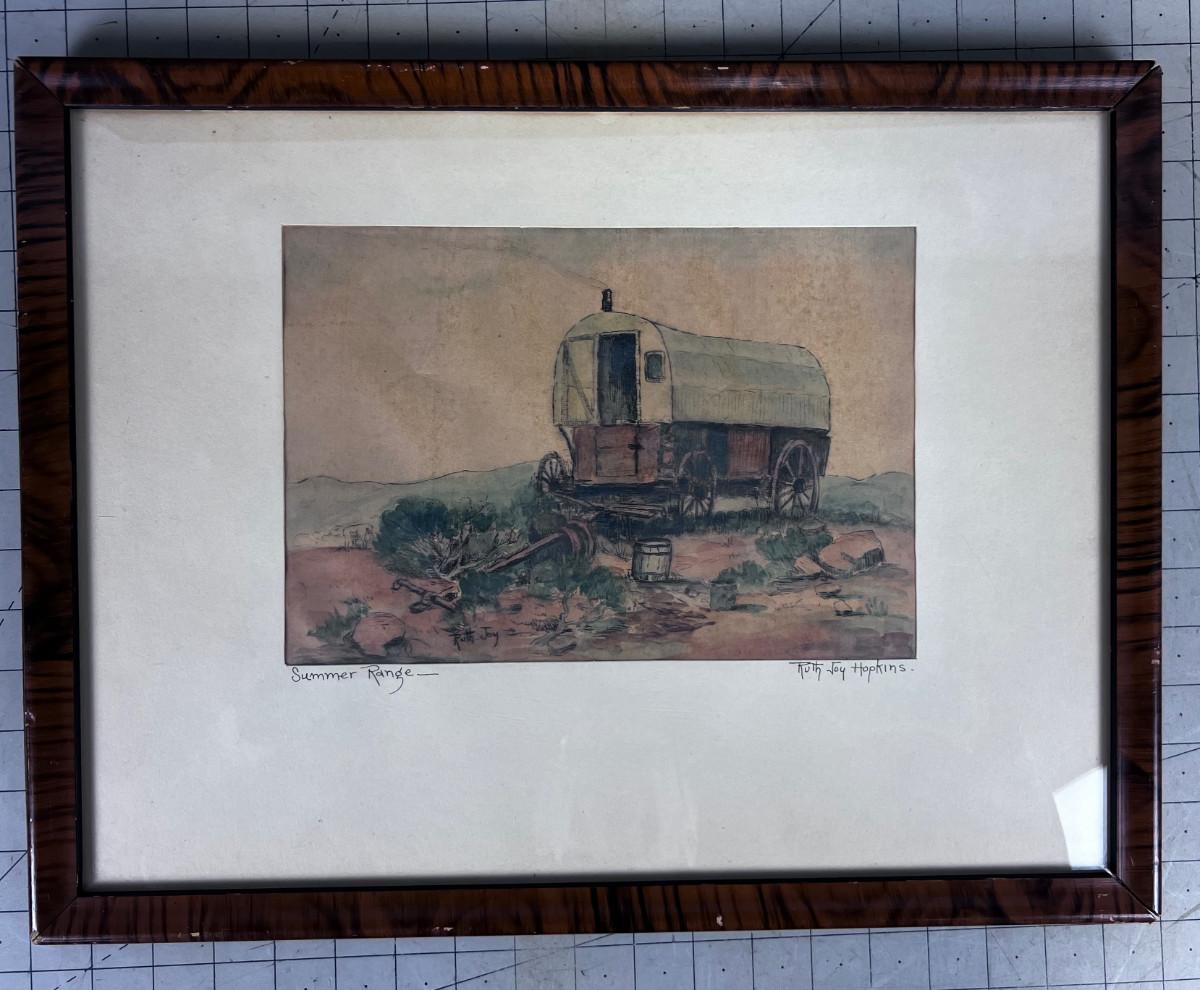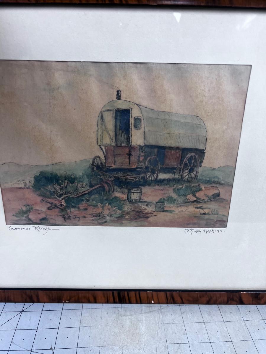 Water color framed under glass old sheep camp. 14" by 17" Ruth Joy Hopkins: Painting "the bigness of it all"