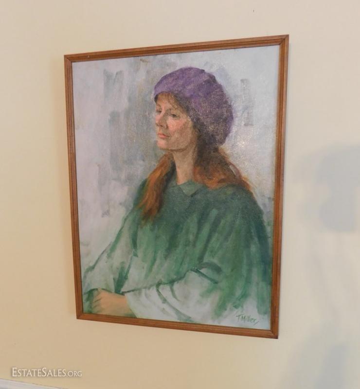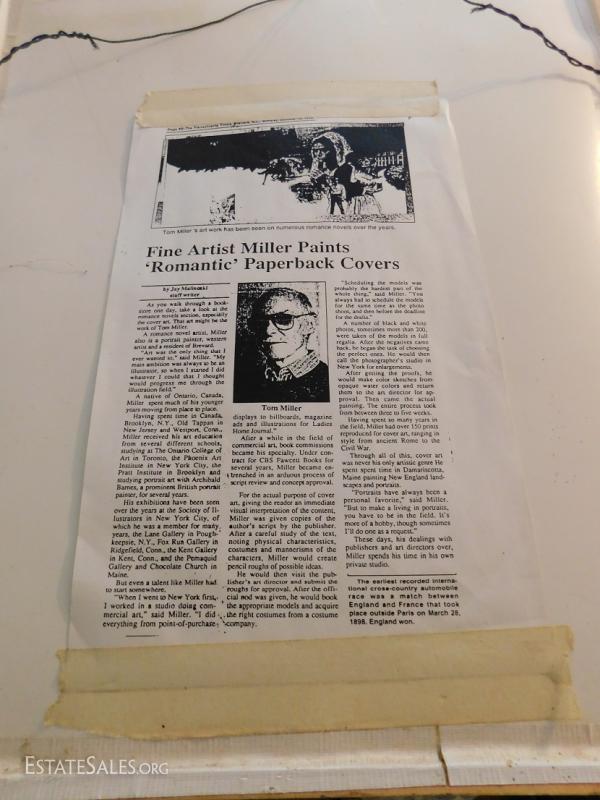 Original portrait artwork by Tom Miller. Mr. Miller, a Canadian artist, was local to Brevard in his latter years, and is famous for his art cover work for romance and historical novels. Google Mr. Miller using tag words Tom Miller Romance Novel Art Work. Needs cleaning.