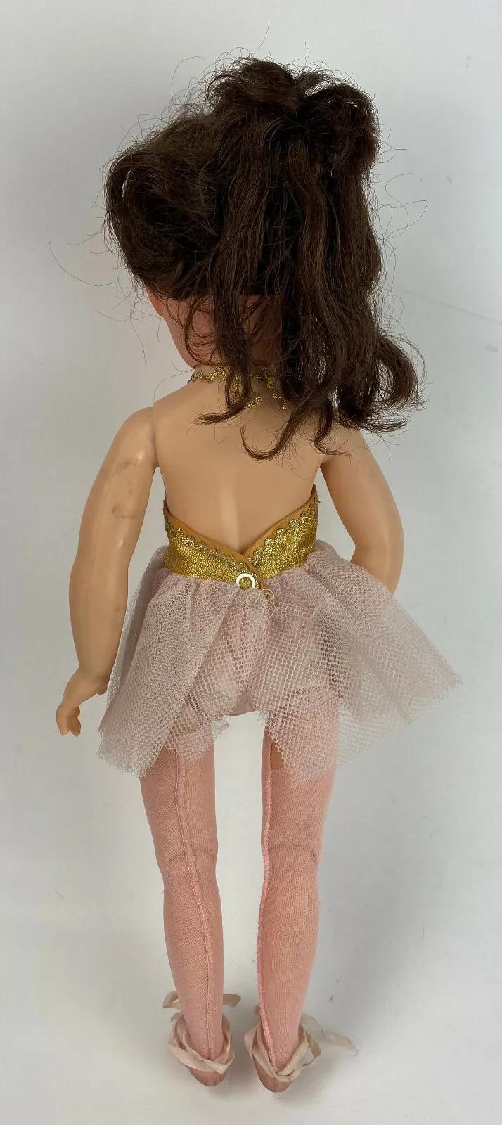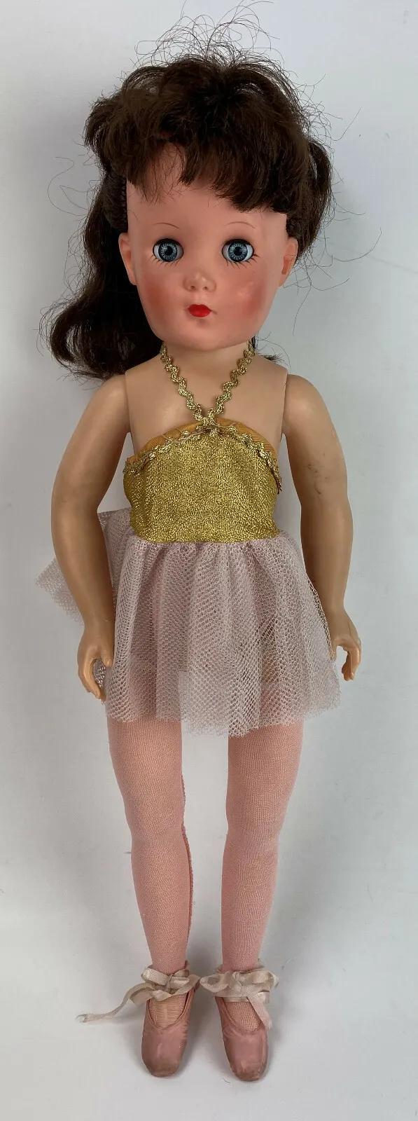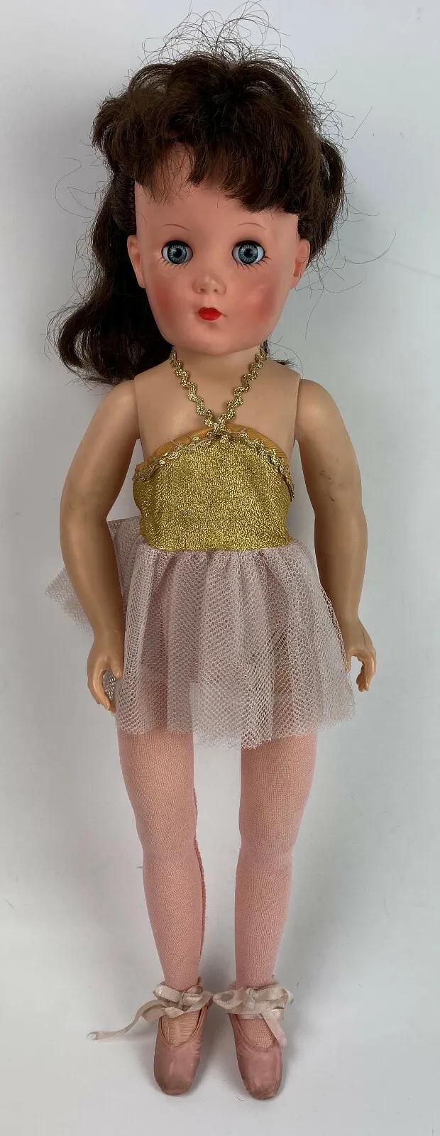 Several companies made ballerina dolls in the 1950's but I believe this lady is a 19" Ballerina Belle from the Belle Doll and Toy Company of Brooklyn, New York...In her original tutu, leotard and shoes..Hard plastic and vinyl..dark brown hair with blue sleep eyes...She may be the Scherzo #20 variation? Hair hair is disheveled..light soiling with age...tear in the back of her tights...Features rooted hair..walks on her toes..movable arms, legs, toes, knees and head...She is marked '17 VW'...Offered with no reserve...