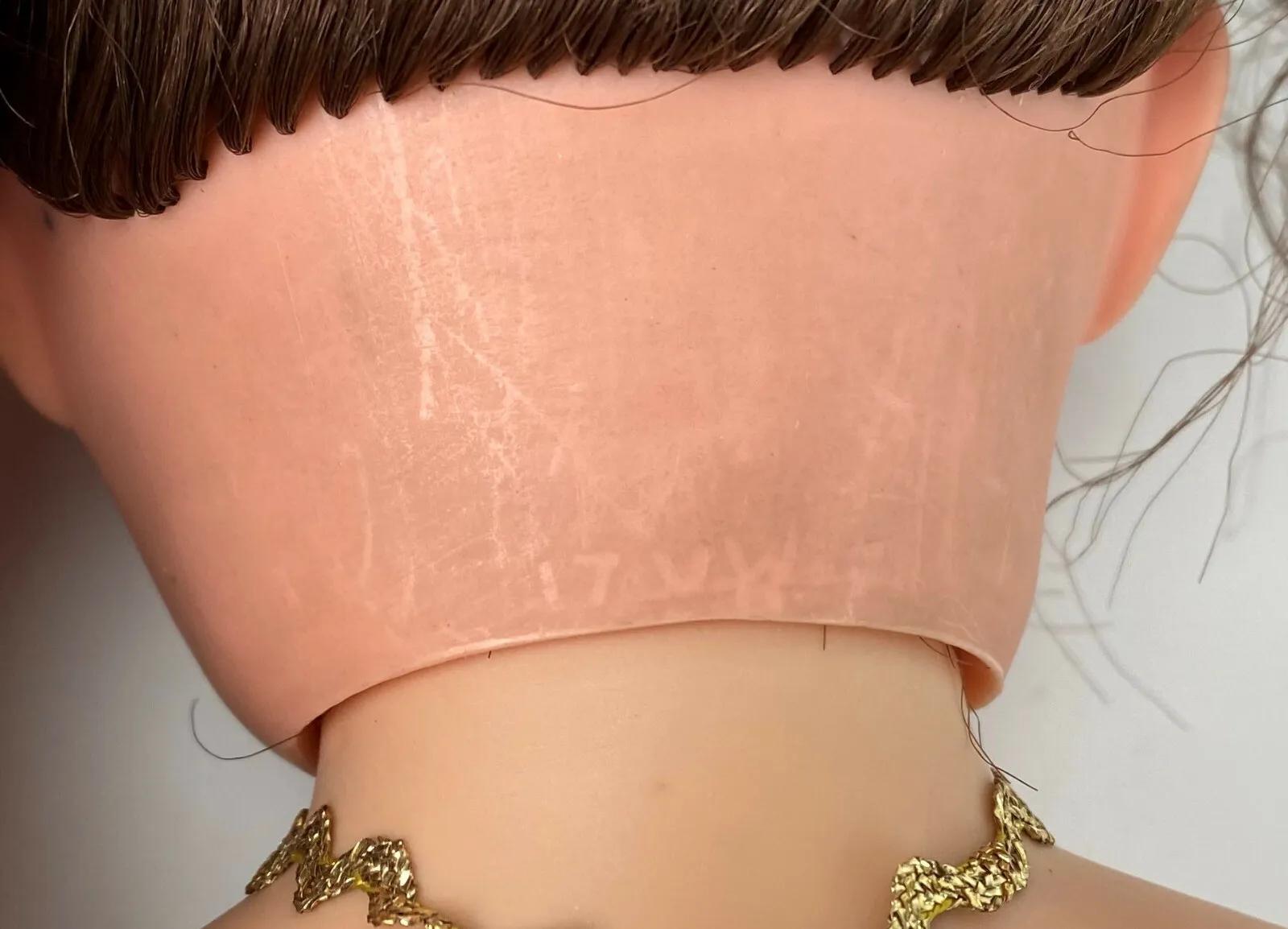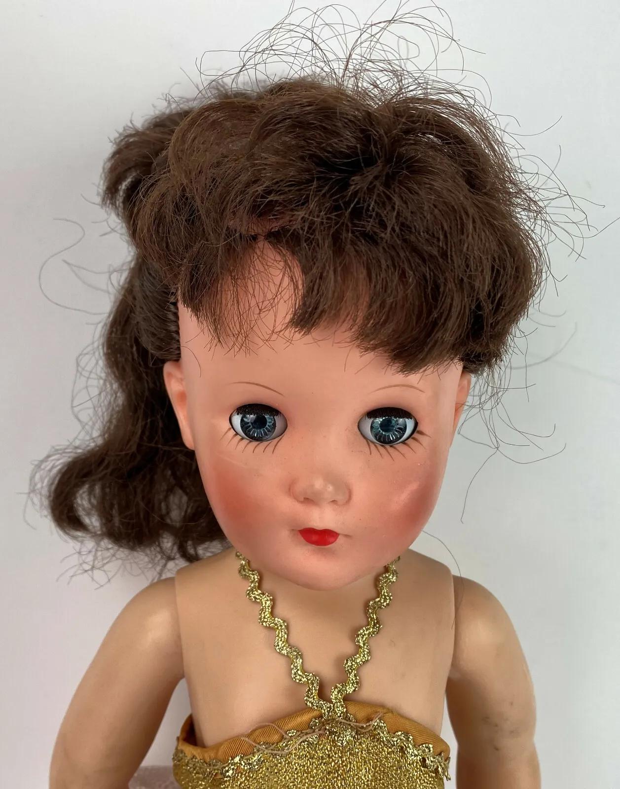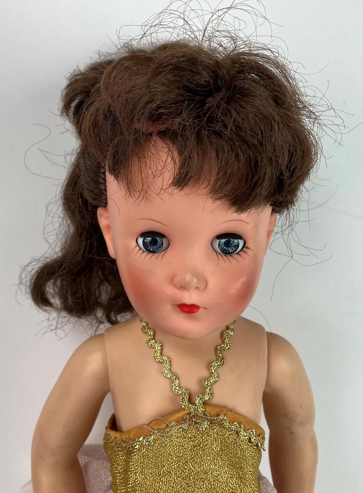 Several companies made ballerina dolls in the 1950's but I believe this lady is a 19" Ballerina Belle from the Belle Doll and Toy Company of Brooklyn, New York...In her original tutu, leotard and shoes..Hard plastic and vinyl..dark brown hair with blue sleep eyes...She may be the Scherzo #20 variation? Hair hair is disheveled..light soiling with age...tear in the back of her tights...Features rooted hair..walks on her toes..movable arms, legs, toes, knees and head...She is marked '17 VW'...Offered with no reserve...