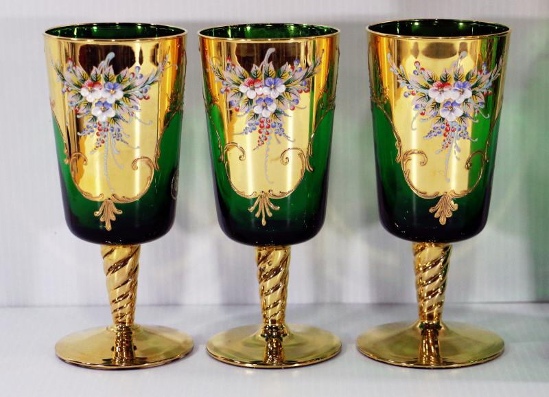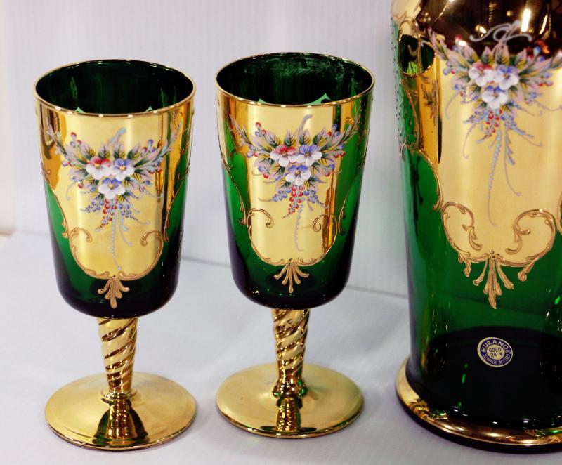 Spectacular 4-piece wine set, original Barbini Murano, Made in Italy, hand crafted with heavy layers of 24K Gold decorations, featuring a pitcher and 3 wine glasses - all in excellent condition, pre-owned set but never used, it was displayed in china cabinet only. The pitcher and 2 glasses still have original Murano tags on them, one glass has that tag missing but is also in same excellent condition, The pitcher stands 11.5" tall and each glass is 6.5" tall - beautiful find, very rare on any market, amazing addition to any collection and great idea for one of the kind gift.