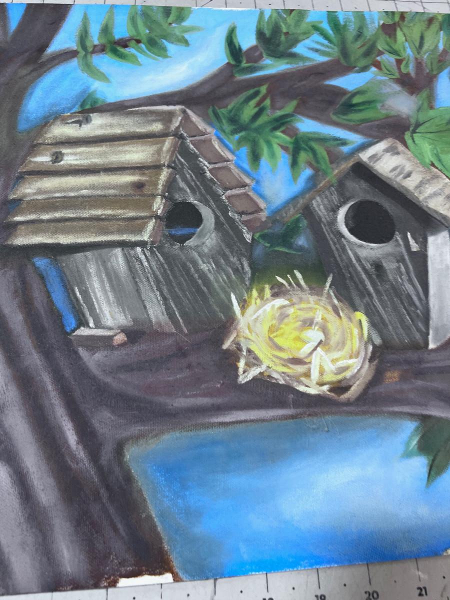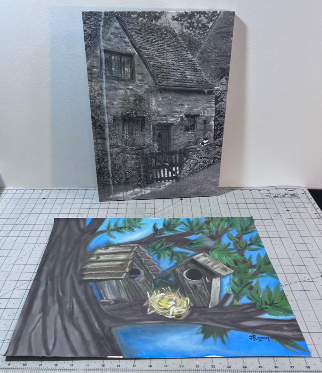 Original Bird House Painting and a Print of a Cottage