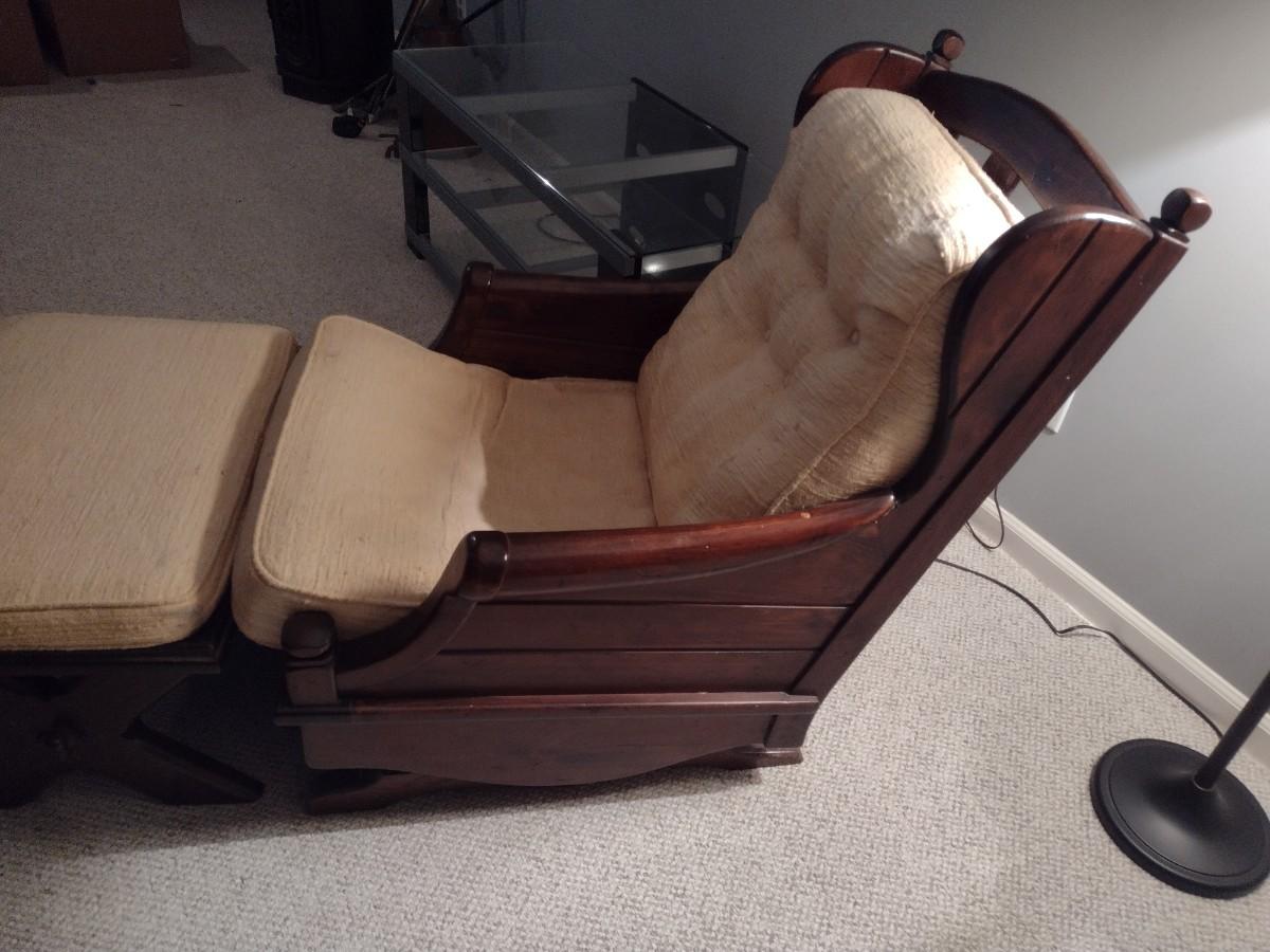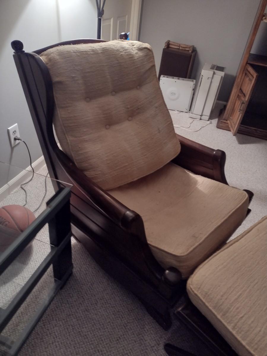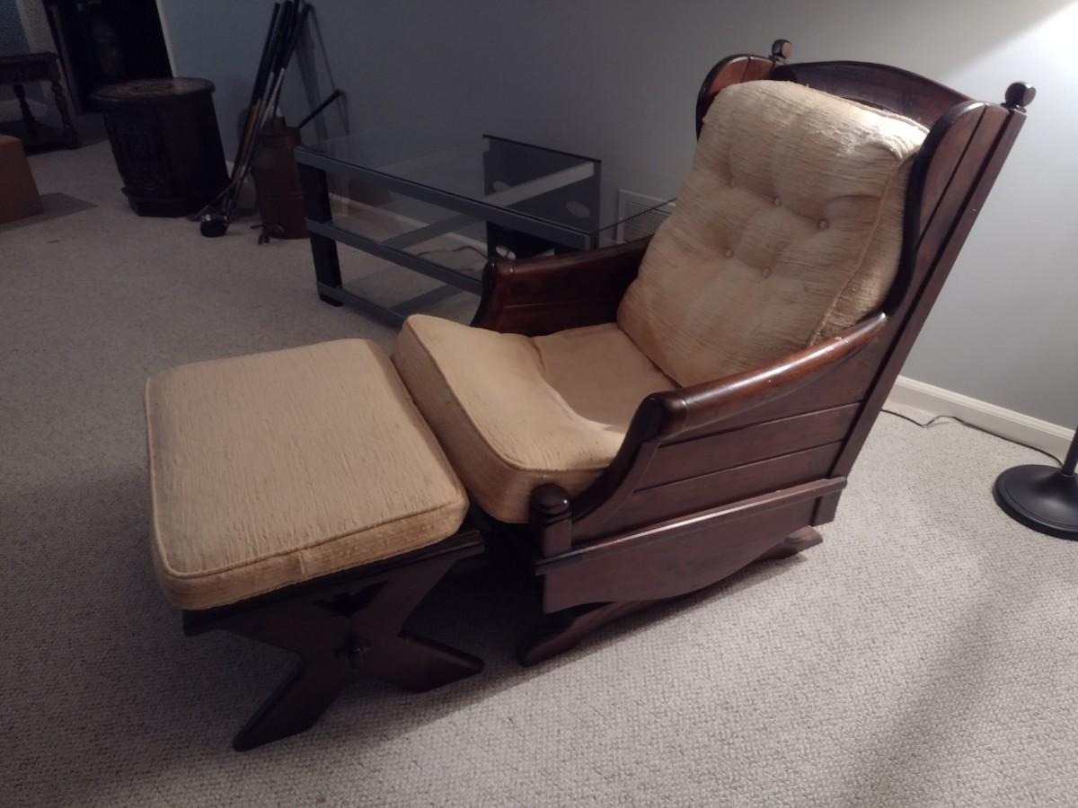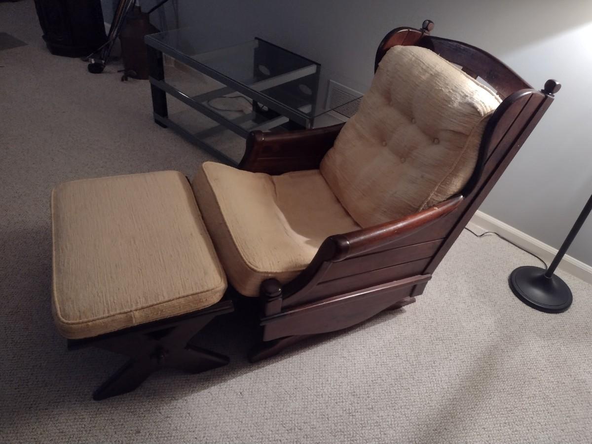Boone Trail Collection by Royal Maxwell Solid Wood Rocker Chair with Ottoman. Seat cushion appears to be broken down. Under strapping may need to be replaced.