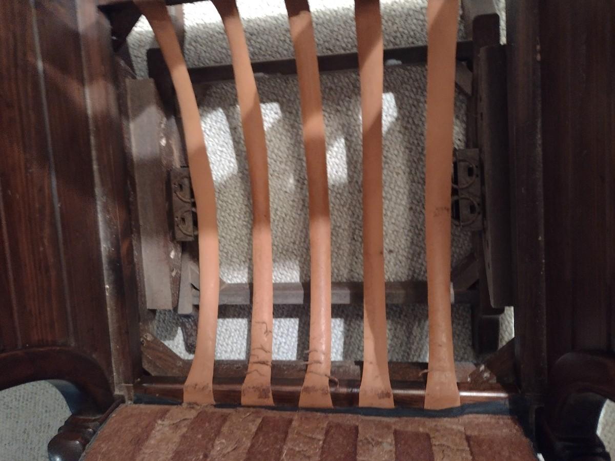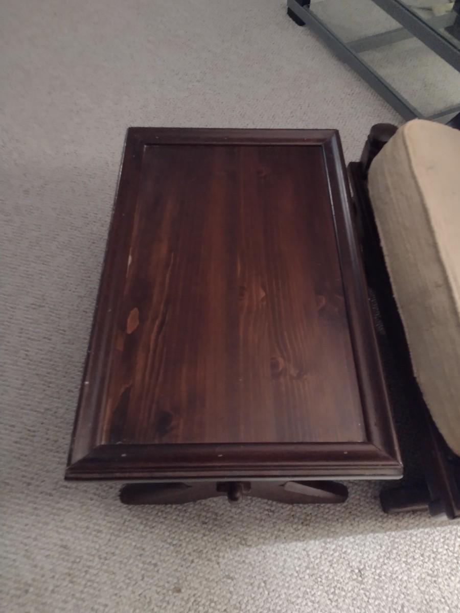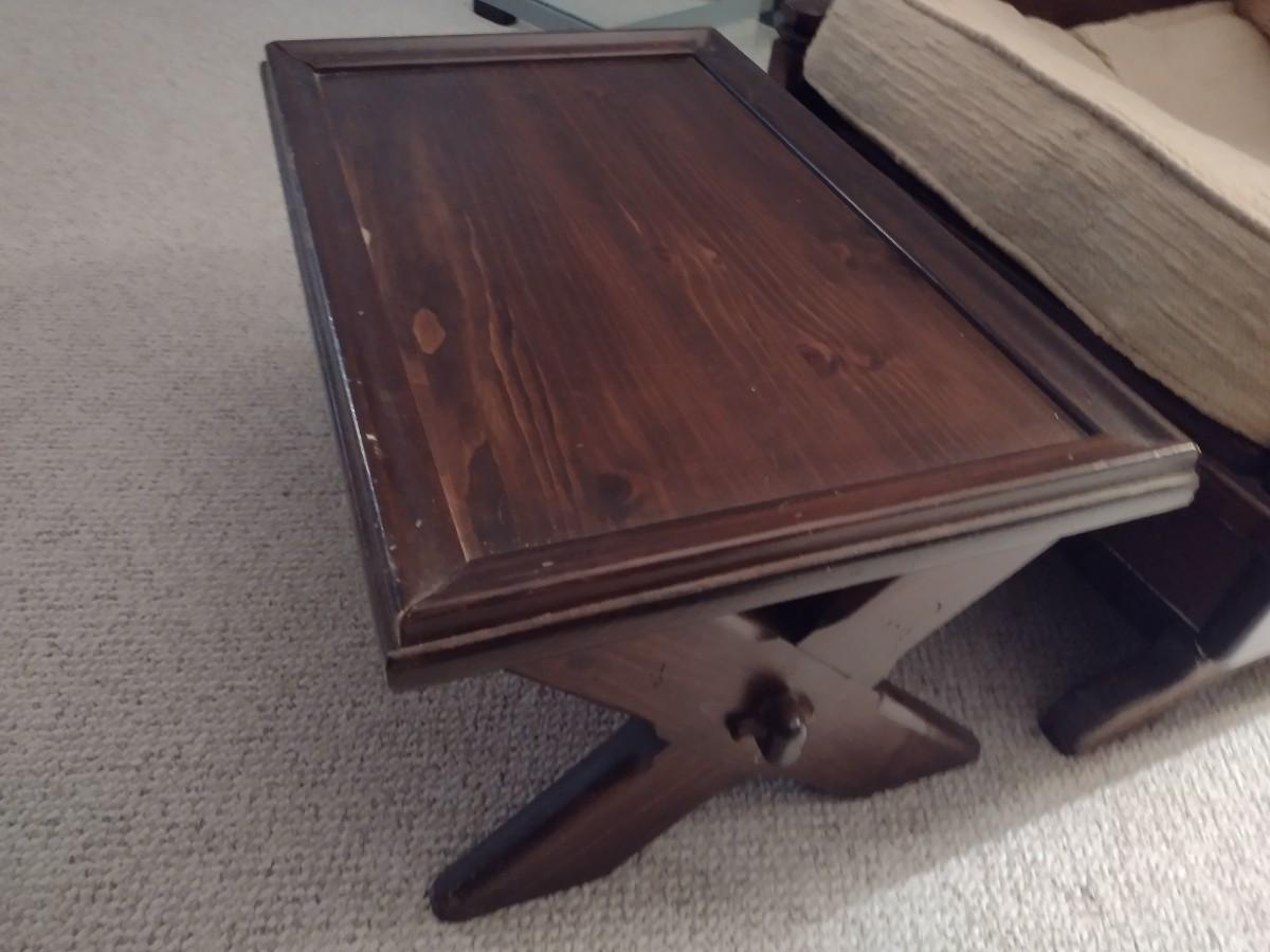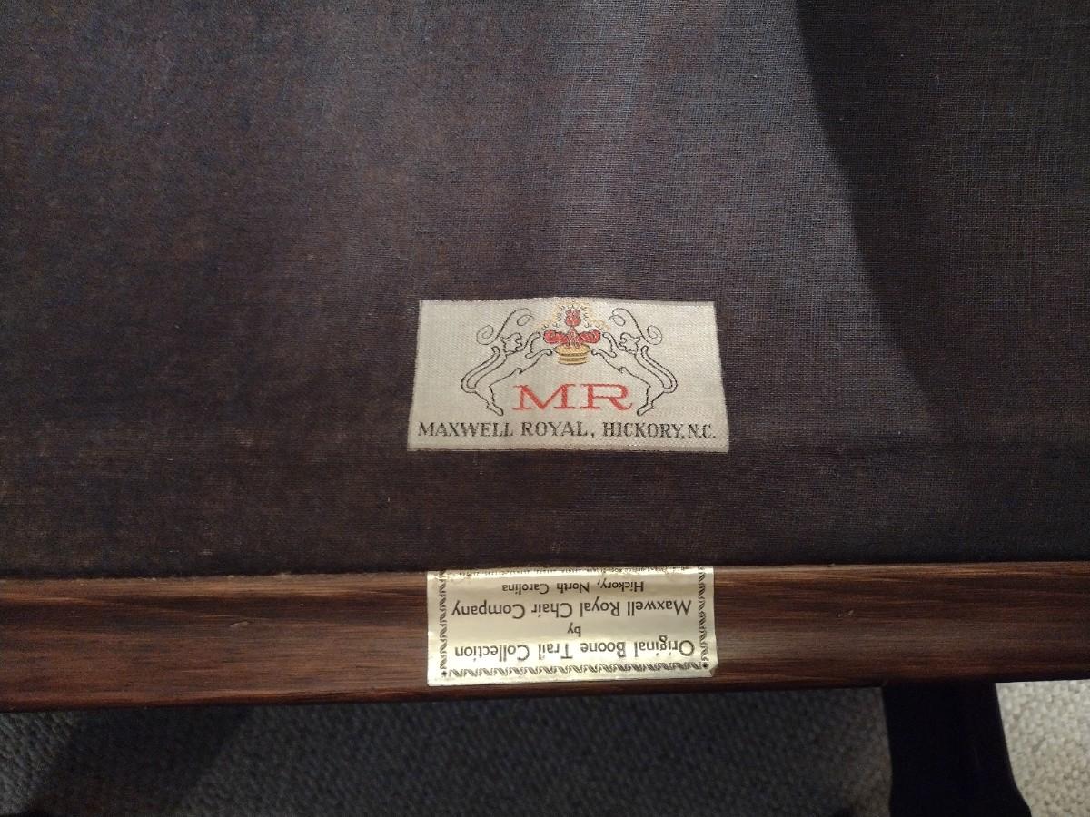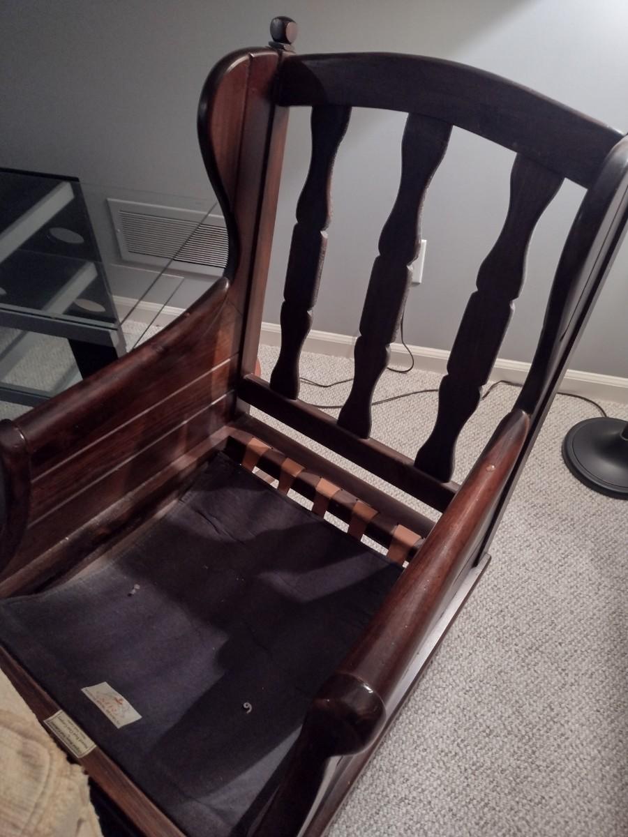 Boone Trail Collection by Royal Maxwell Solid Wood Rocker Chair with Ottoman. Seat cushion appears to be broken down. Under strapping may need to be replaced.
