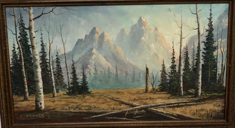 Here is a western mountain landscape oil on canvas by Burton Farrar....Signed..Framed..22 x 13"...Circa 1940's-60's...