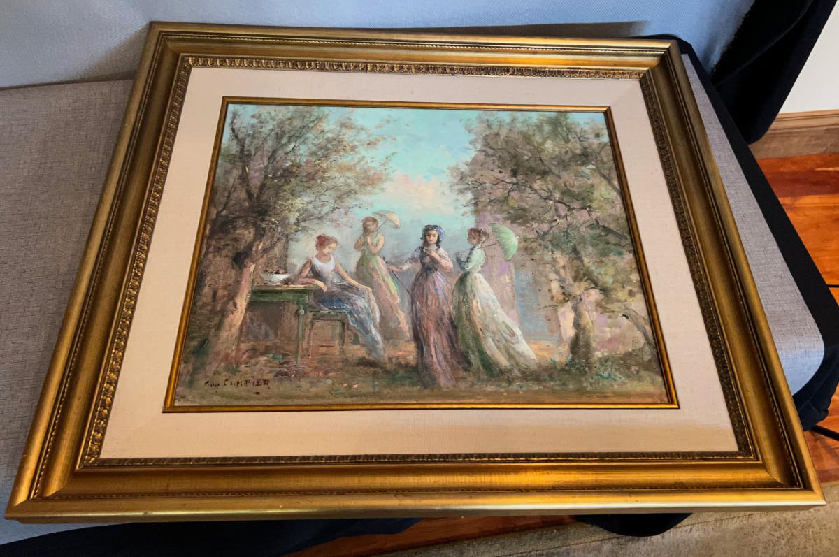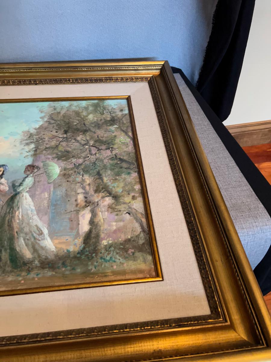 Lovely! Feminine, Gals Group in the Garden. Real PAINTING. Collector Investment Art Item! 32 x 24. Slight nick on the frame.