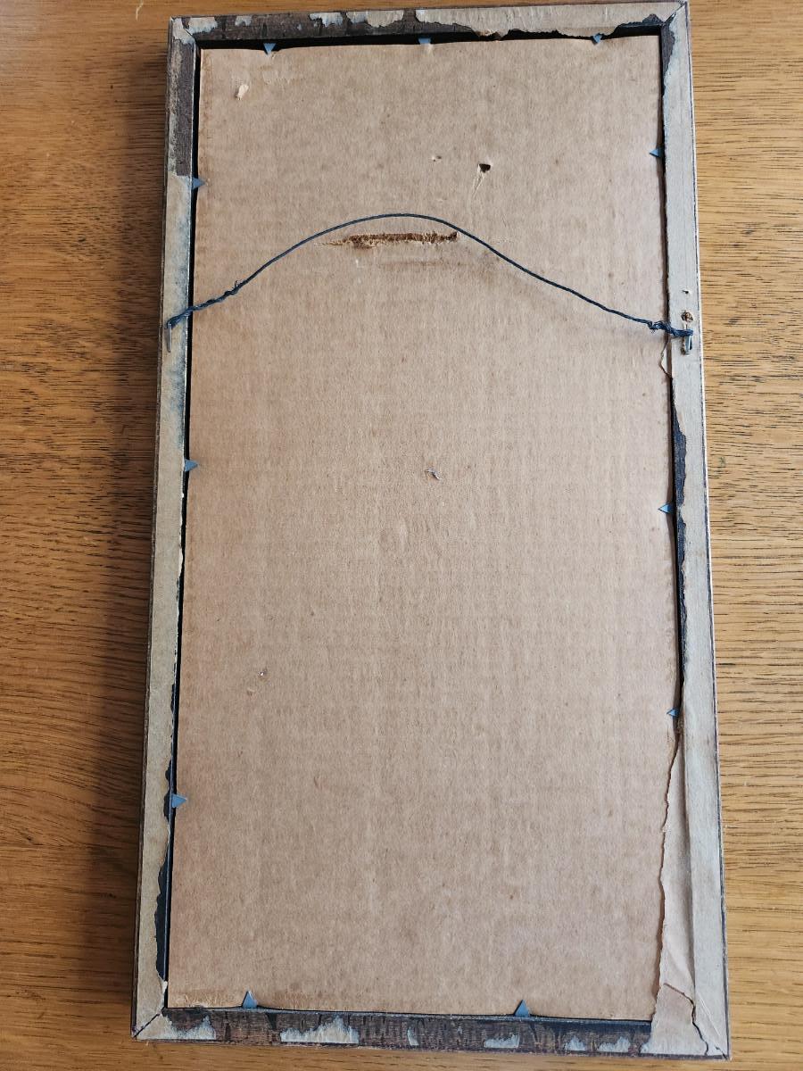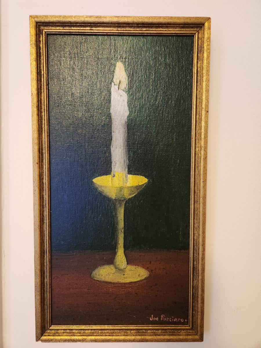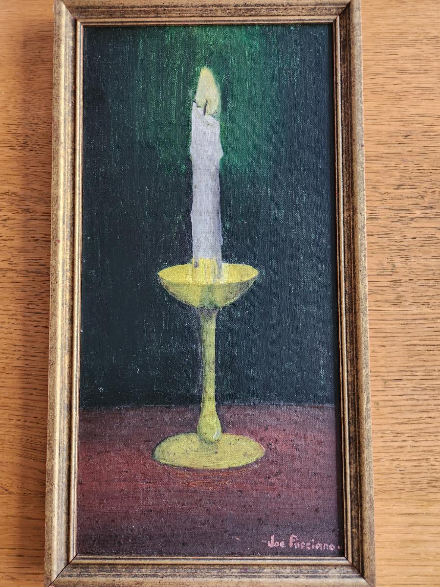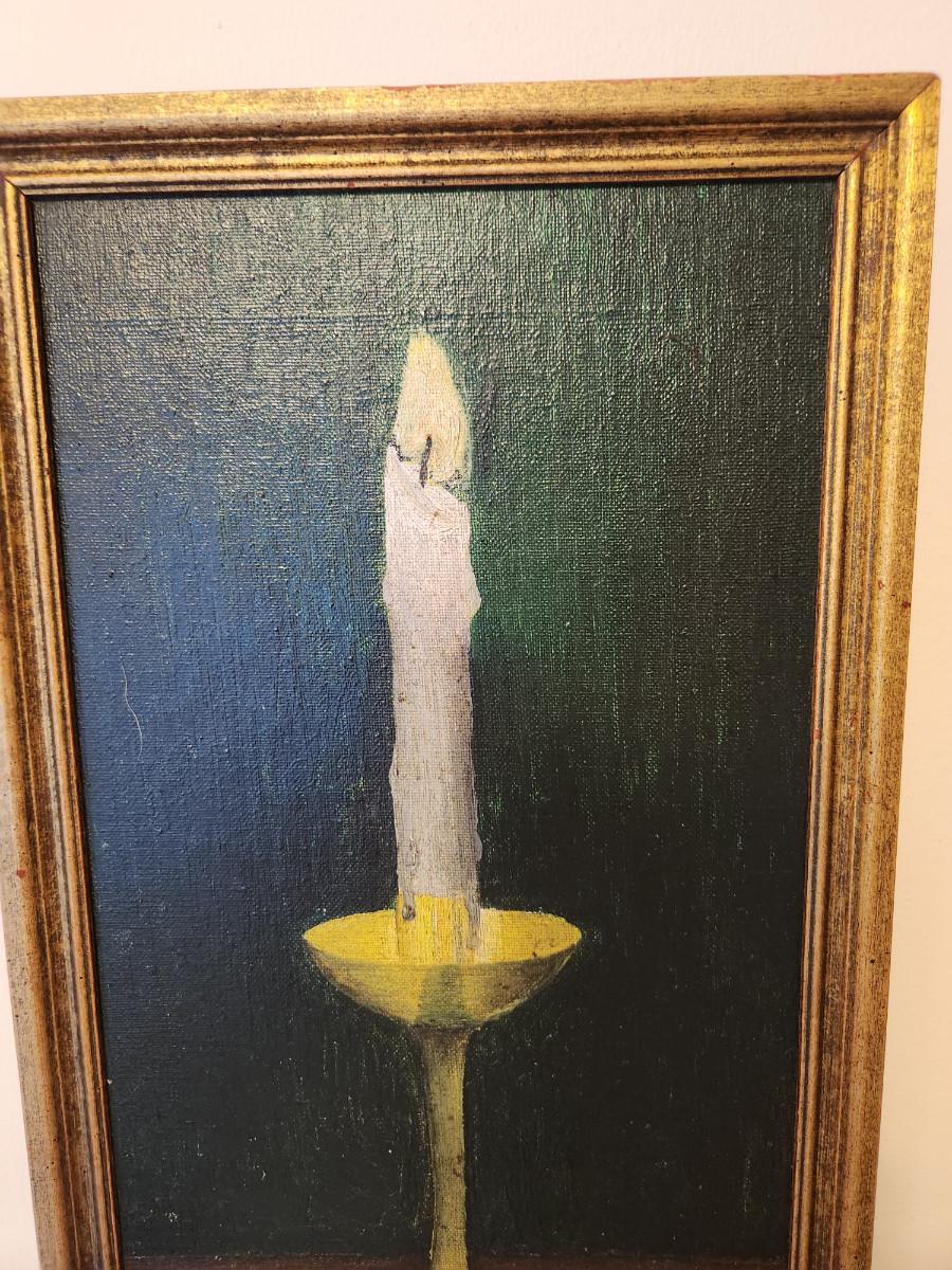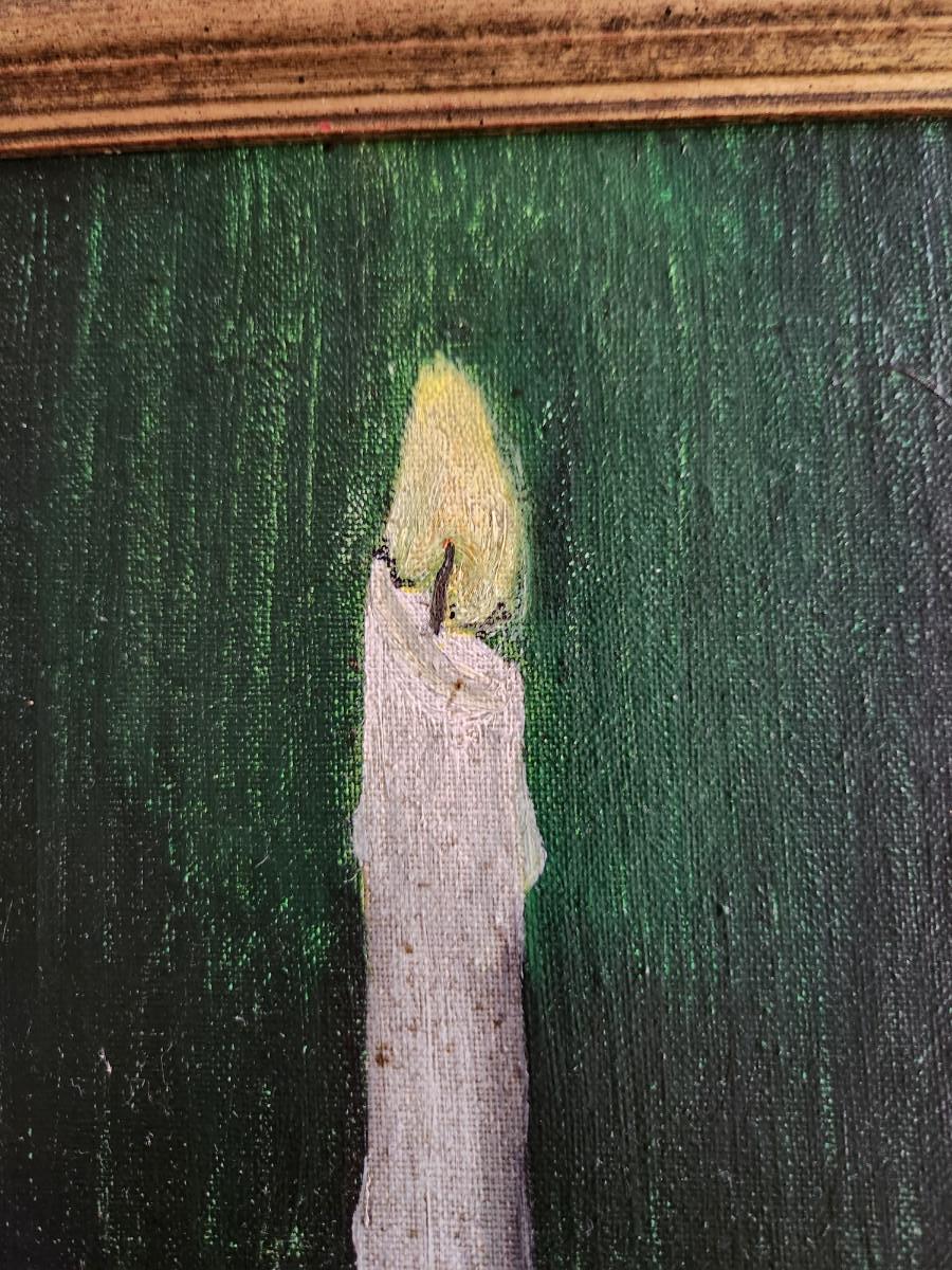 This auction lot is for an Original Candle Painting. This painting - found in an old barn, has been cleaned and is ready for hanging on your wall. This oil on canvas board is nicely framed and measures about 11X17-inches. Signed in lower right hand corner. Unusual subject and style.