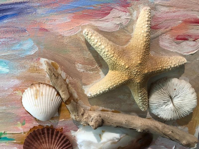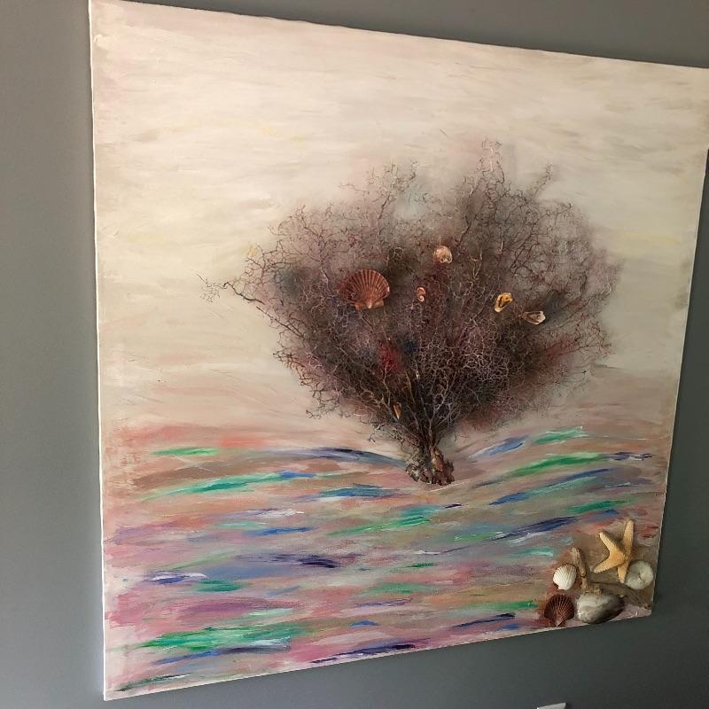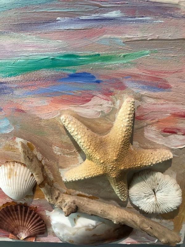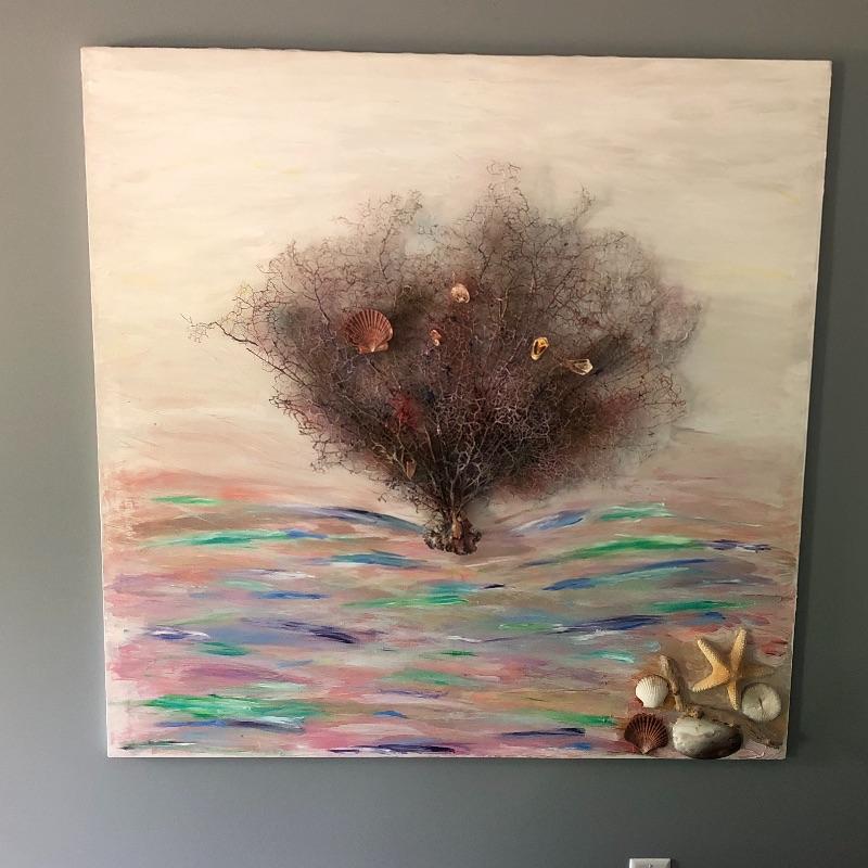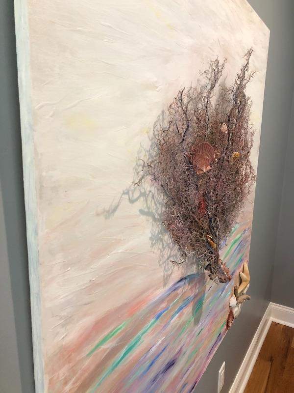 Original artwork created by Ms. Houle. Peaceful blend of bold and muted colors and a comfy beach vibe. Approximately 48 inches x 48 inches, lightweight and ready to hang.