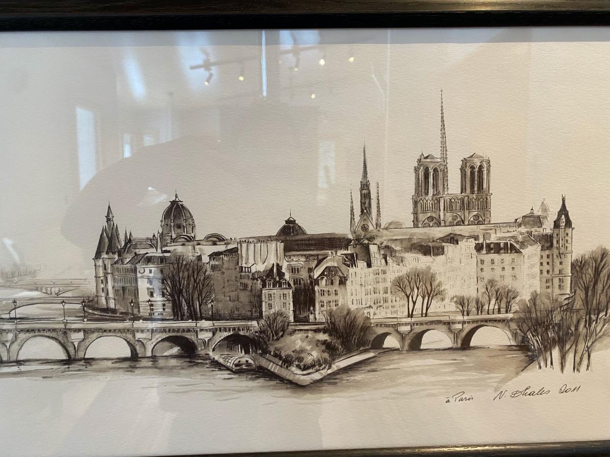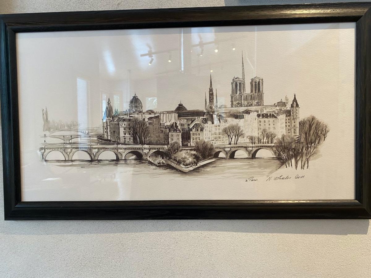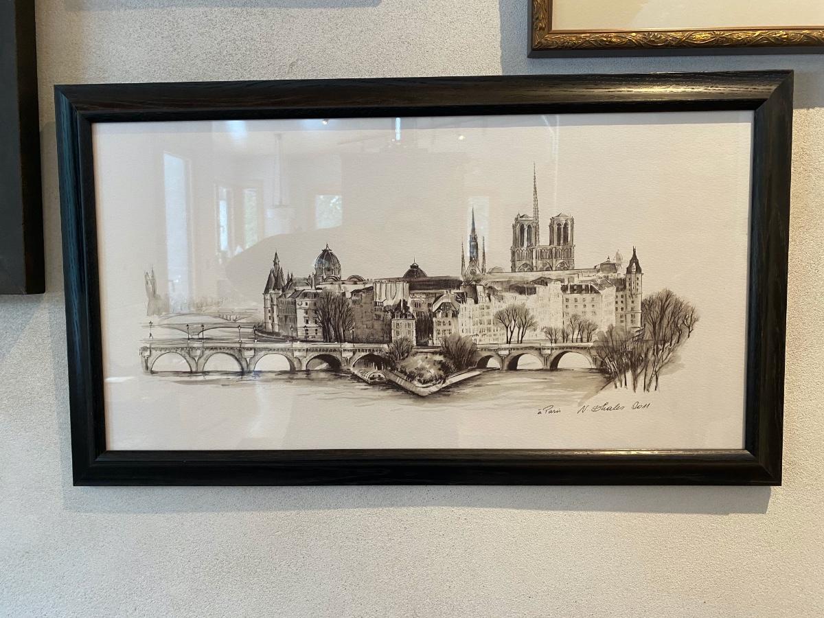 An original charcoal rendering of Paris with Notre Dame. In a beautiful wooden frame.