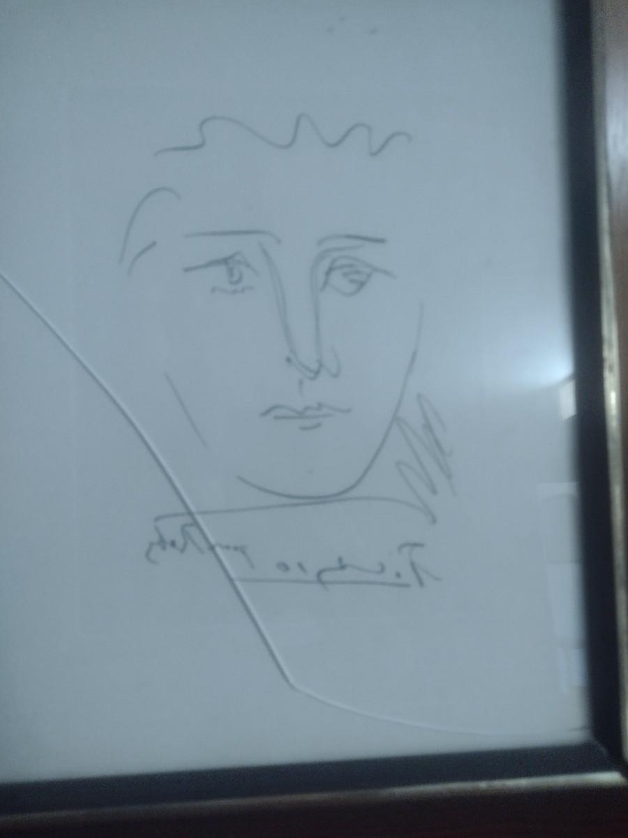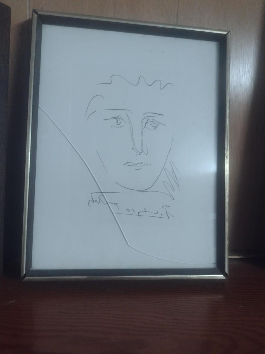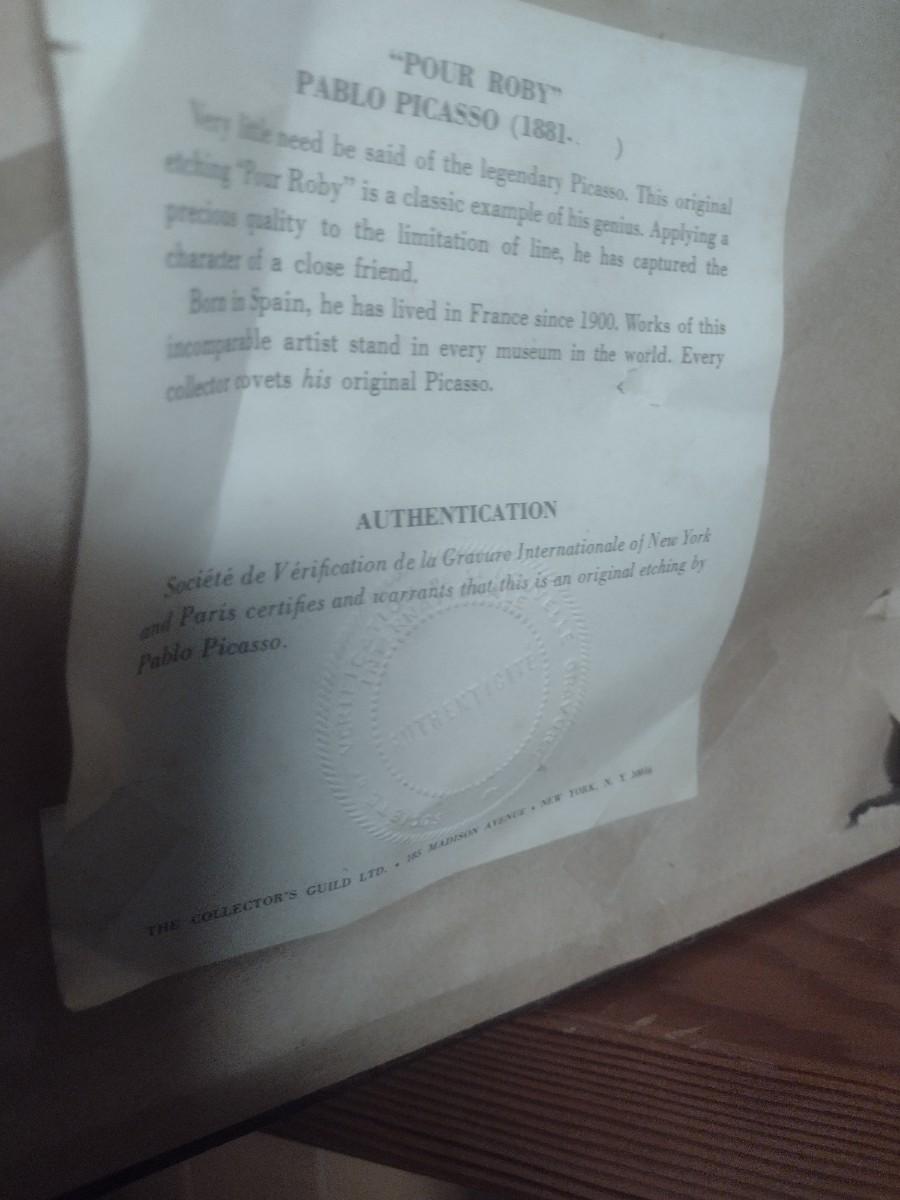 Original Etching by Pablo Picaso 'Pour Roby' with Authentication. Has cracked glass