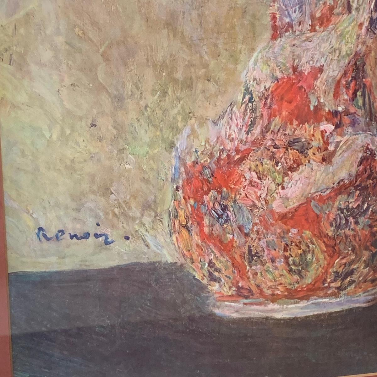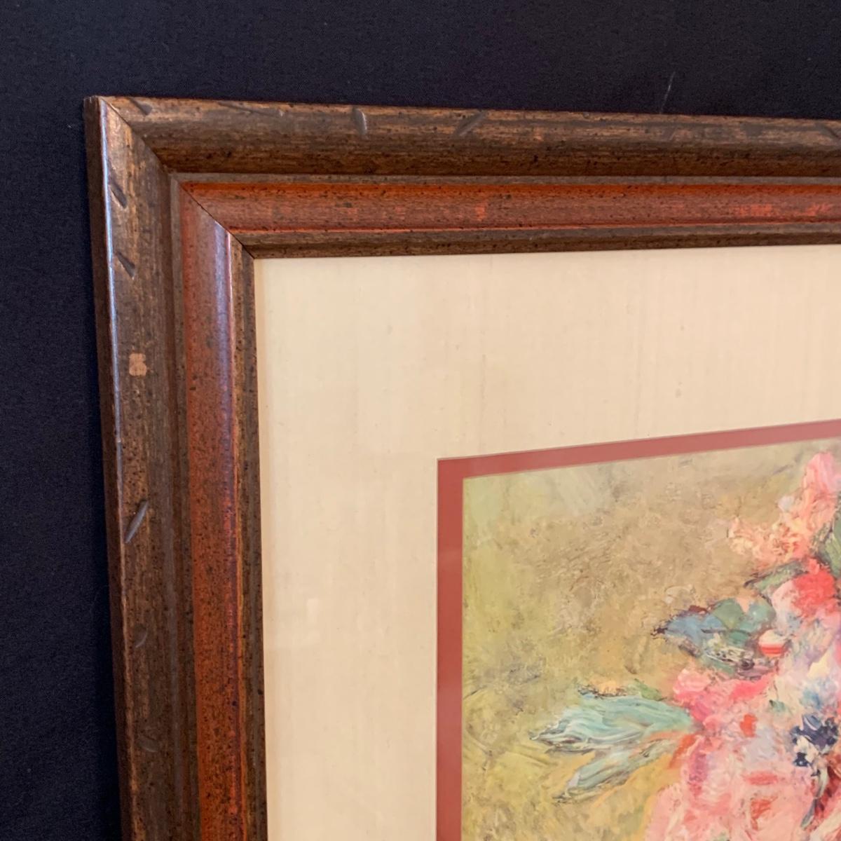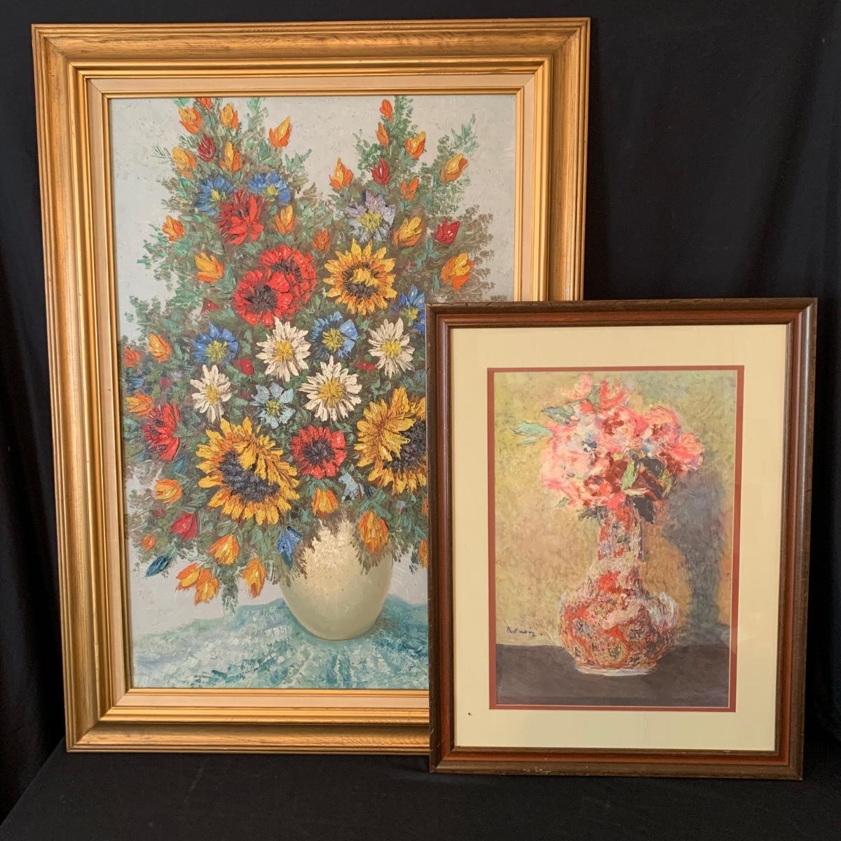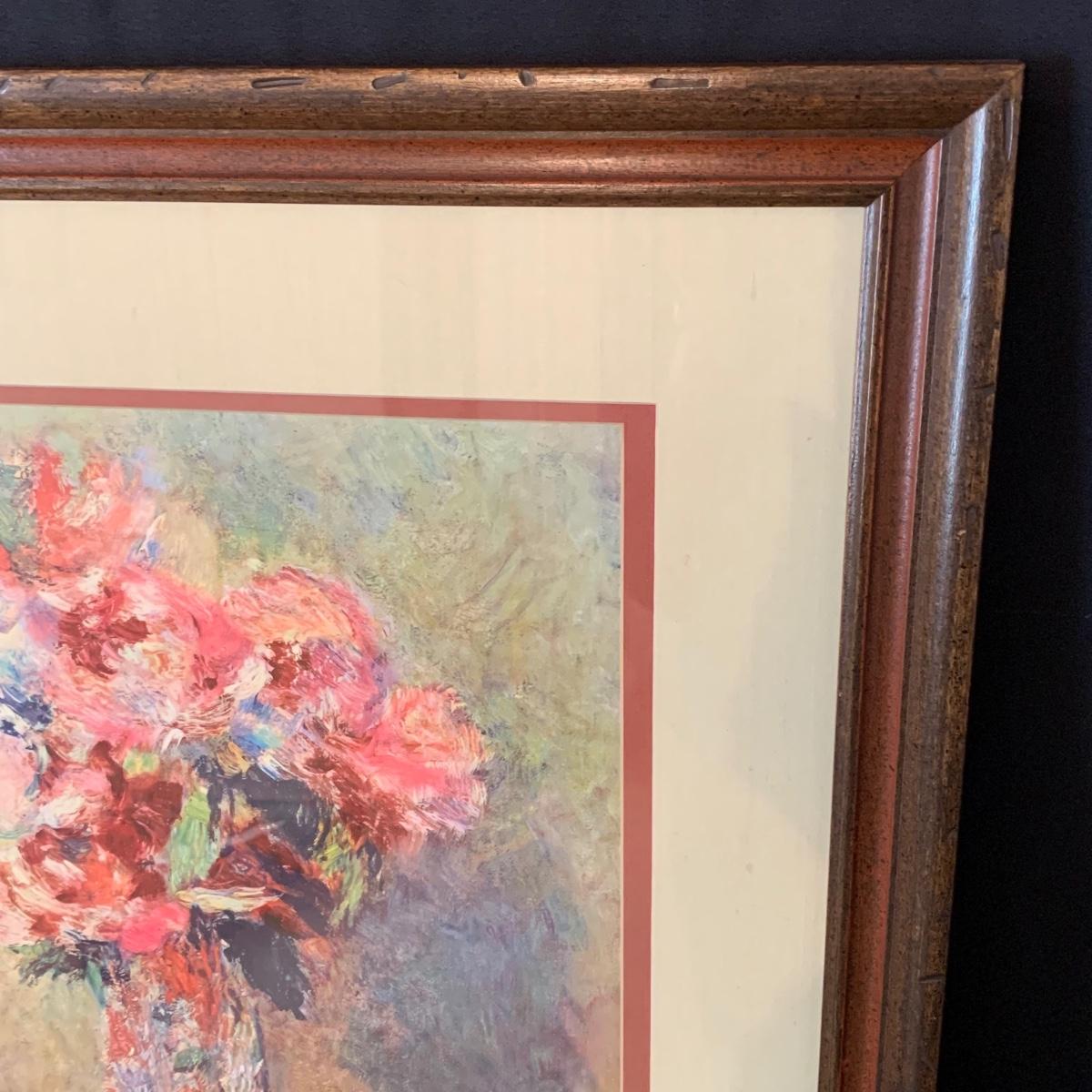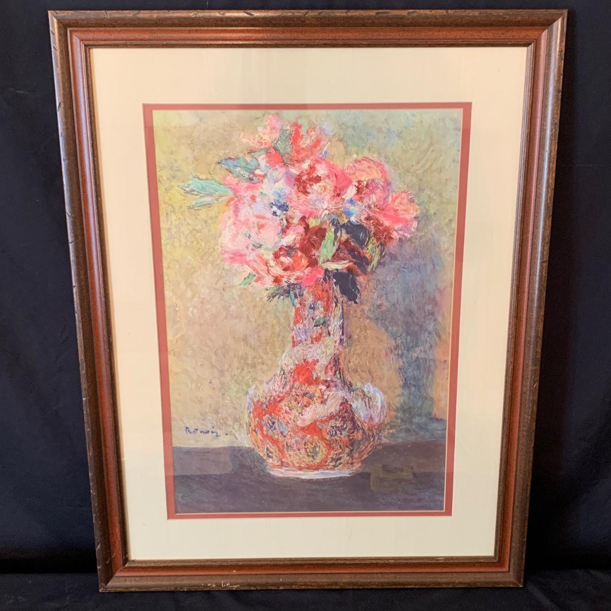 Original painting of vibrant flowers signed by the artist. Painting is in a 32” x 43.5”H wooden frame that has been painted gold. The frame has an inner fabric border. A few small nicks are seen on the frame; see photos. A smaller framed print of a Renoir painting is also included. Print is double matted, behind glass, and framed in a 22” x 28”H wood frame.
