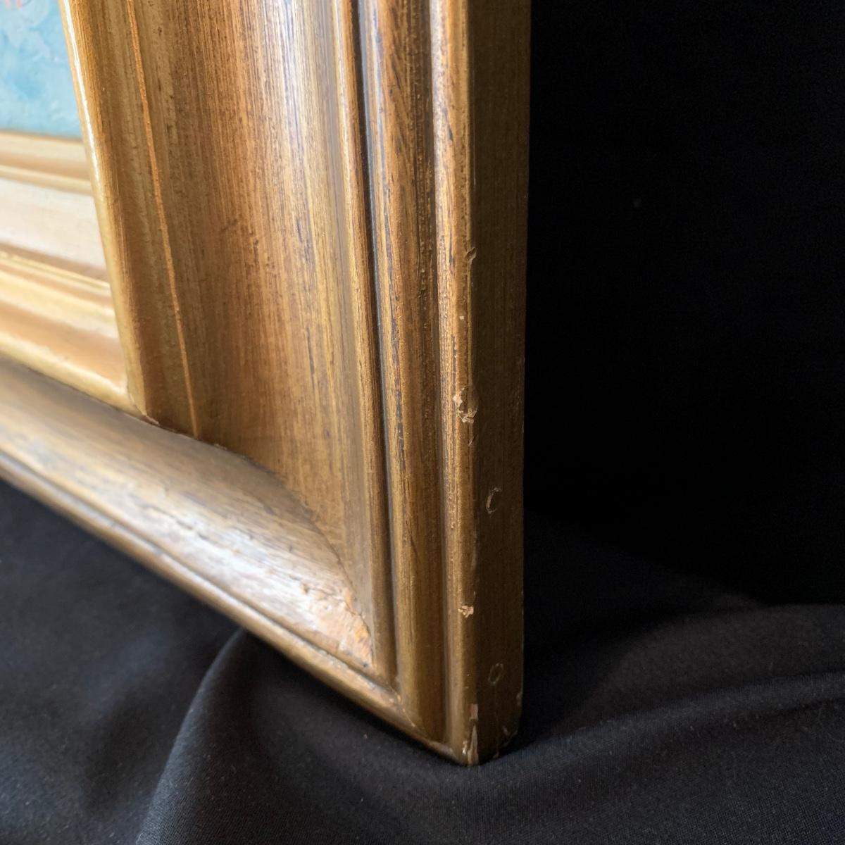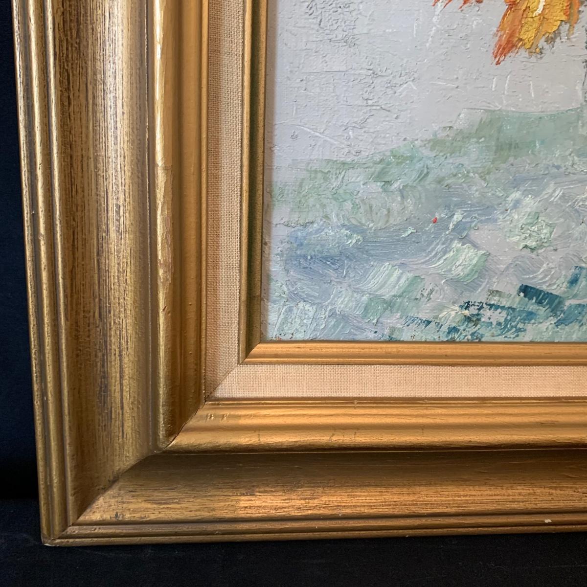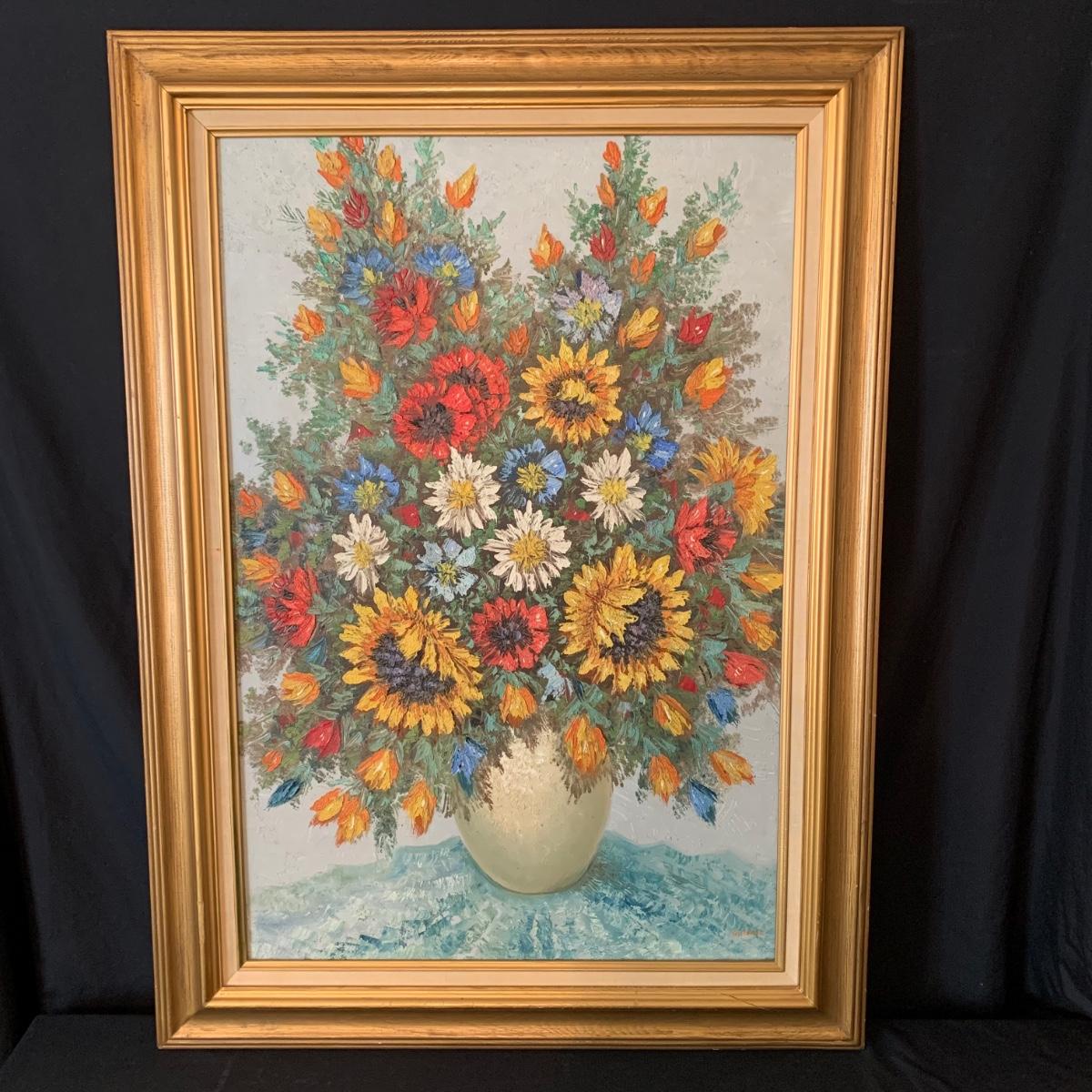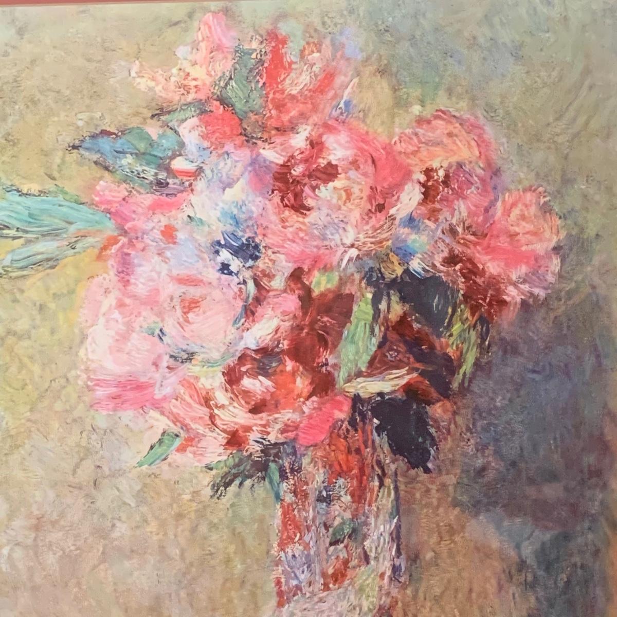 Original painting of vibrant flowers signed by the artist. Painting is in a 32” x 43.5”H wooden frame that has been painted gold. The frame has an inner fabric border. A few small nicks are seen on the frame; see photos. A smaller framed print of a Renoir painting is also included. Print is double matted, behind glass, and framed in a 22” x 28”H wood frame.