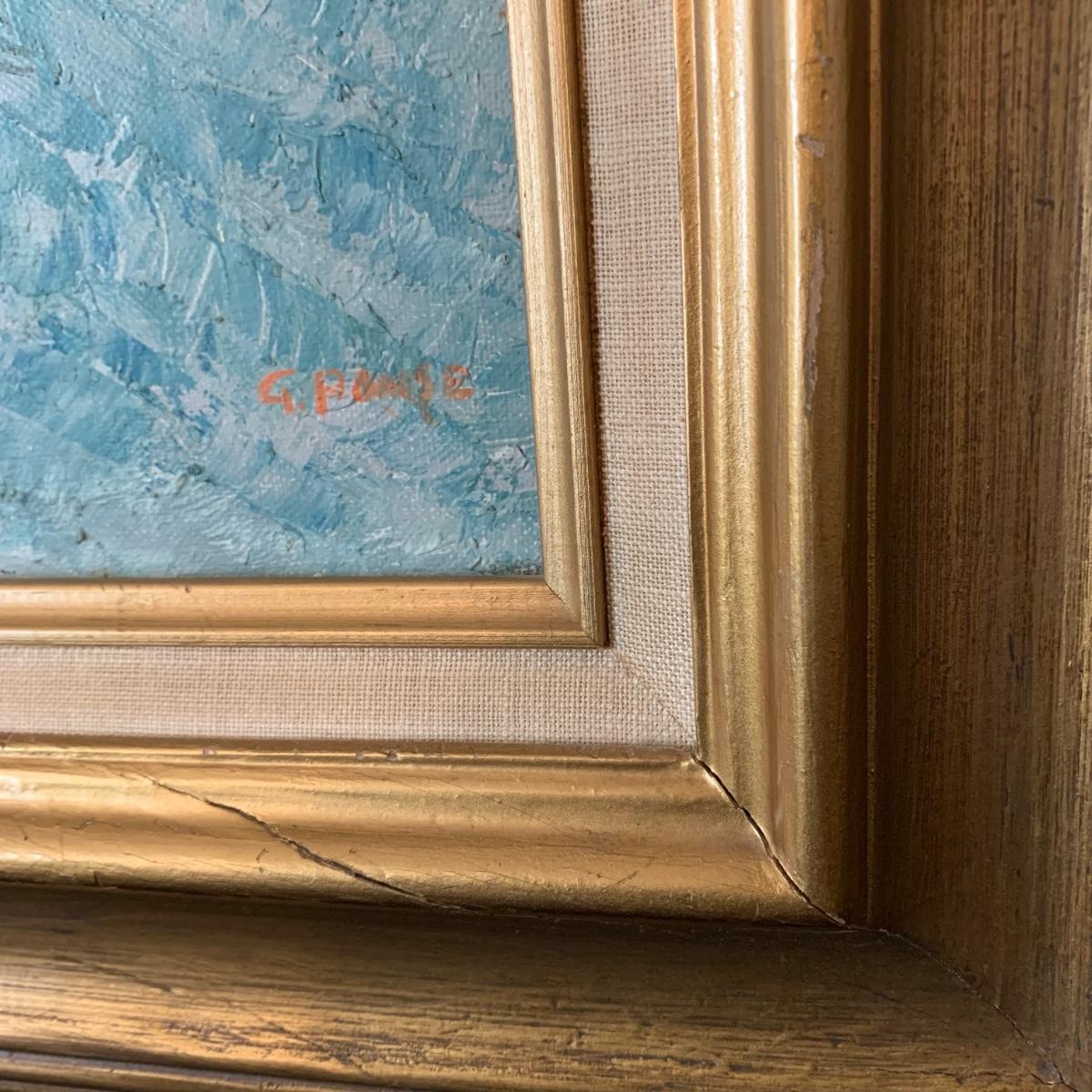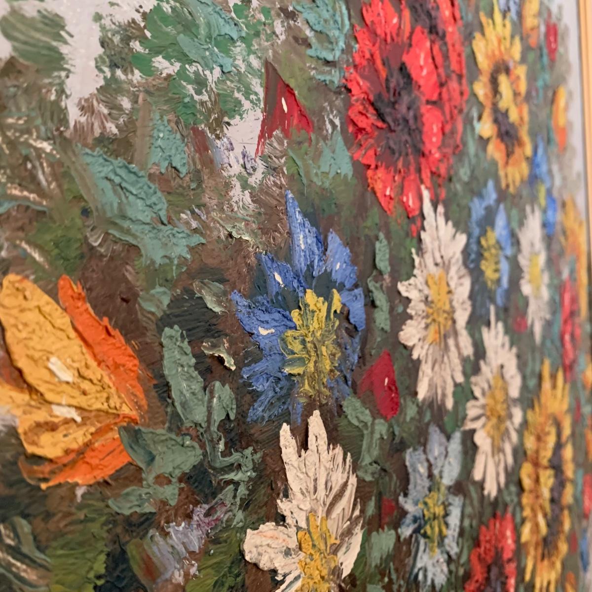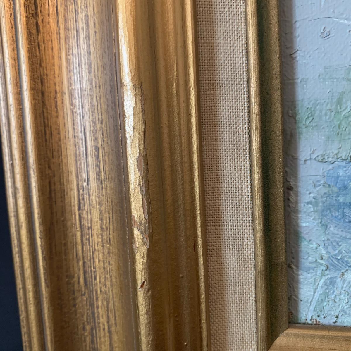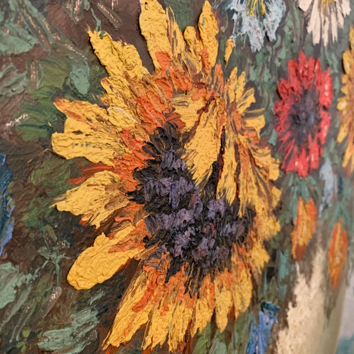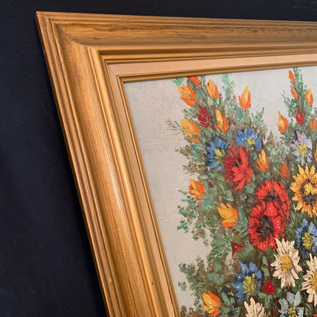 Original painting of vibrant flowers signed by the artist. Painting is in a 32” x 43.5”H wooden frame that has been painted gold. The frame has an inner fabric border. A few small nicks are seen on the frame; see photos. A smaller framed print of a Renoir painting is also included. Print is double matted, behind glass, and framed in a 22” x 28”H wood frame.