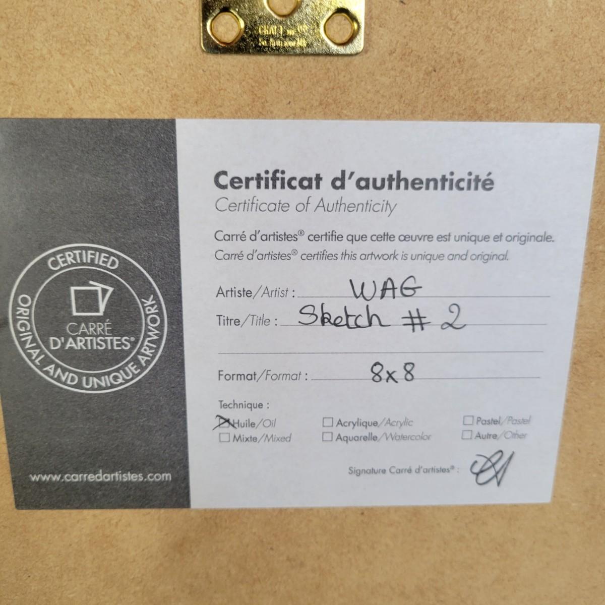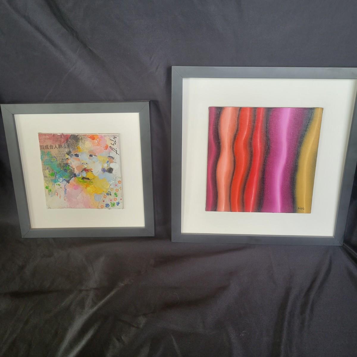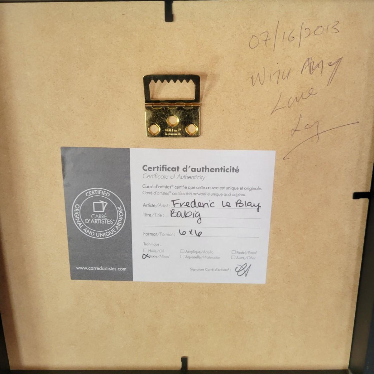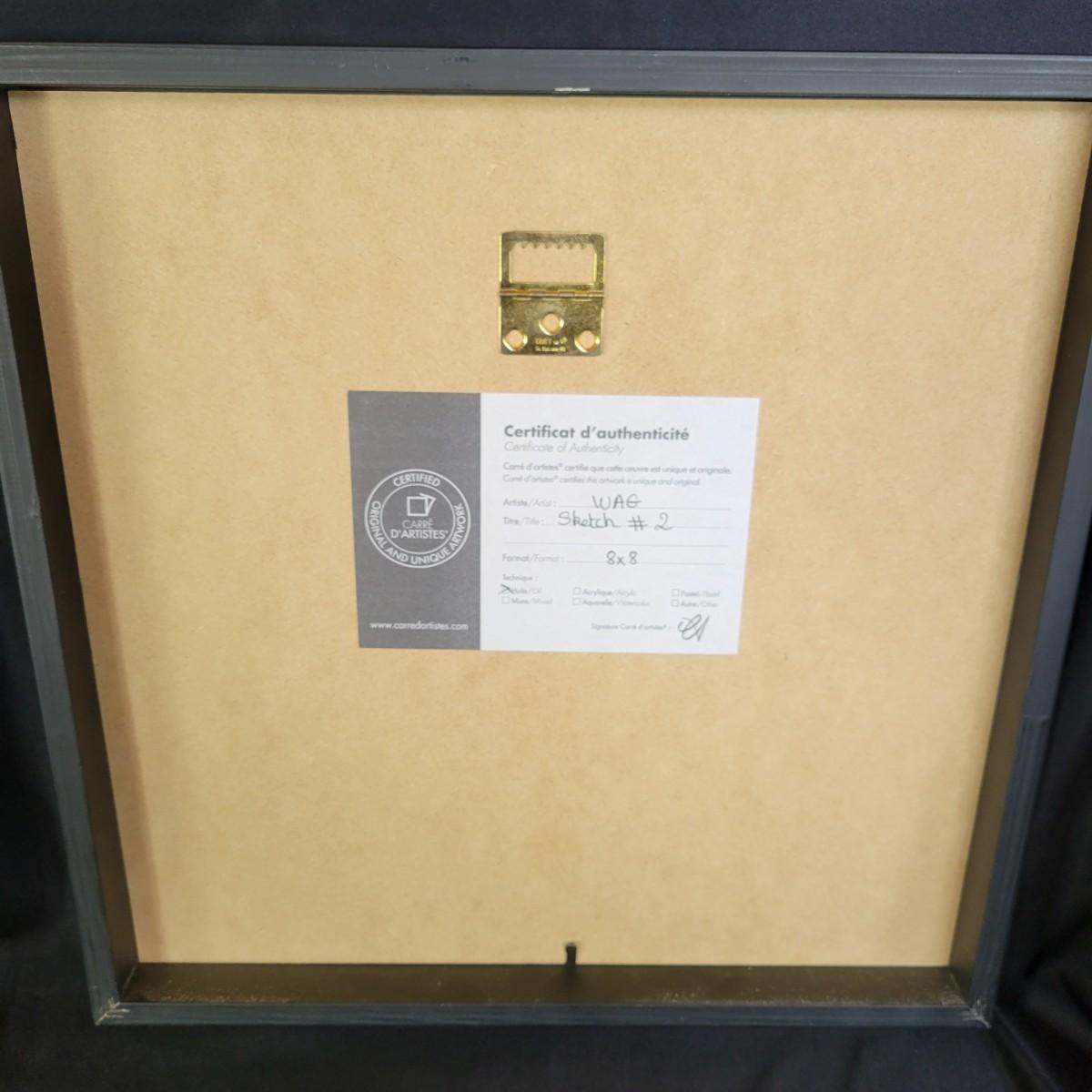 A pair of original art pieces in good condition with no notable damage. Included is a piece of original mixed media by artist Frédéric Le Blay. It is in a wooden black frame with a cream colored mat. The piece is on a canvas panel and measures approximately 10.5" x 10.5" x 1.5". Also included is an impressionistic original oil on a canvas panel. This piece is painted by WAG and features a black wooden frame and a cream colored mat. This piece measures approximately 13.5" x 13.5" x 1.5". Both pieces have certificates of authenticity. Shipping available. Shipping art can be costly. We suggest calling our local UPS with dimensions and getting an estimate before bidding: (828) 252-6930.