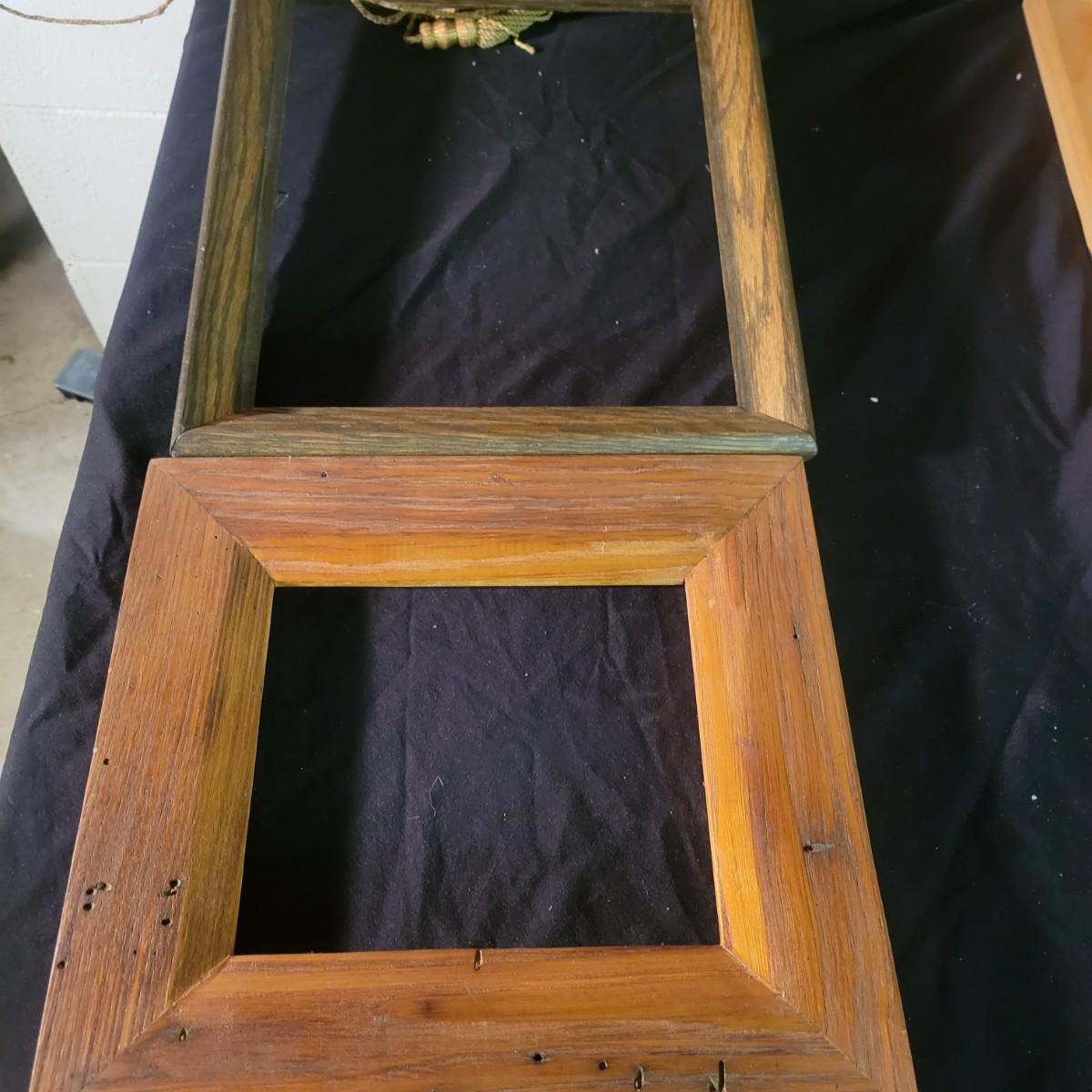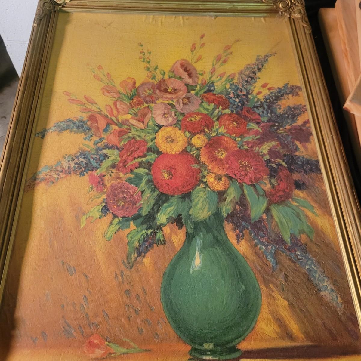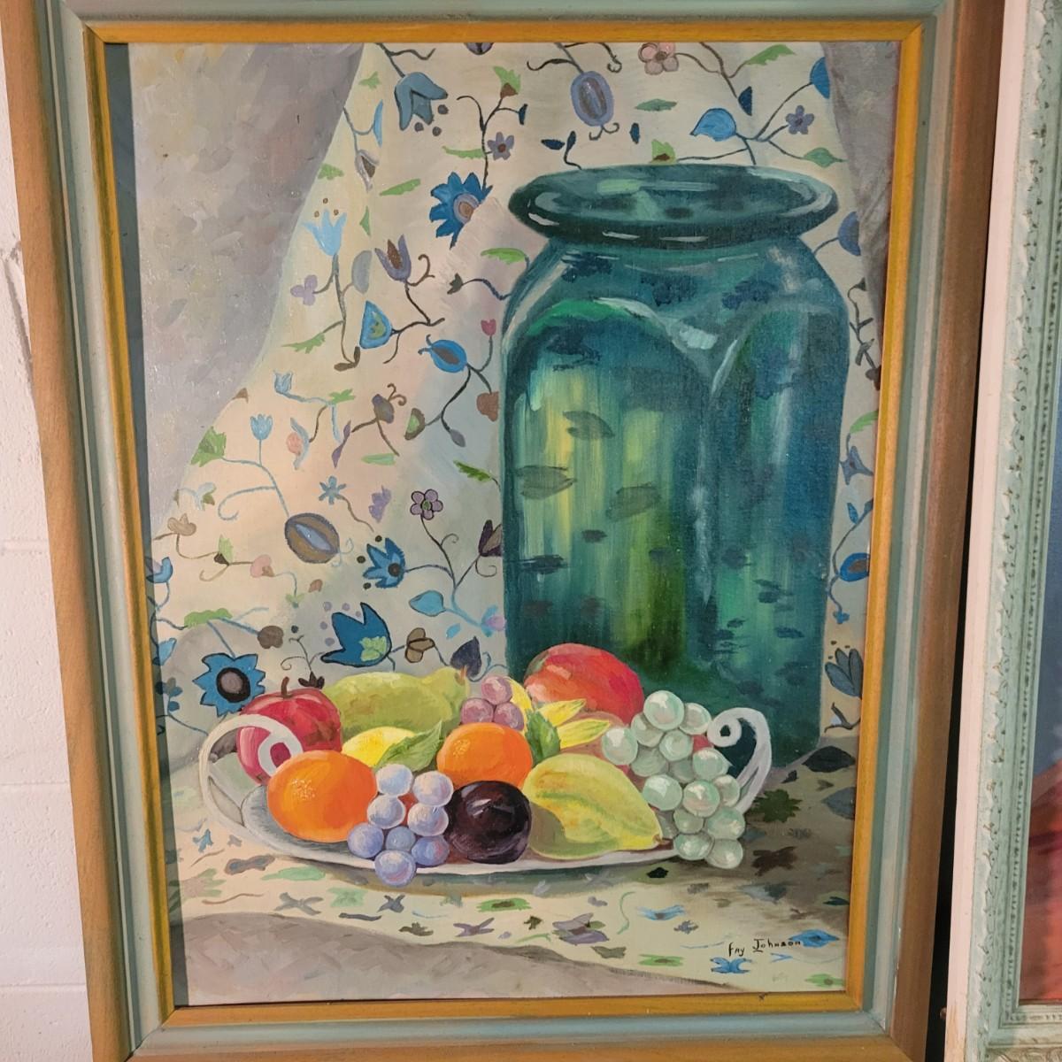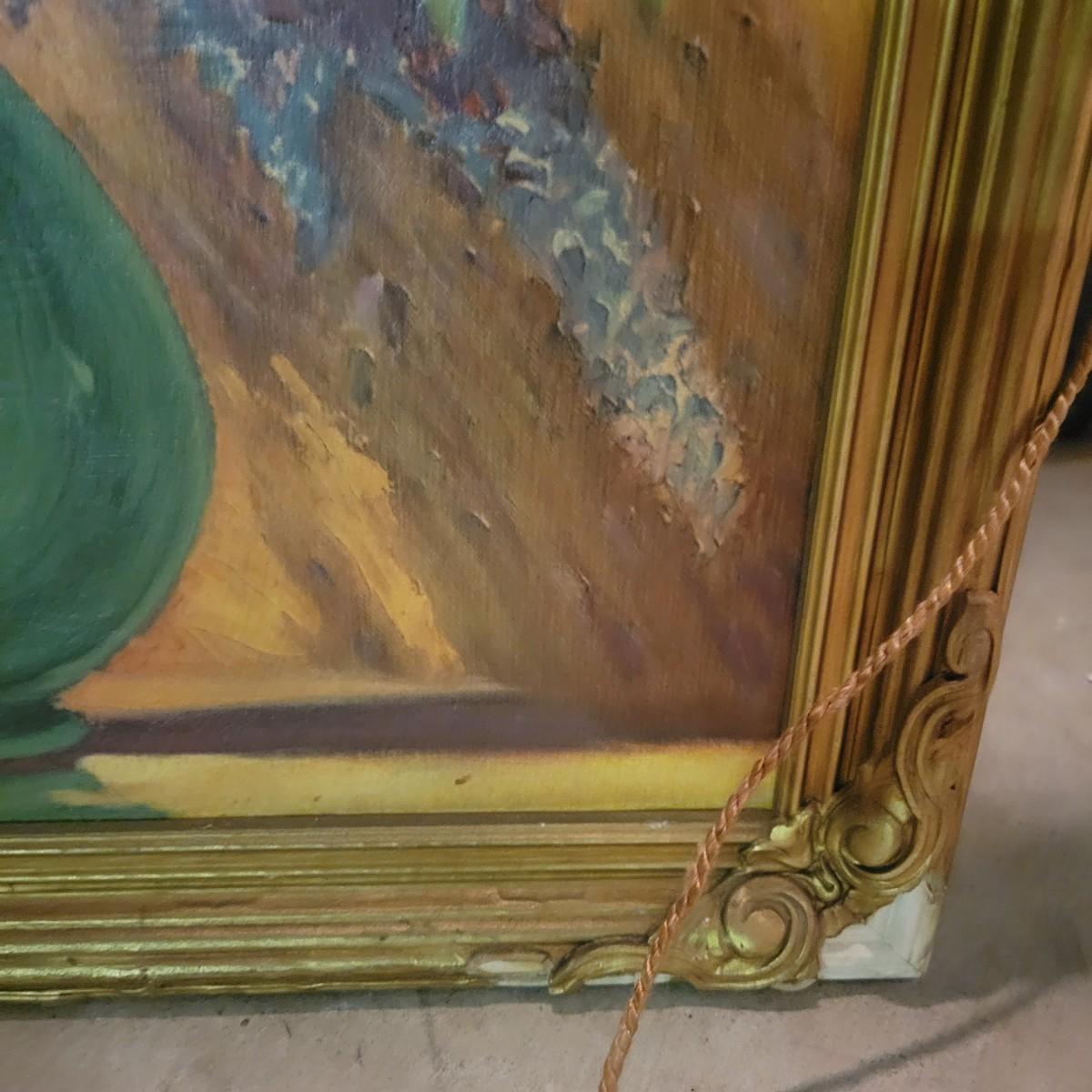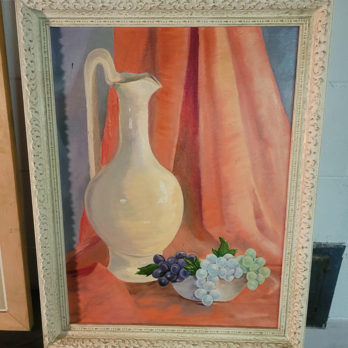 This is a lot of 2 framed original oil paintings, a framed print, four unstained wood, and two stained wood frames in good condition. The oil paintings are of fruit and vases with wooden frames. One is white and ornate, the other is gold with a blue stripe in it. These measure approximately 22" x 28" x 2". The floral piece is a print mounted on dense board with a coating to imitate an original. Frame is wood with ornate corners and does show some damage. Also included is four raw wood frames measuring approximately 11" x 17" x 1". Additionally, there are two stained wooden frames. Shipping available. Shipping Art can be costly please call UPS store at 828-252-6930 for quote
