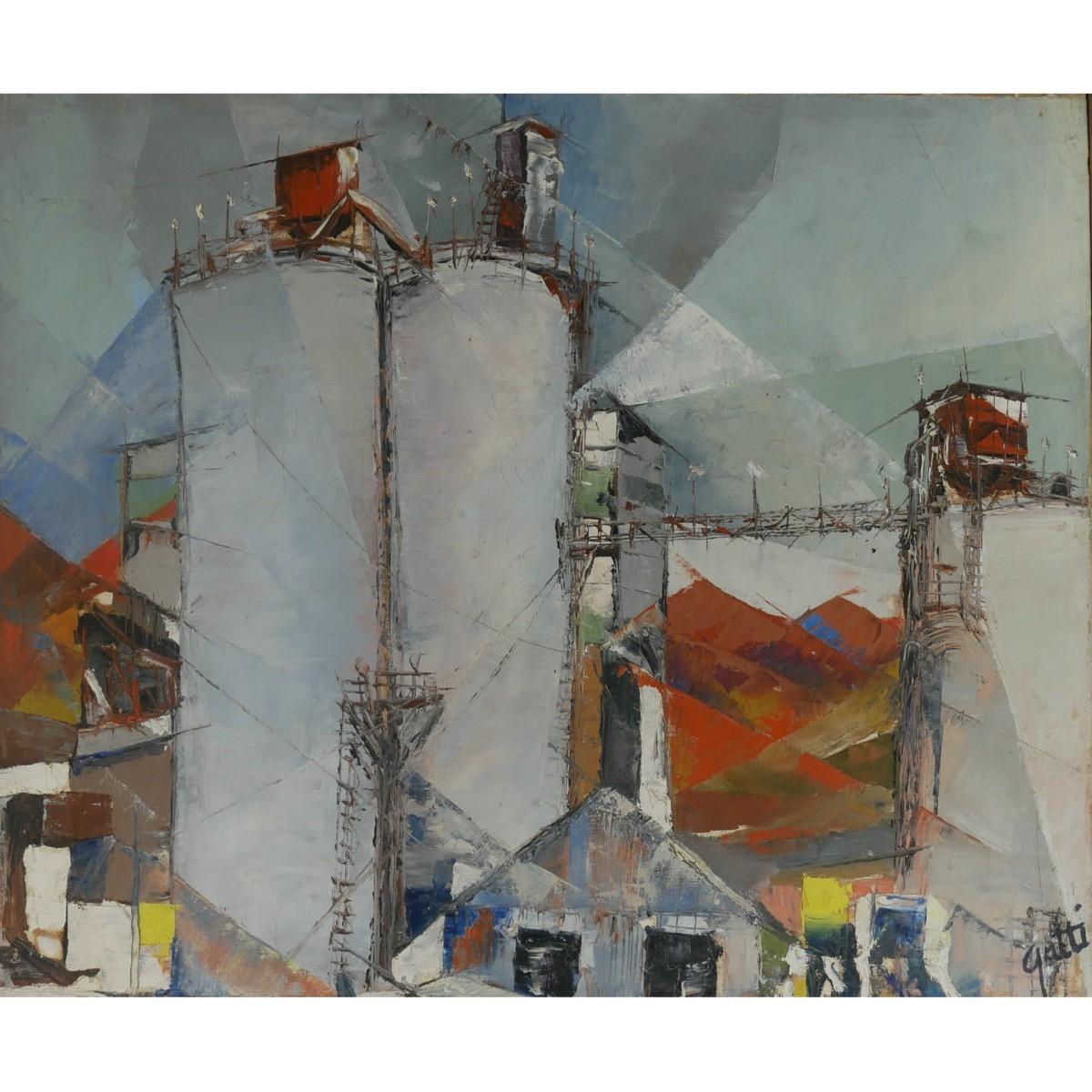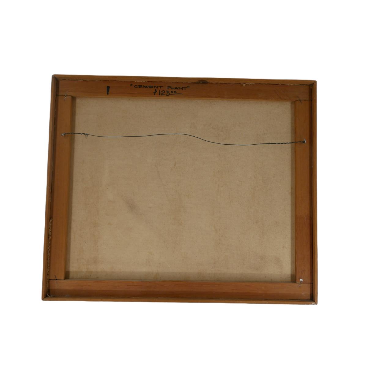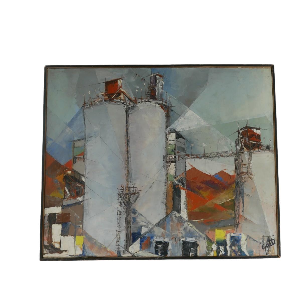 Original oil on canvas painting of a cement plant by artist Gatti, signed on lower right. Framed with wood and has wire to hang. Art measures 29.5" x 24.5", total frame measures 30.5" x 25.5". Art has wear and cracking in some areas, please see photos. Overall good condition. (A58)