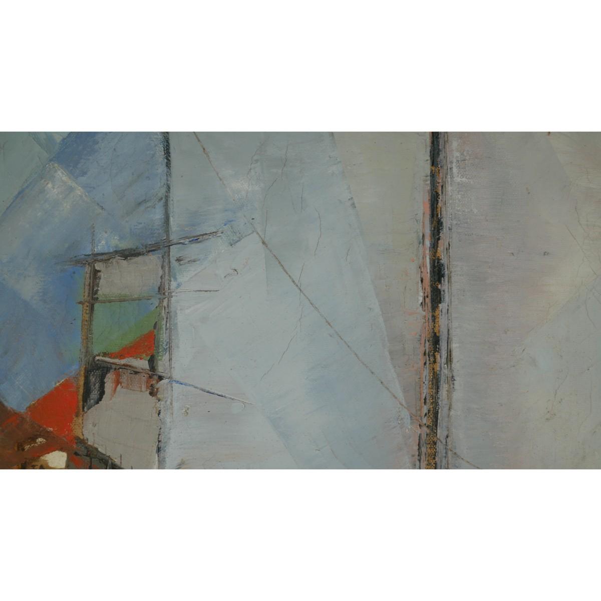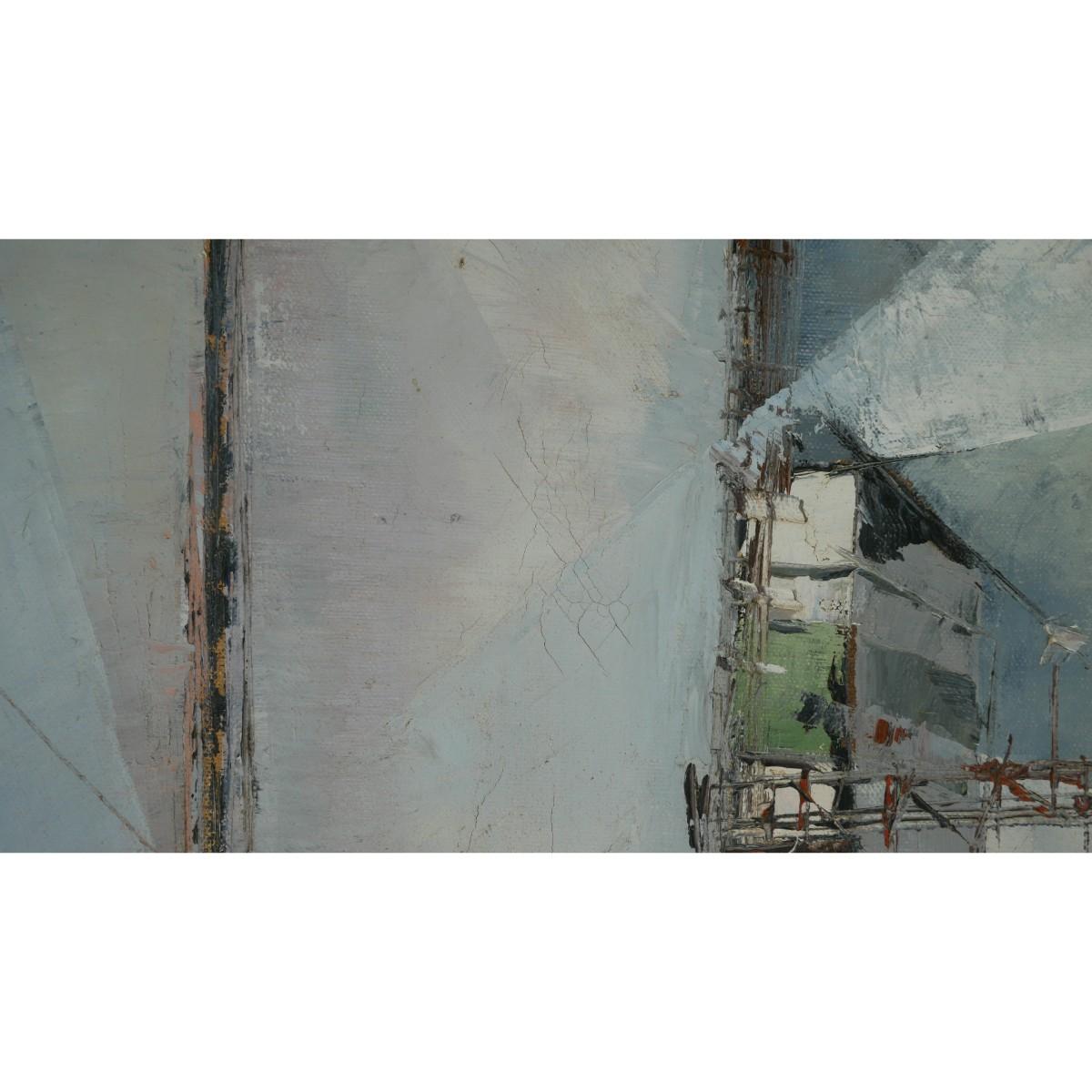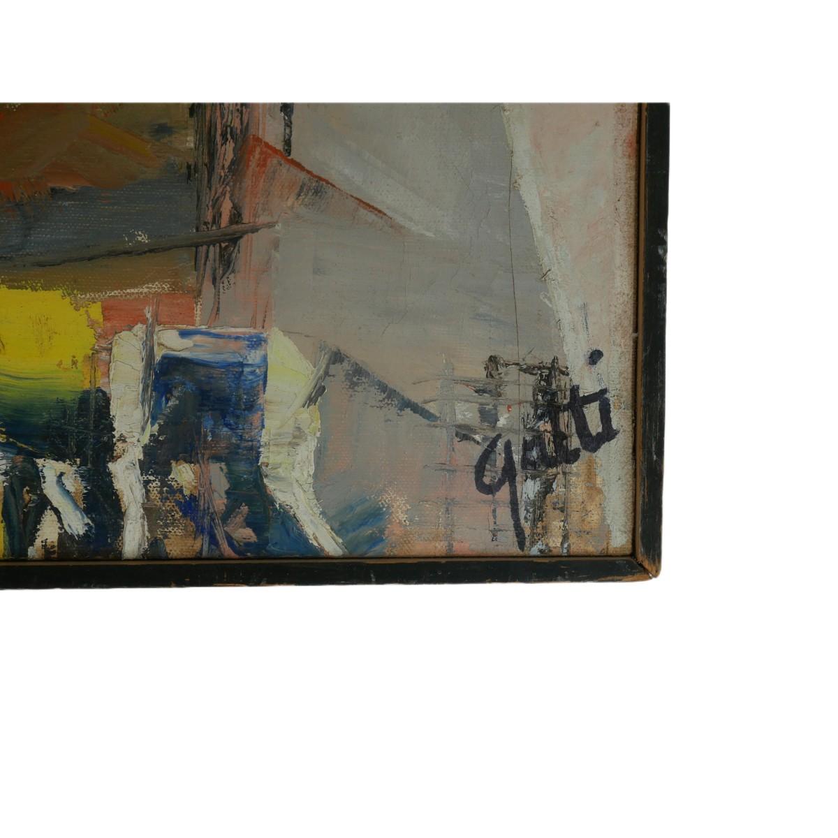 Original oil on canvas painting of a cement plant by artist Gatti, signed on lower right. Framed with wood and has wire to hang. Art measures 29.5" x 24.5", total frame measures 30.5" x 25.5". Art has wear and cracking in some areas, please see photos. Overall good condition. (A58)